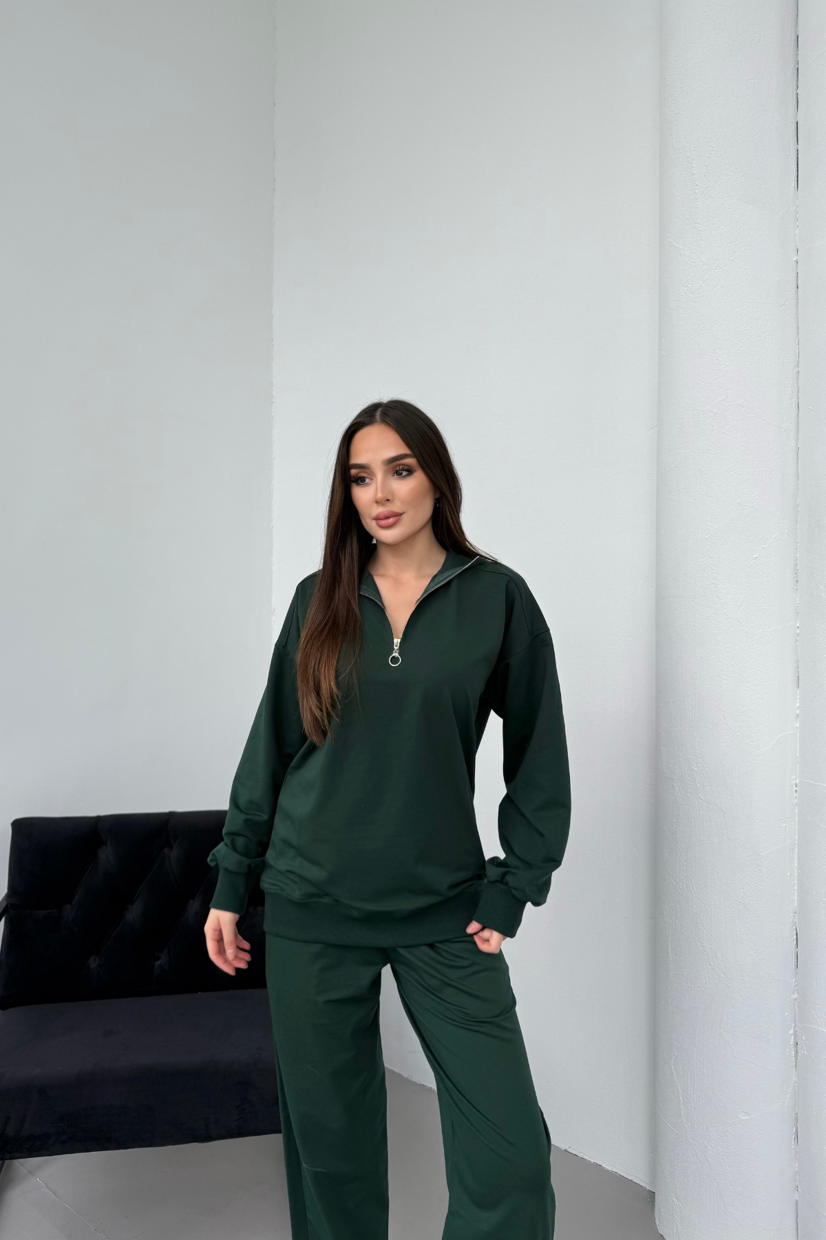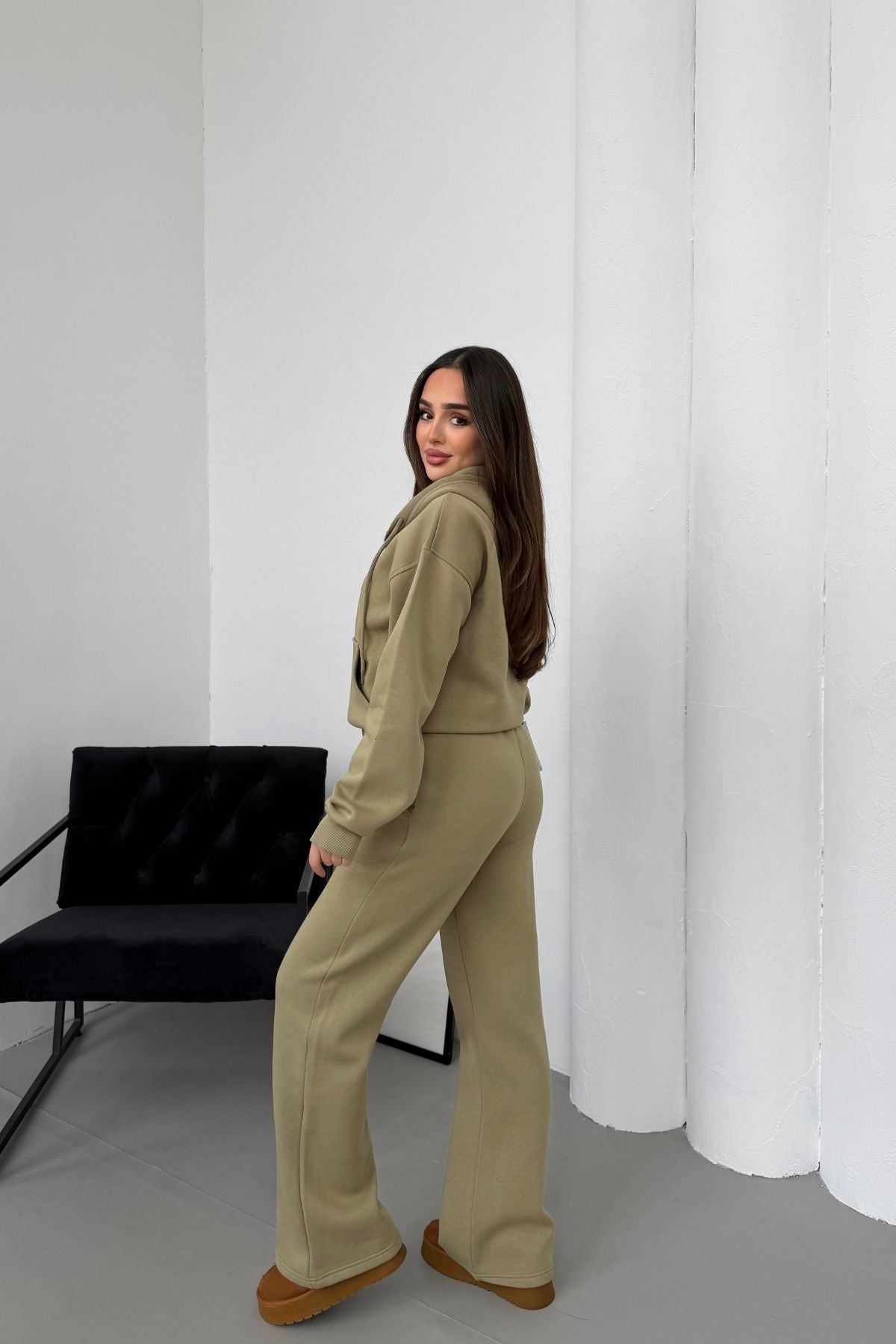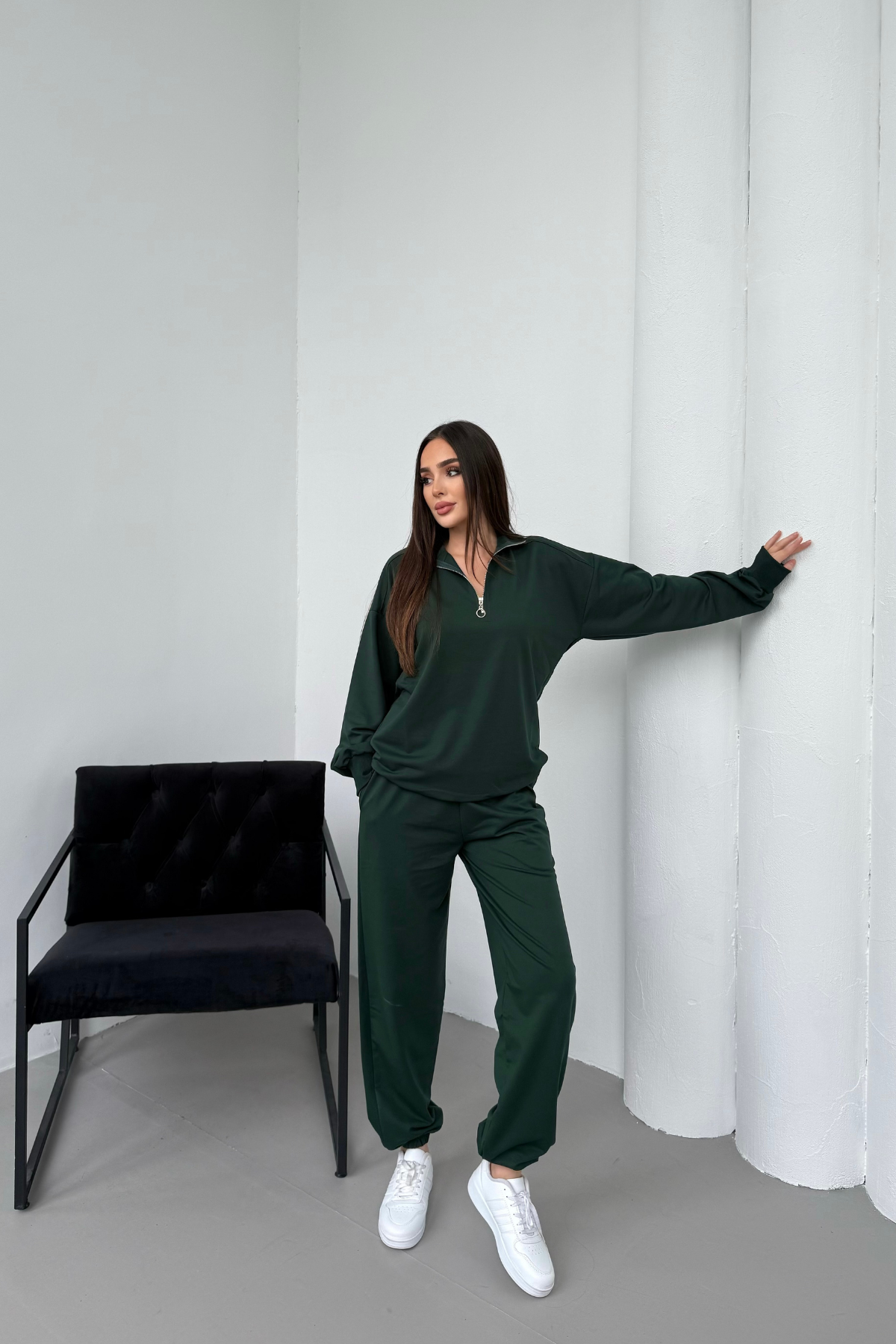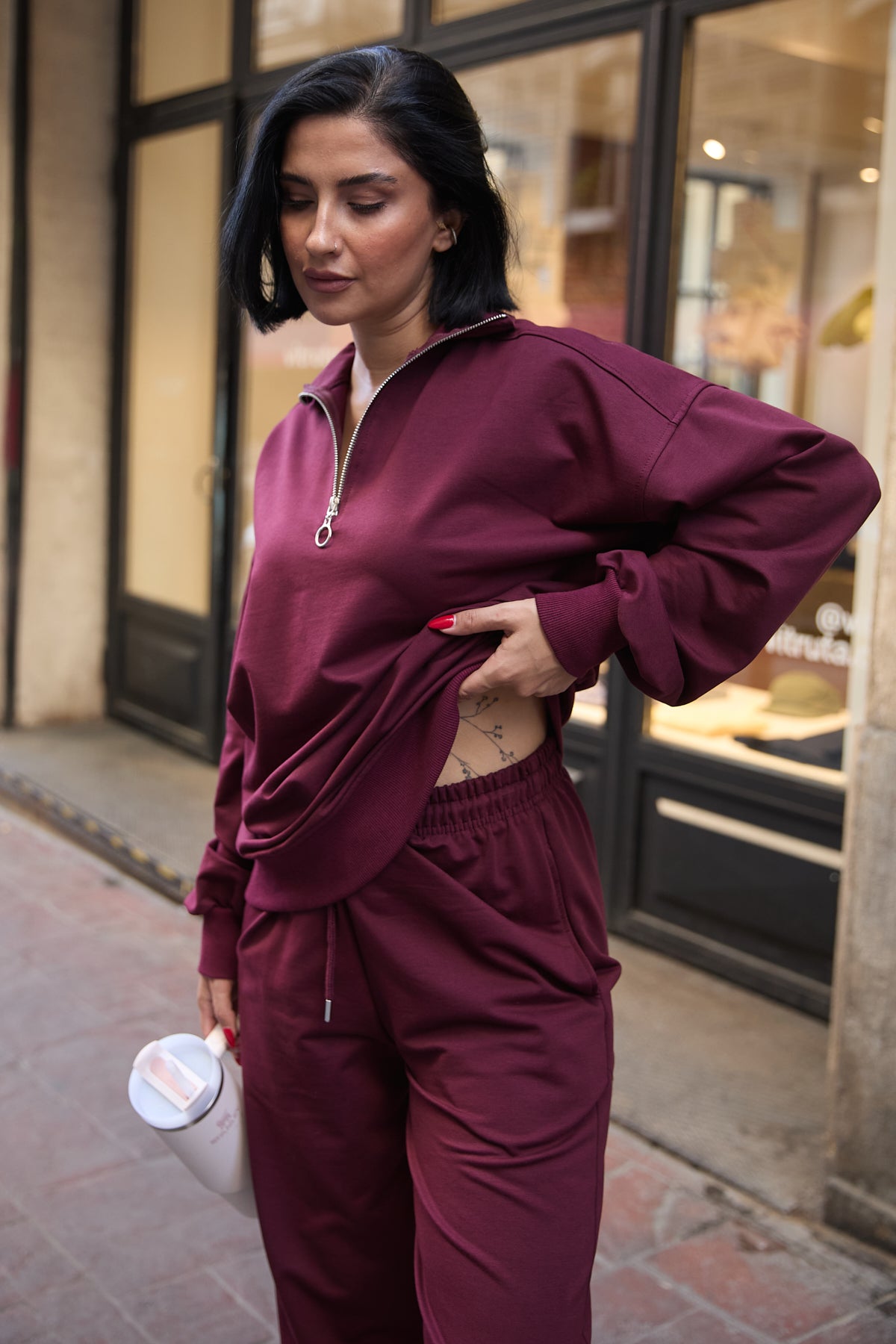 Kadın Yarım Fermuarlı Sweatshırt Ve Paçası Lastikli Kahverengi Eşofman Takımı