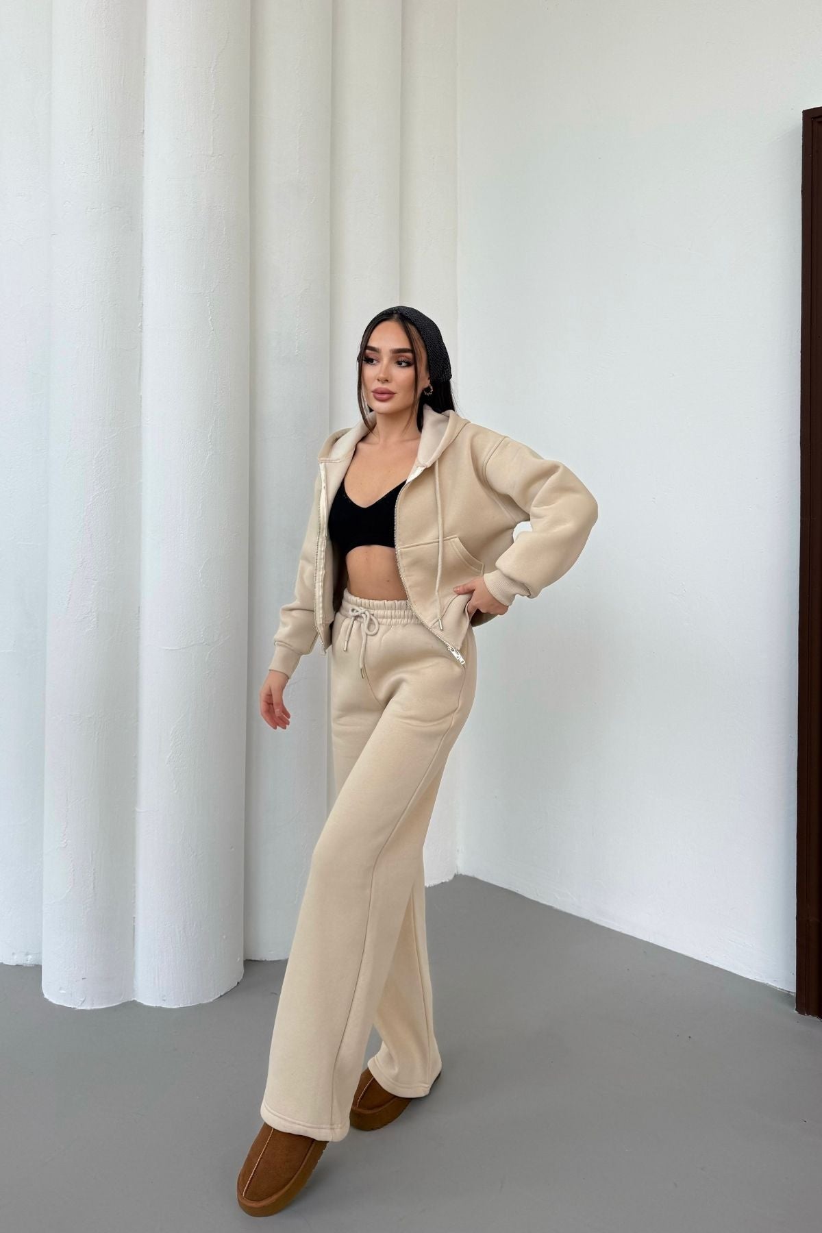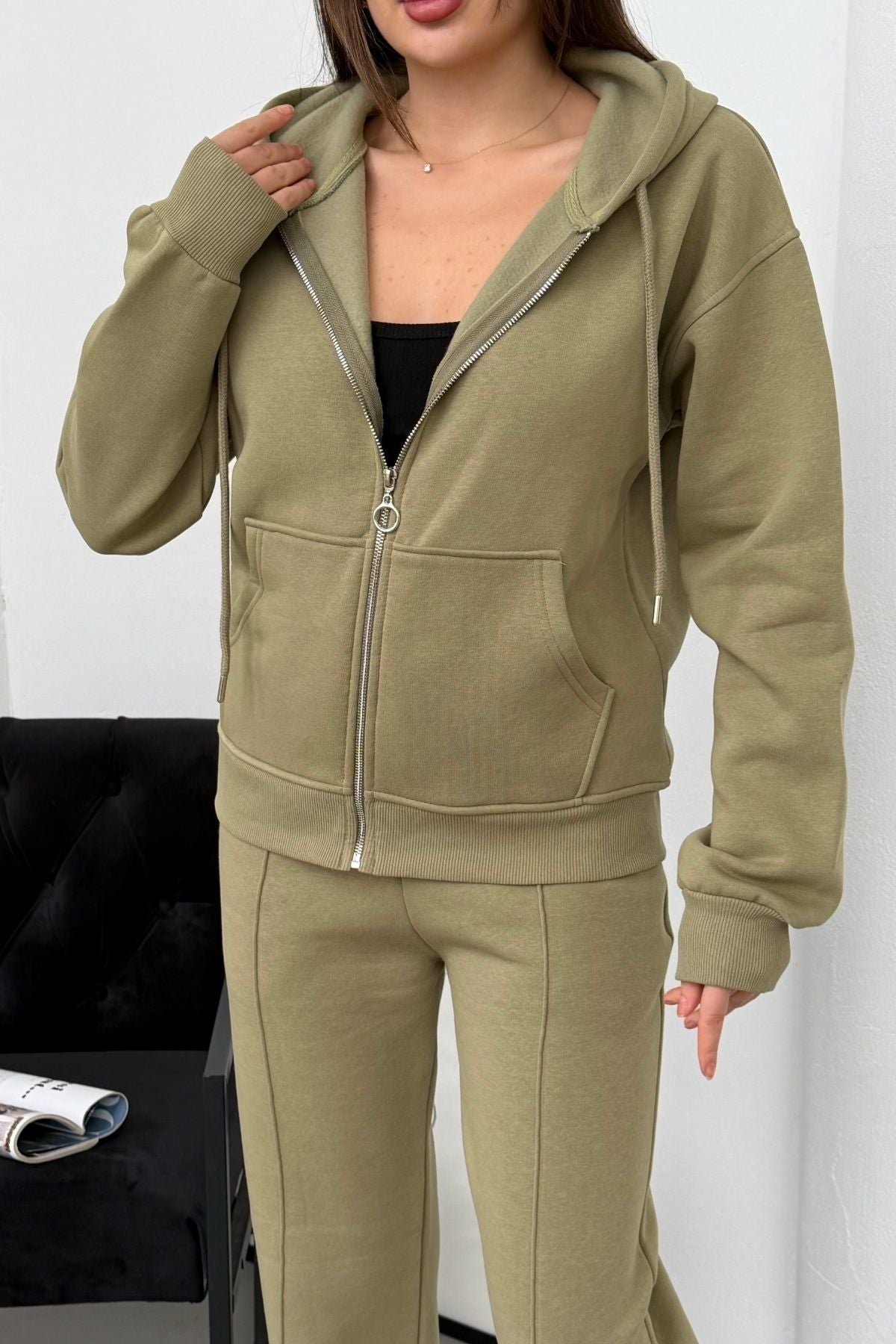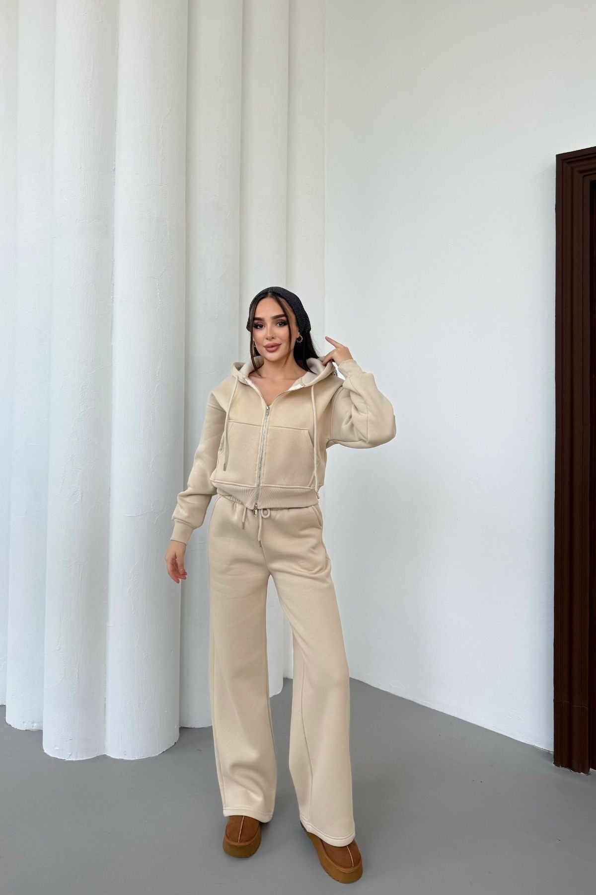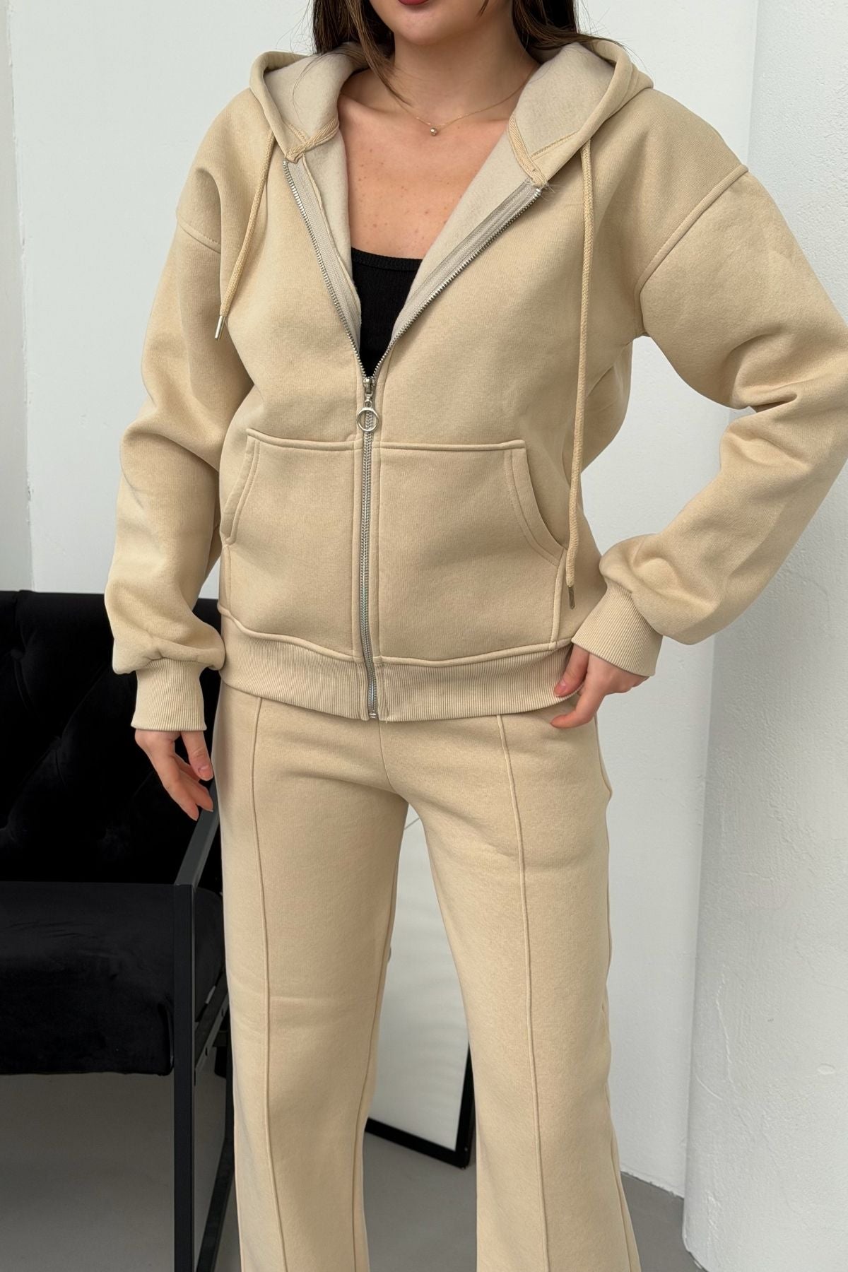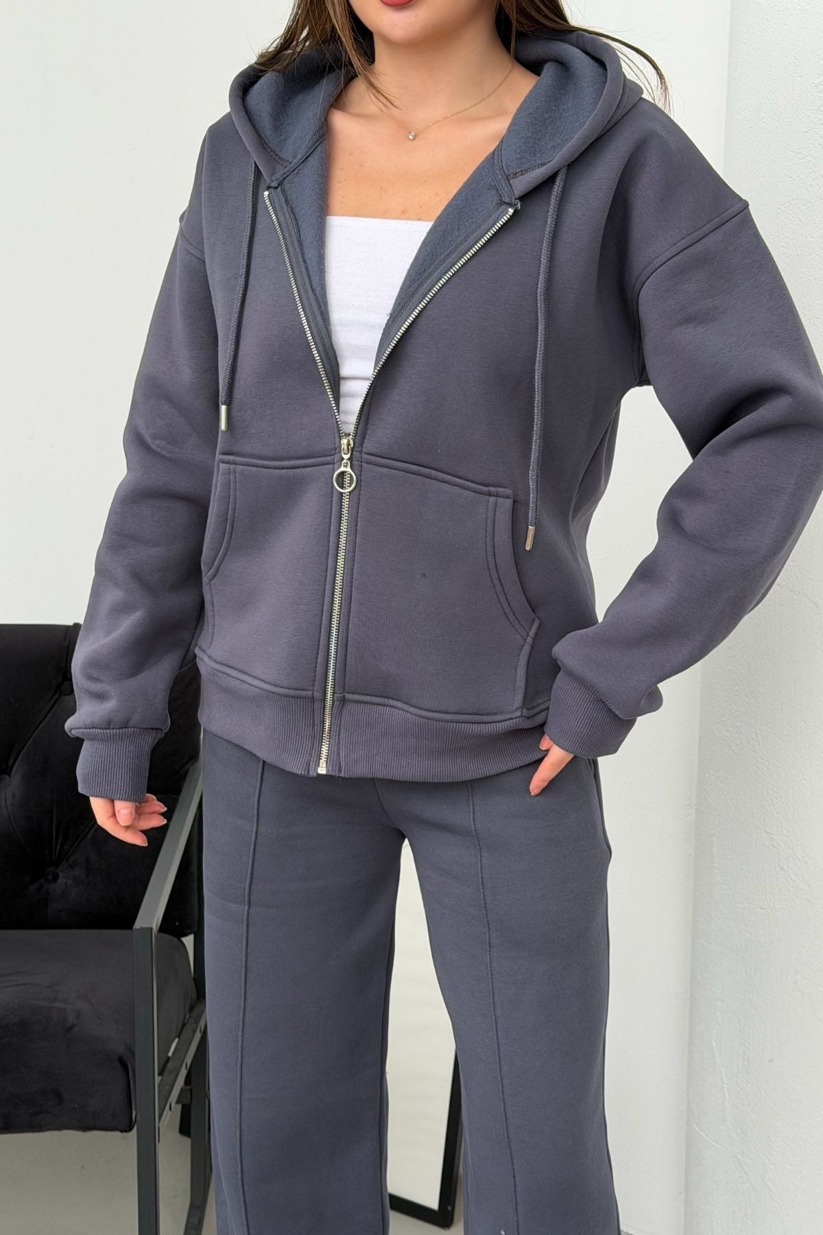 Kadın Çift Fermuar Detaylı Kapüşonlu Kışlık Şardonlu Oversize Eşofman Takımı