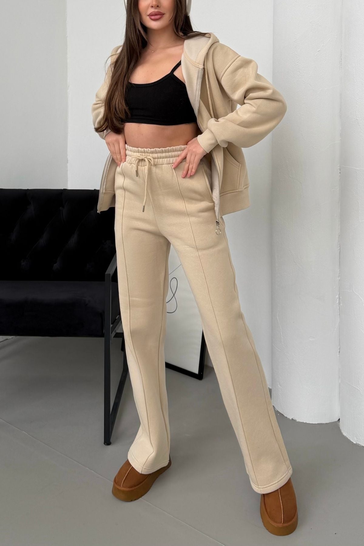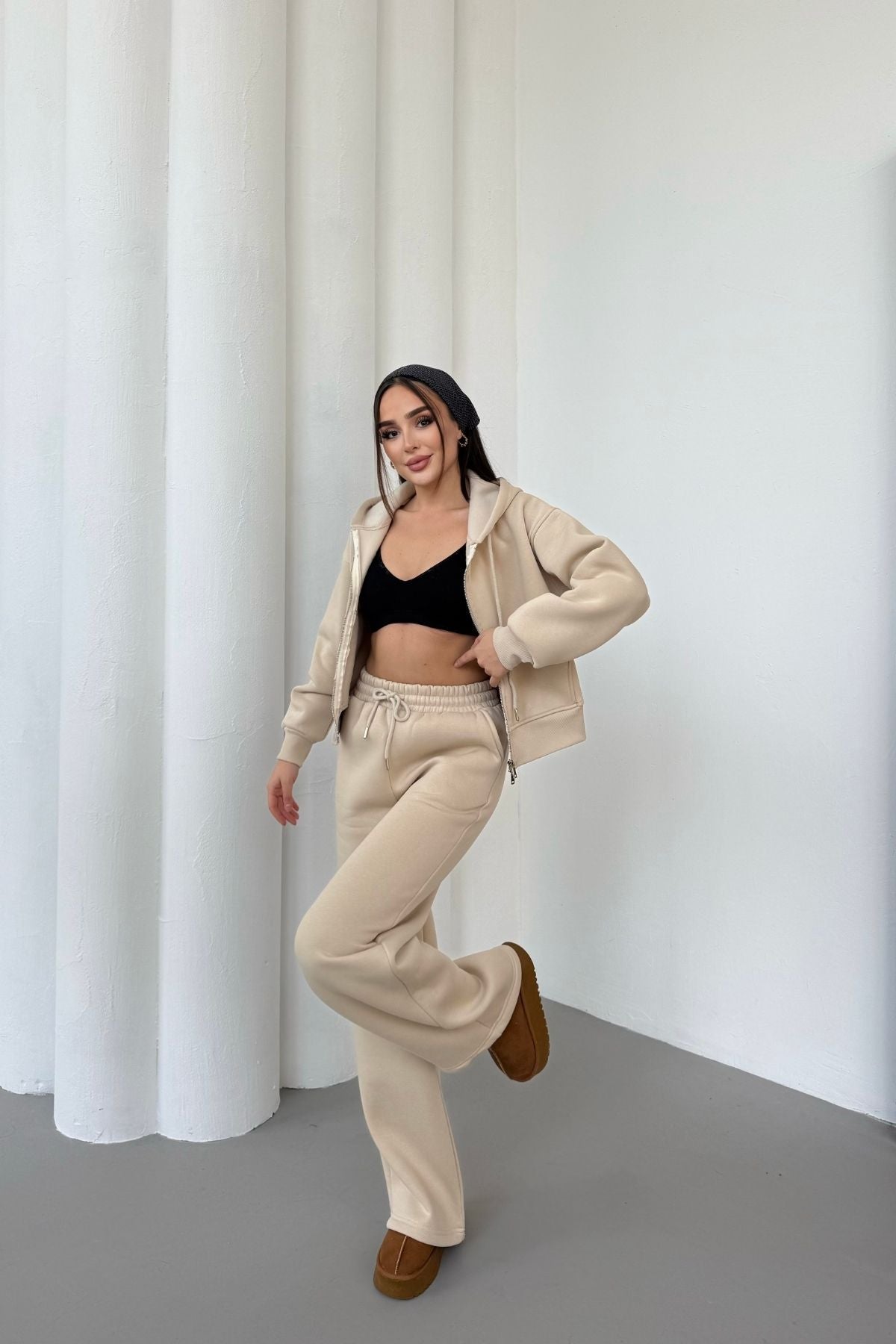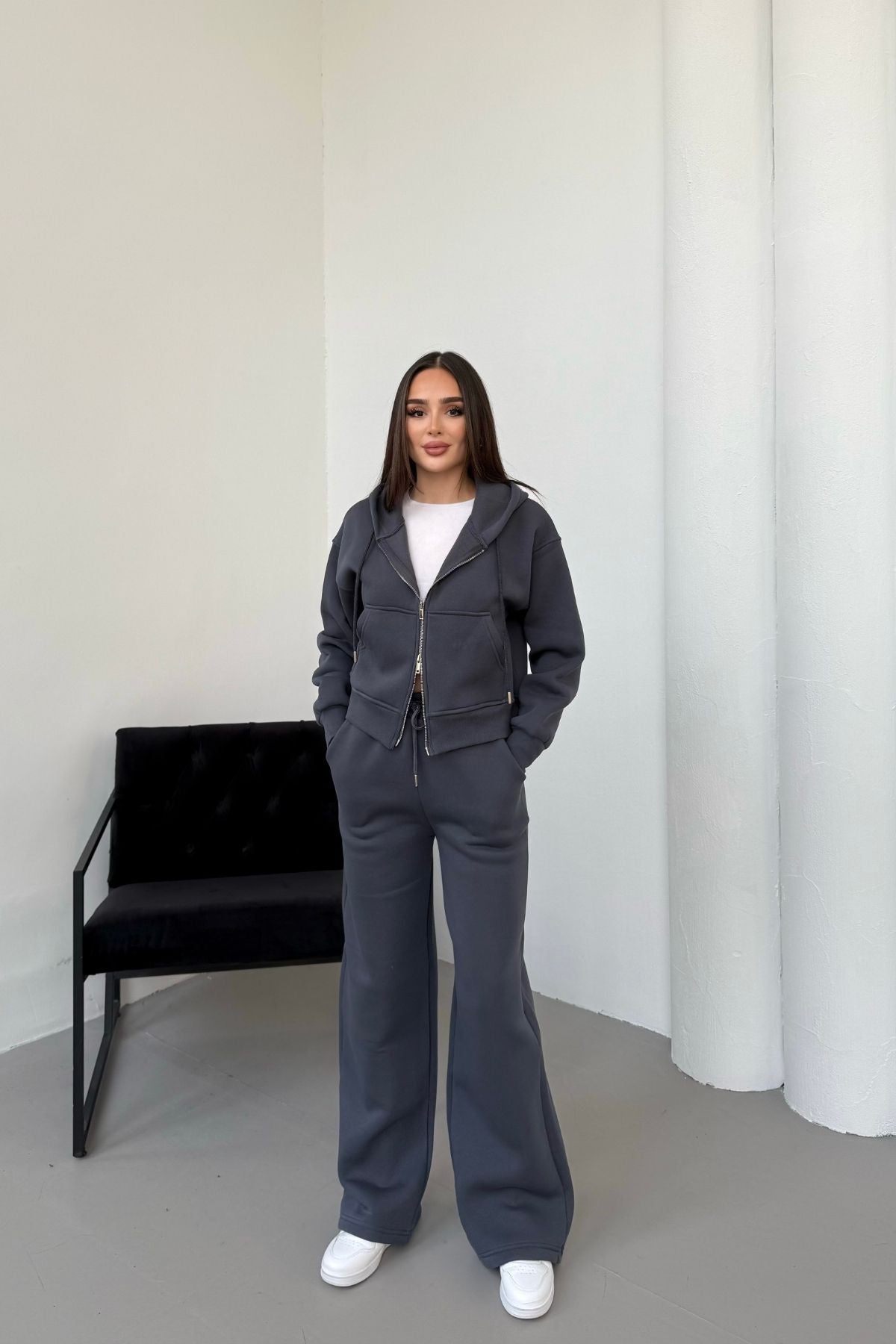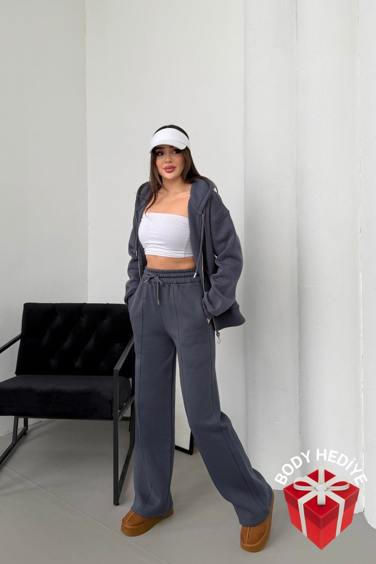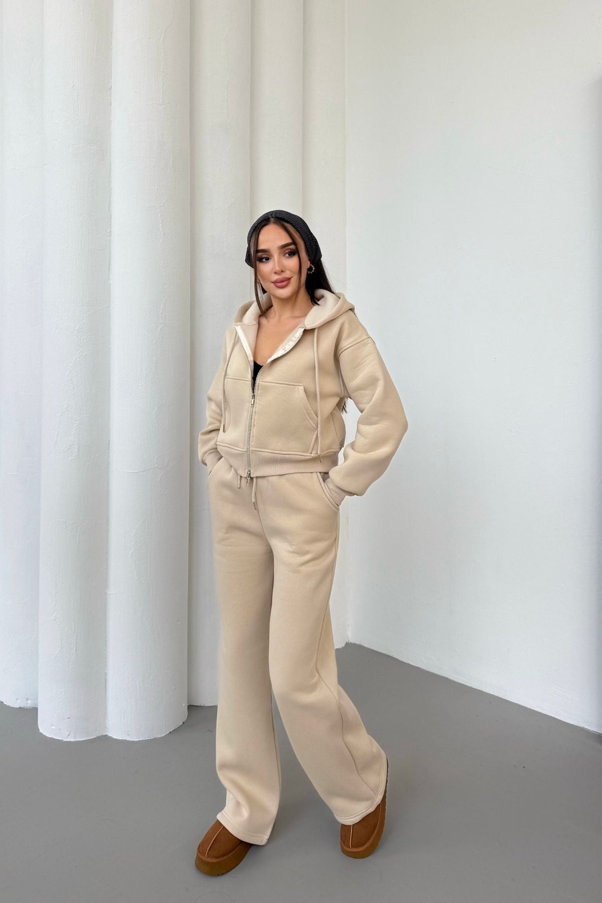 Kadın Çift Fermuar Detaylı Kapüşonlu Kışlık Şardonlu Oversize Eşofman Takımı