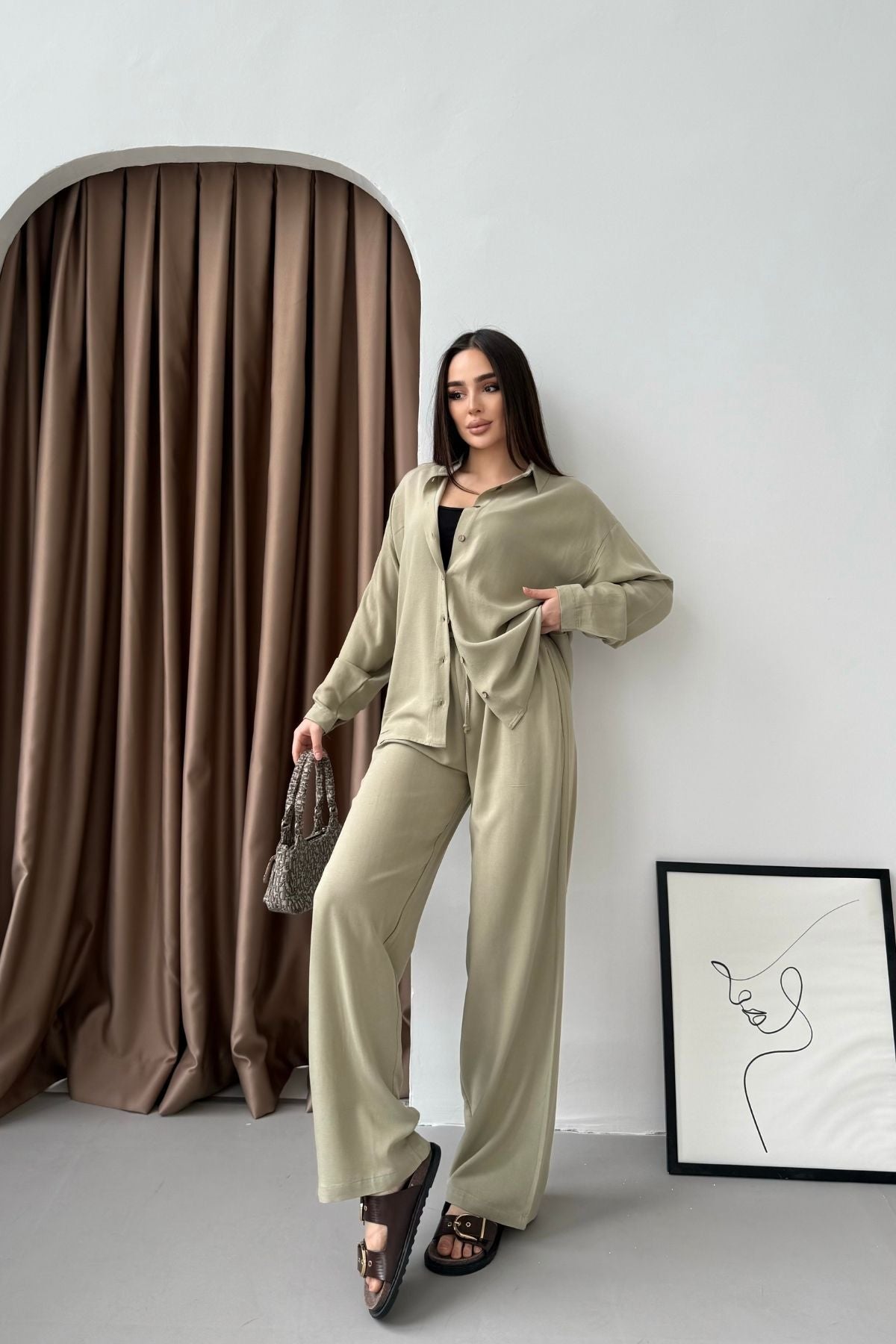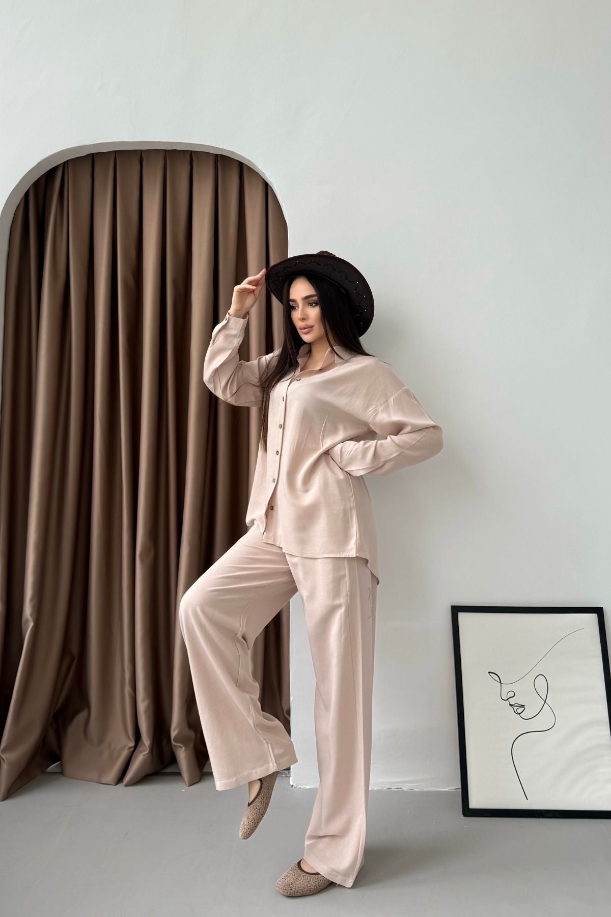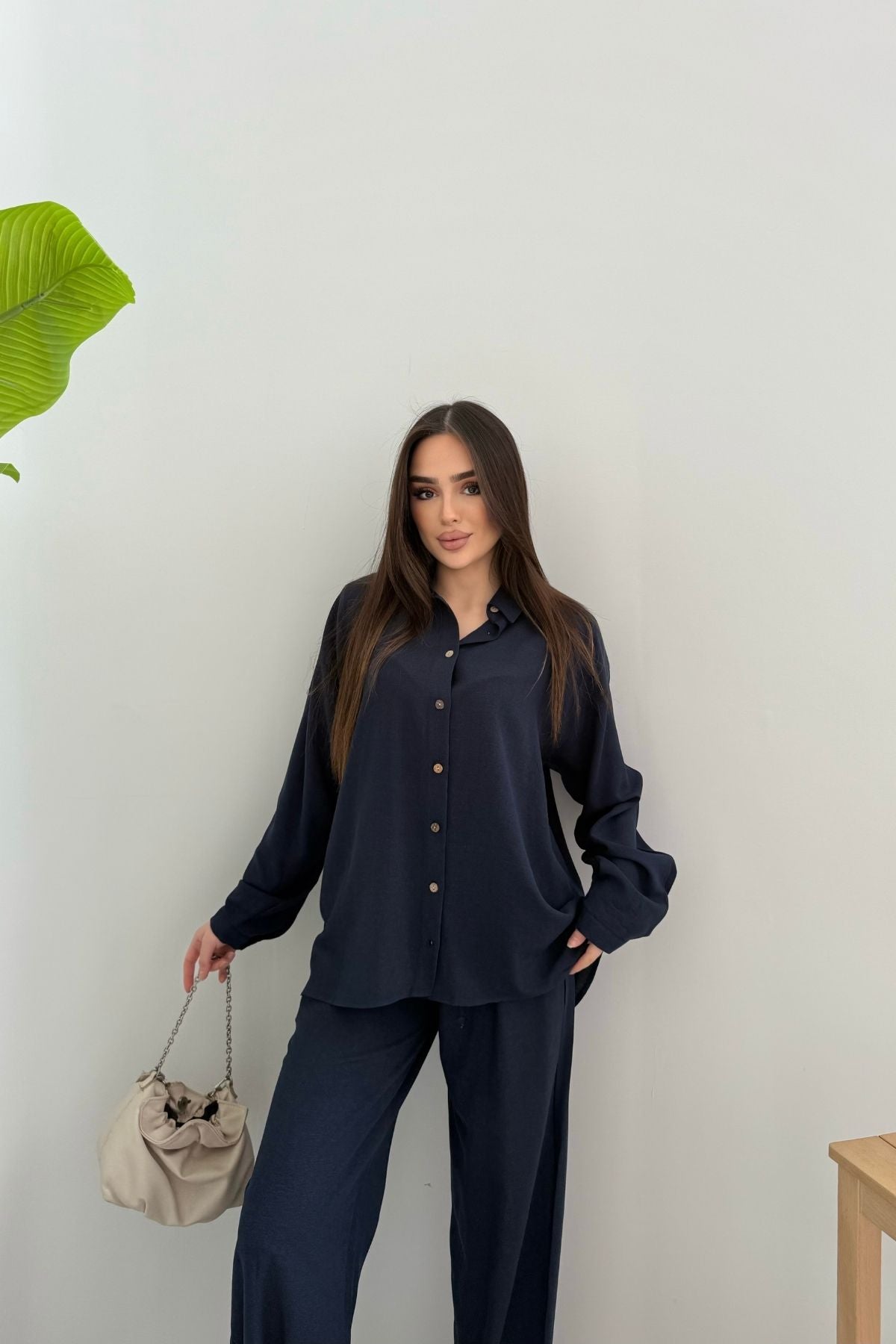 Kadın İkili Rahat Kesim Keten Gömlek Pantolon Alt Üst Takım