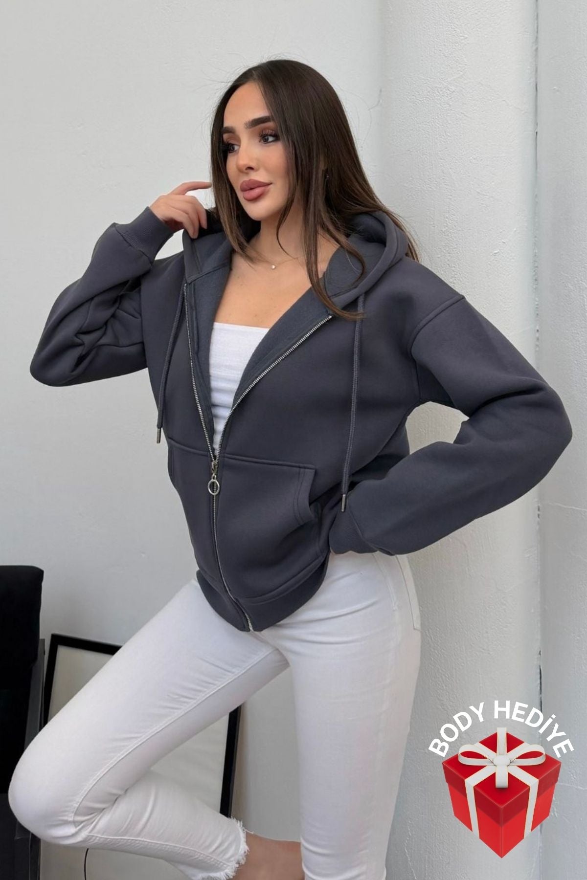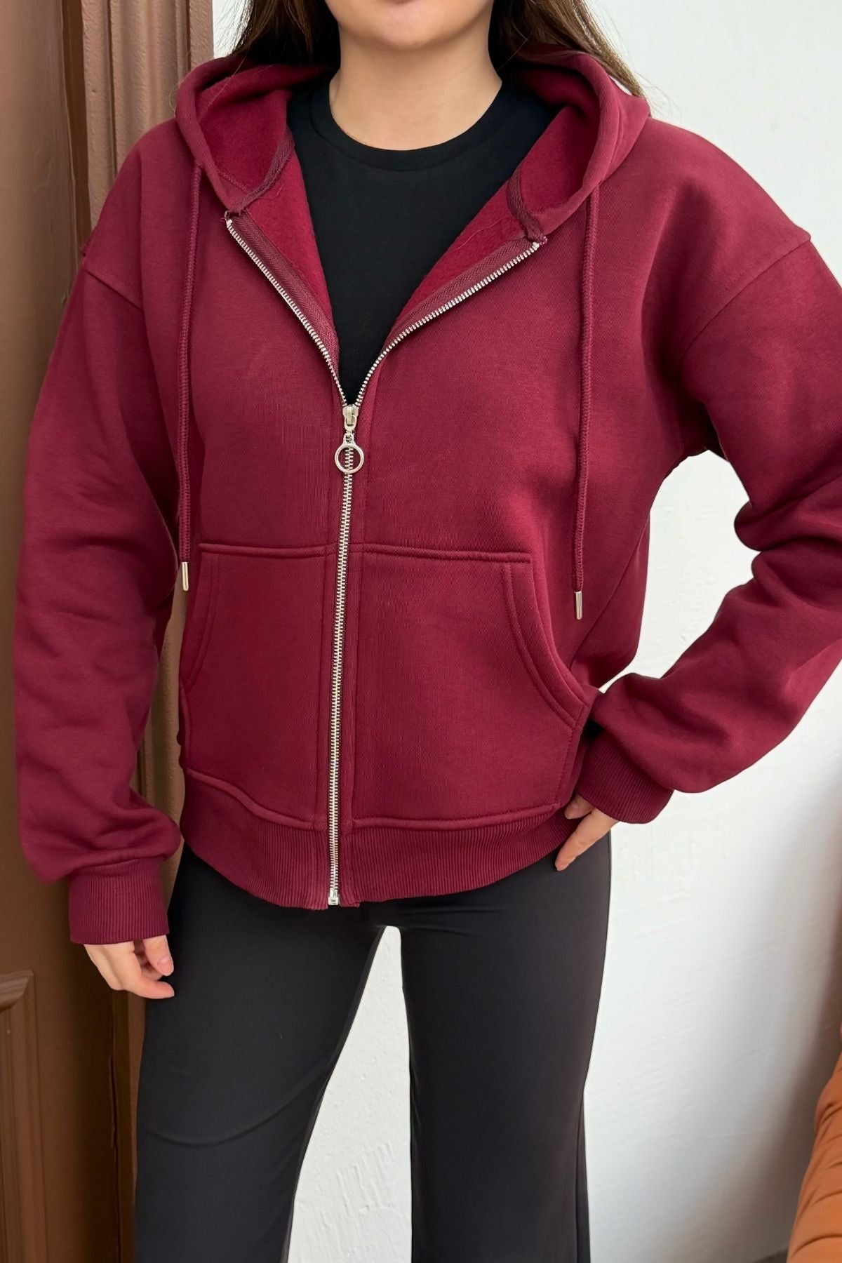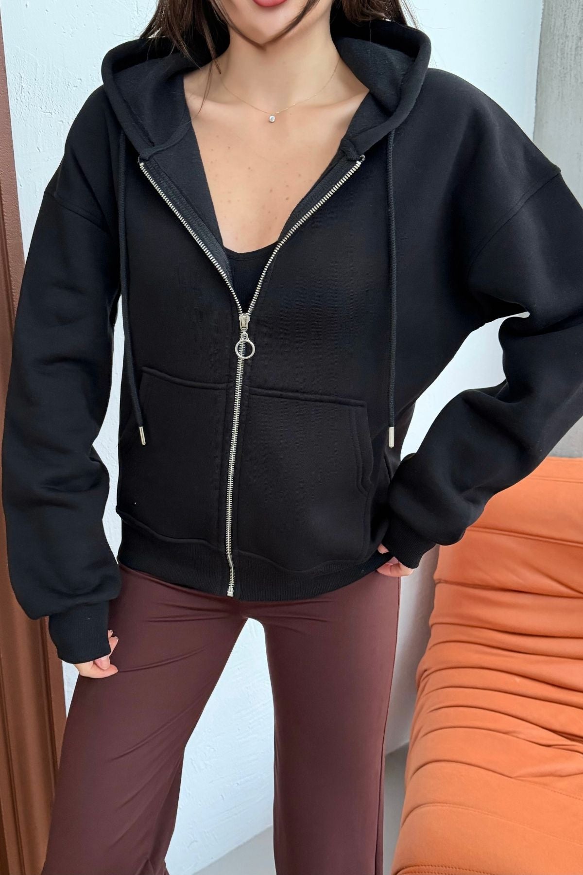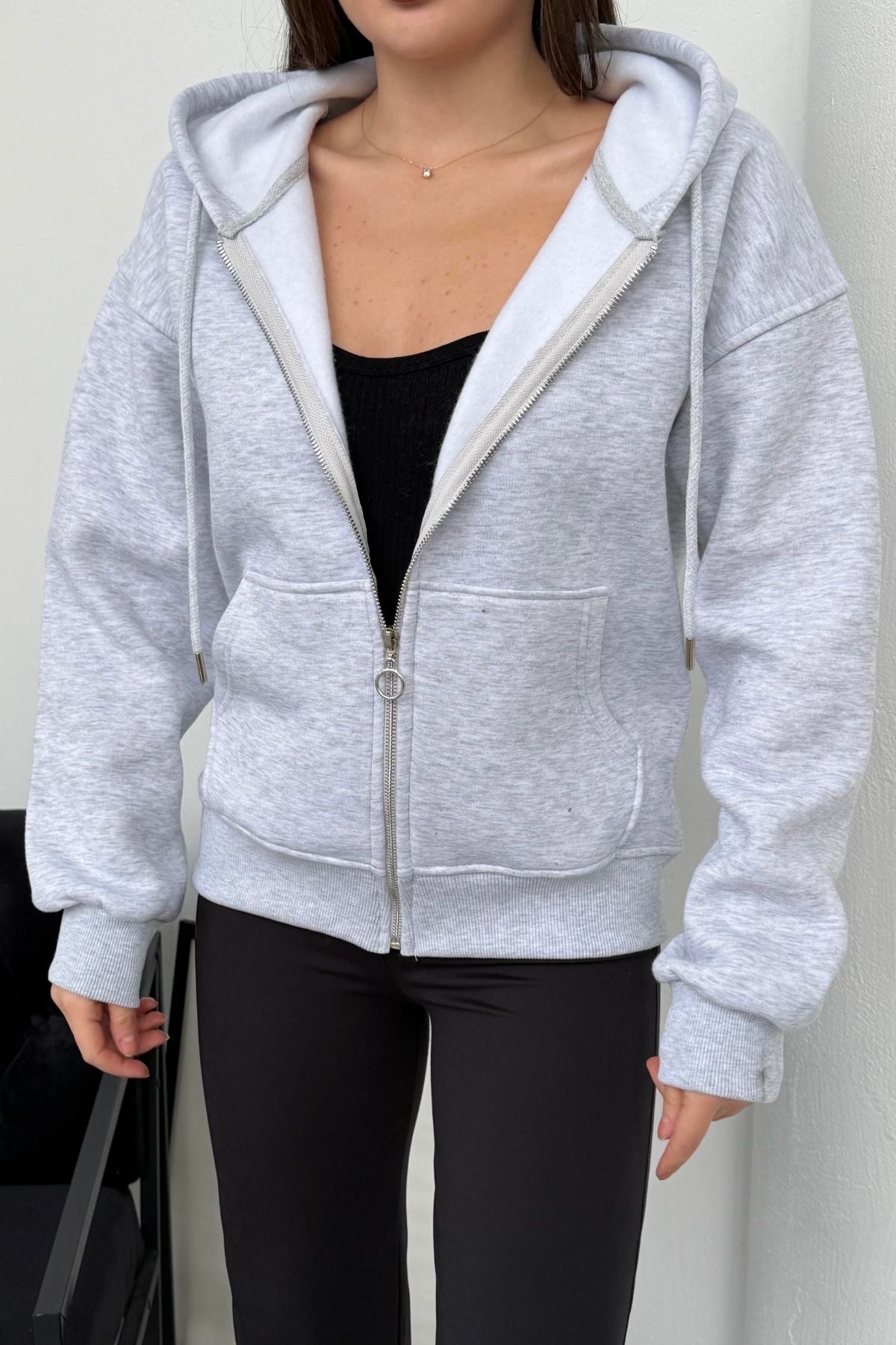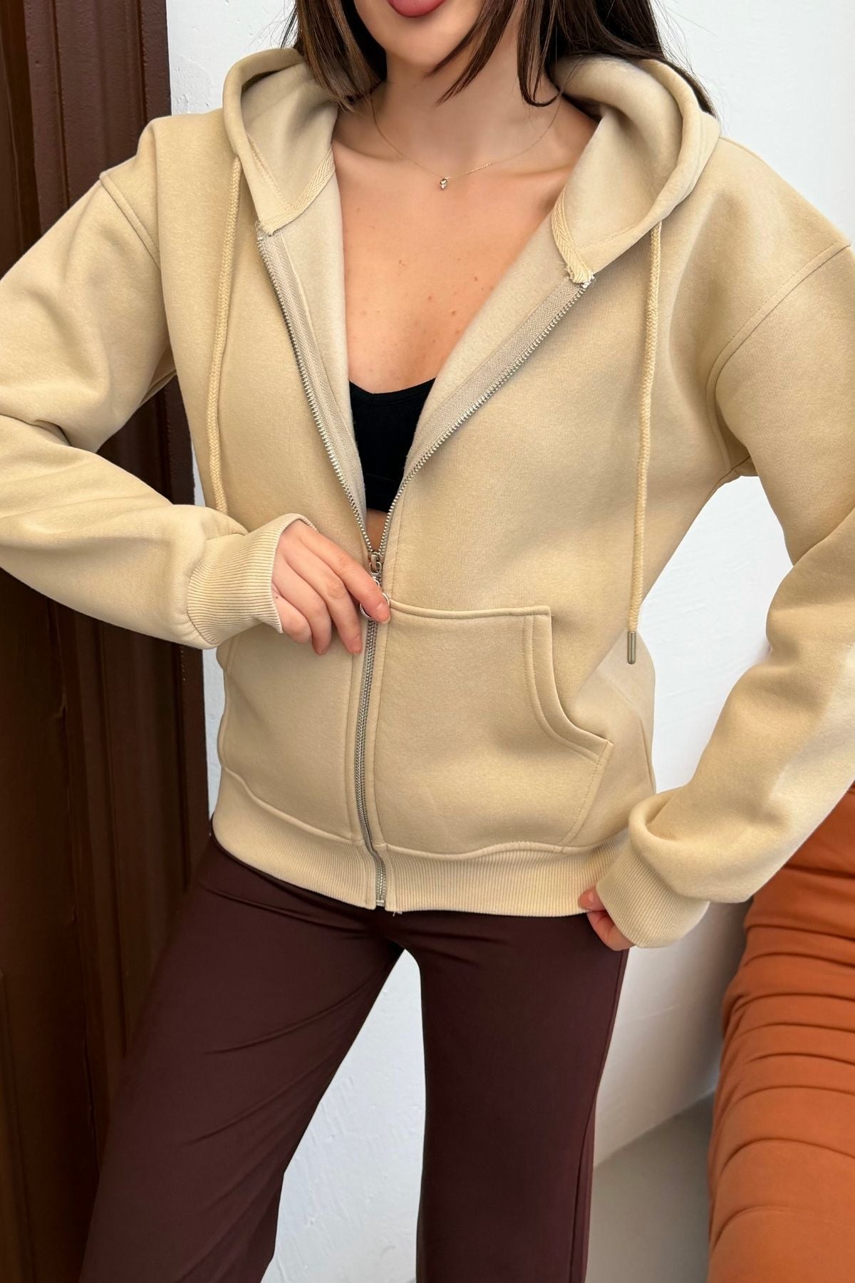 Kadın Kapüşonlu Bağcıklı Sweatshirt Fermuarlı 3 İplik Şardonlu Rahat Kesim