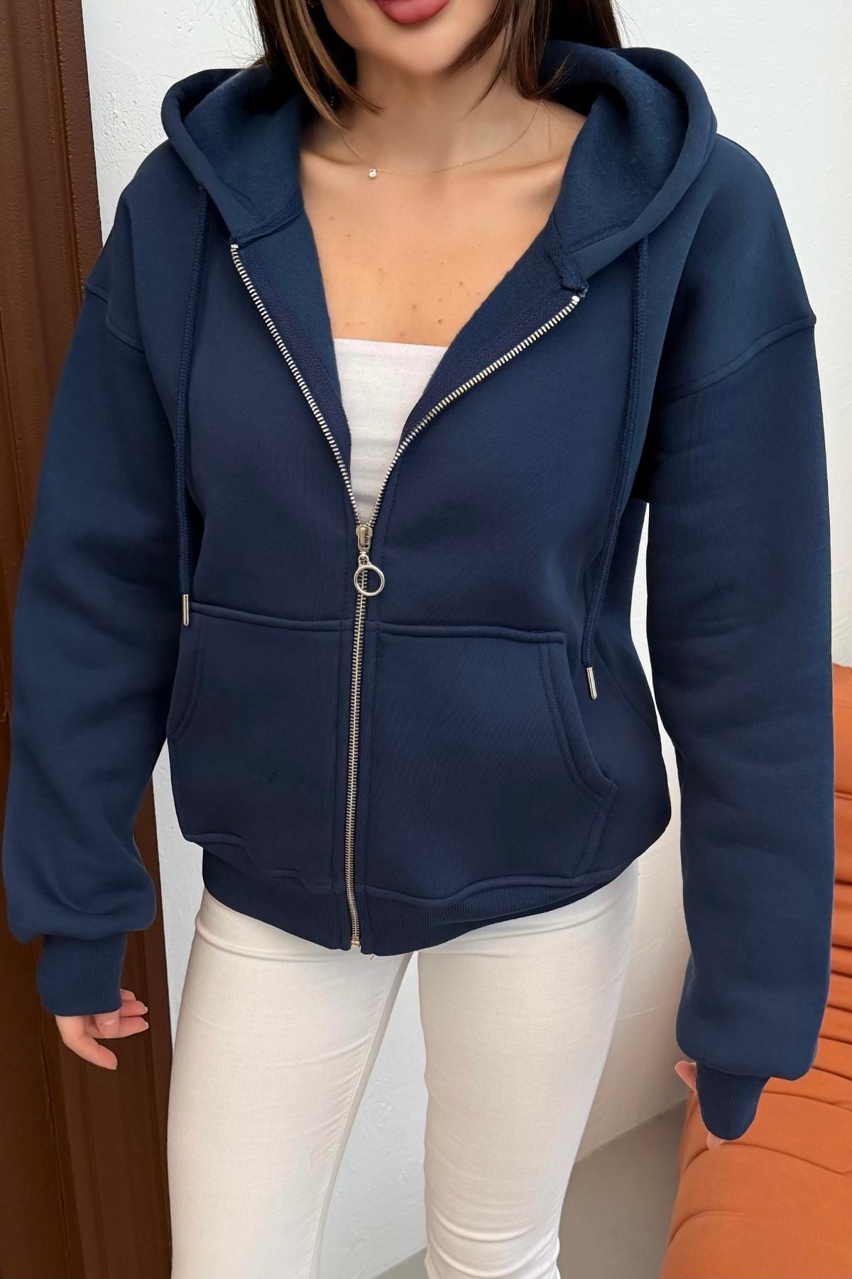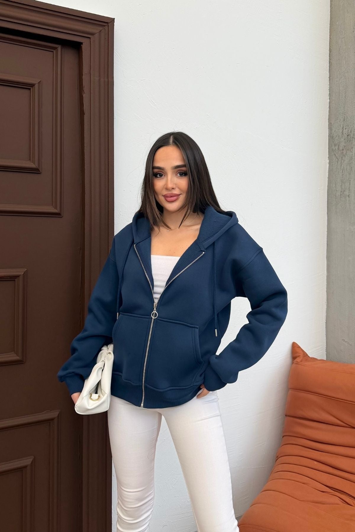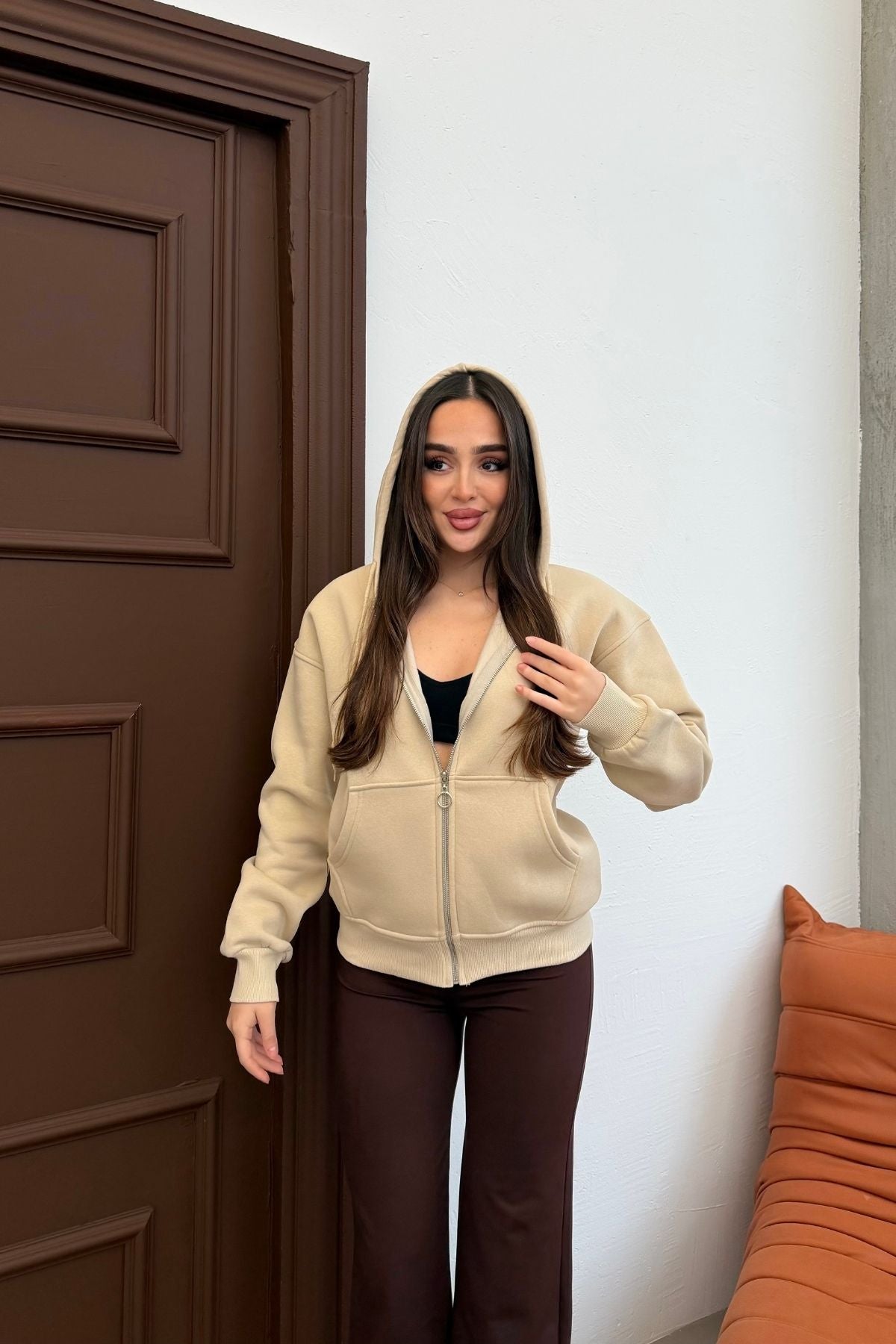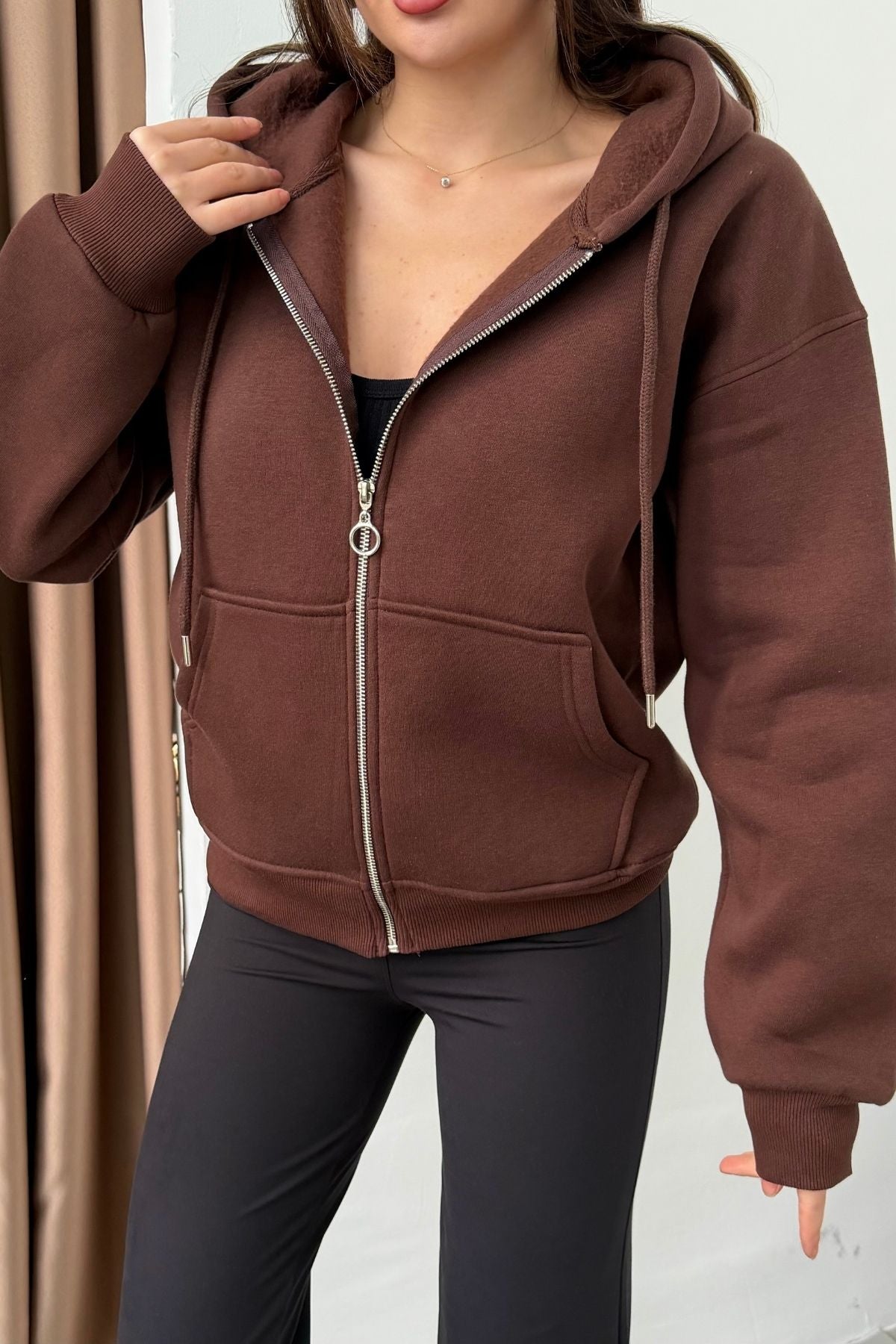 Kadın Kapüşonlu Bağcıklı Sweatshirt Fermuarlı 3 İplik Şardonlu Rahat Kesim