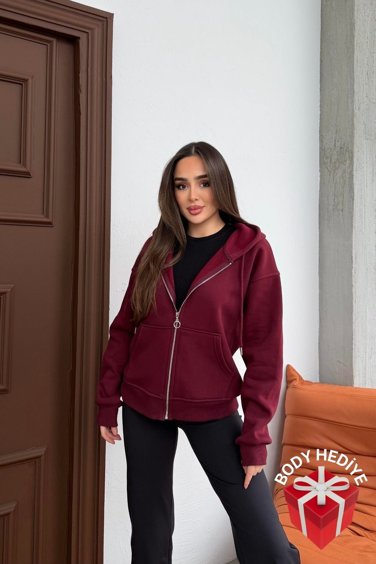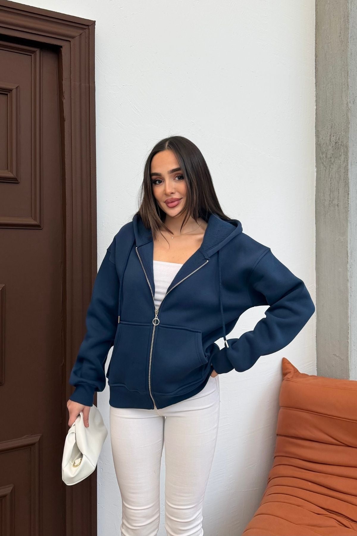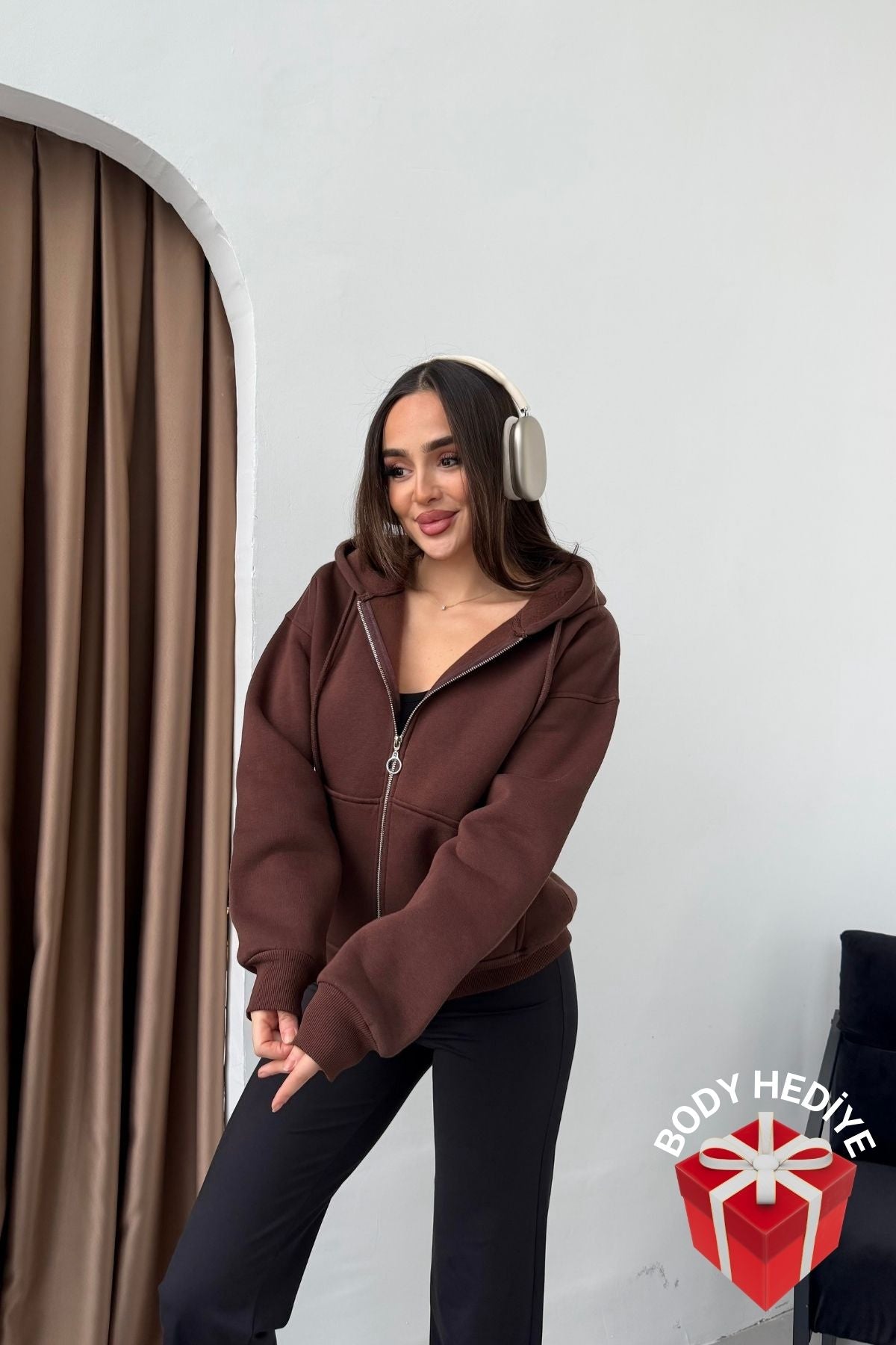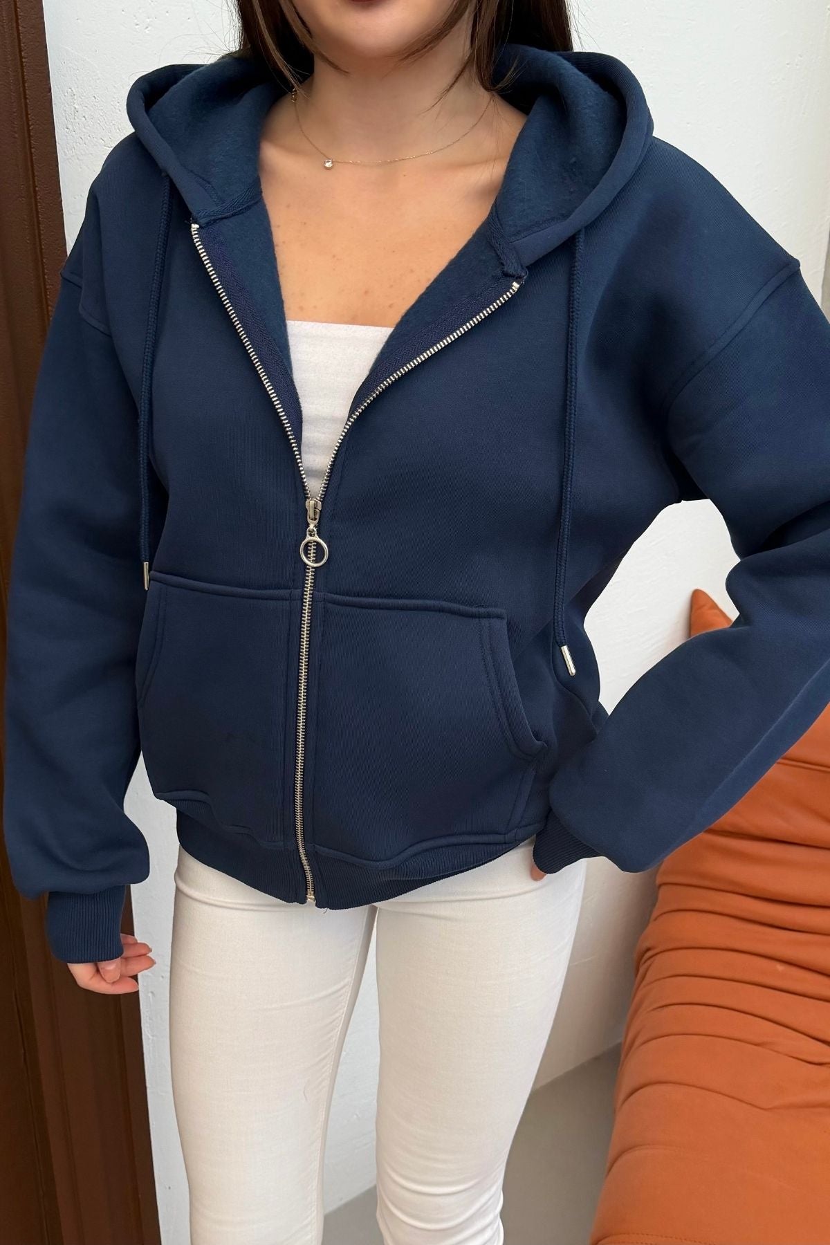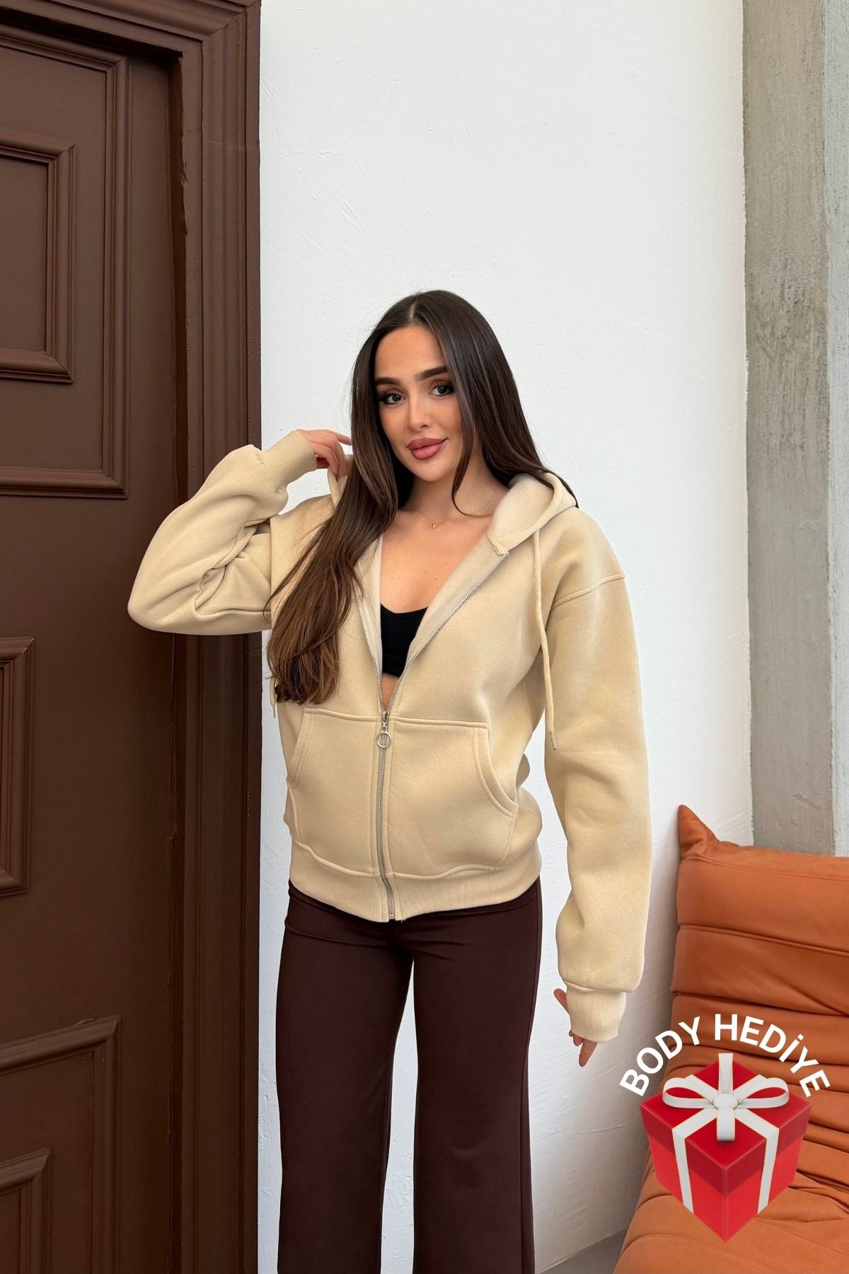 Kadın Kapüşonlu Bağcıklı Sweatshirt Fermuarlı 3 İplik Şardonlu Rahat Kesim