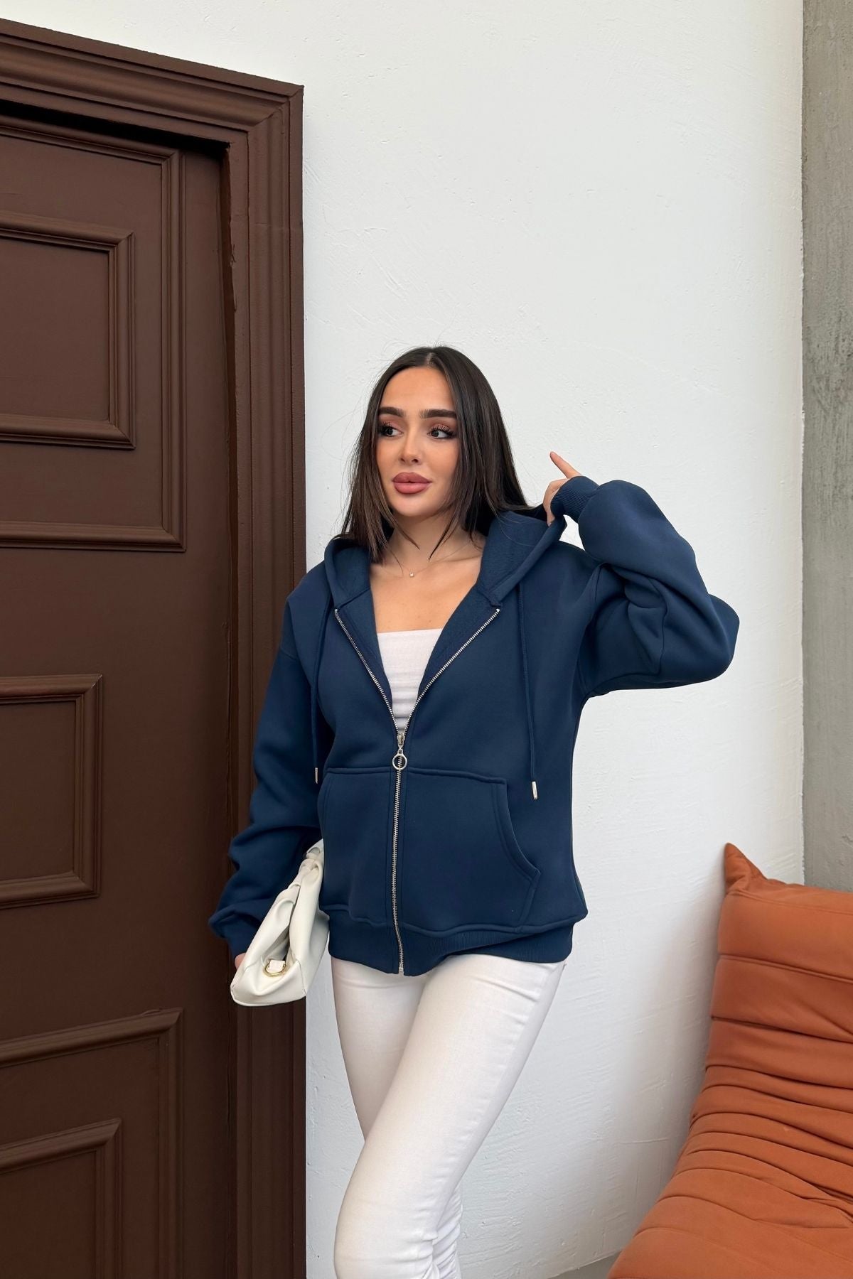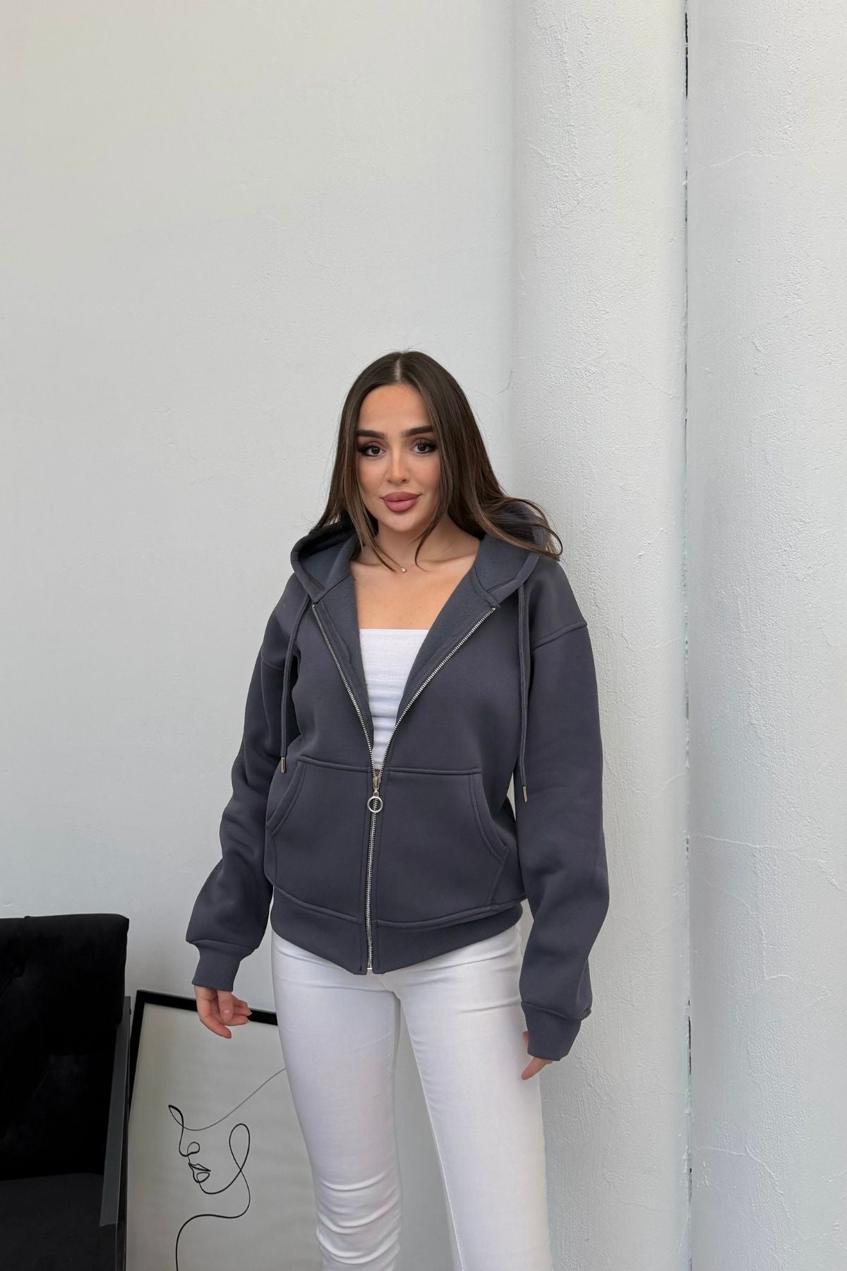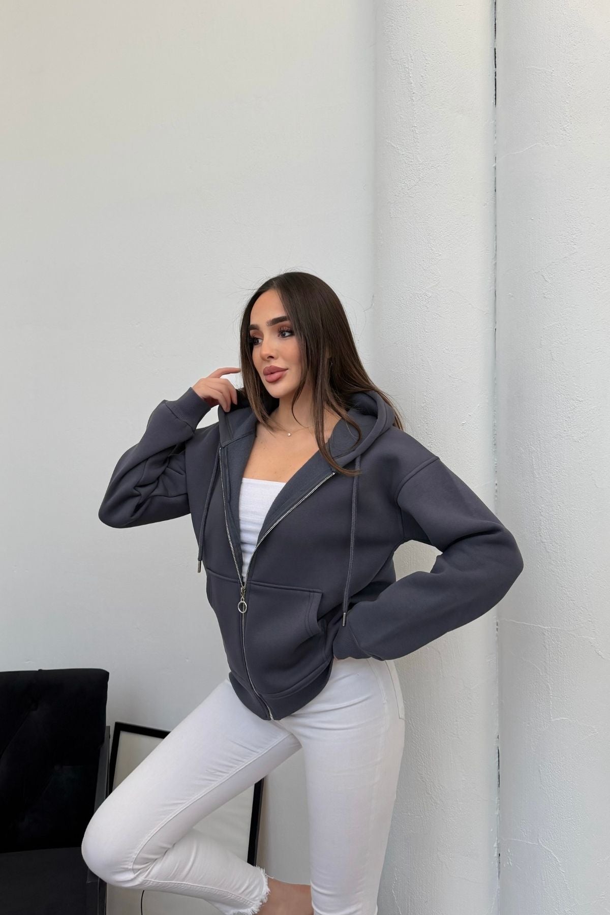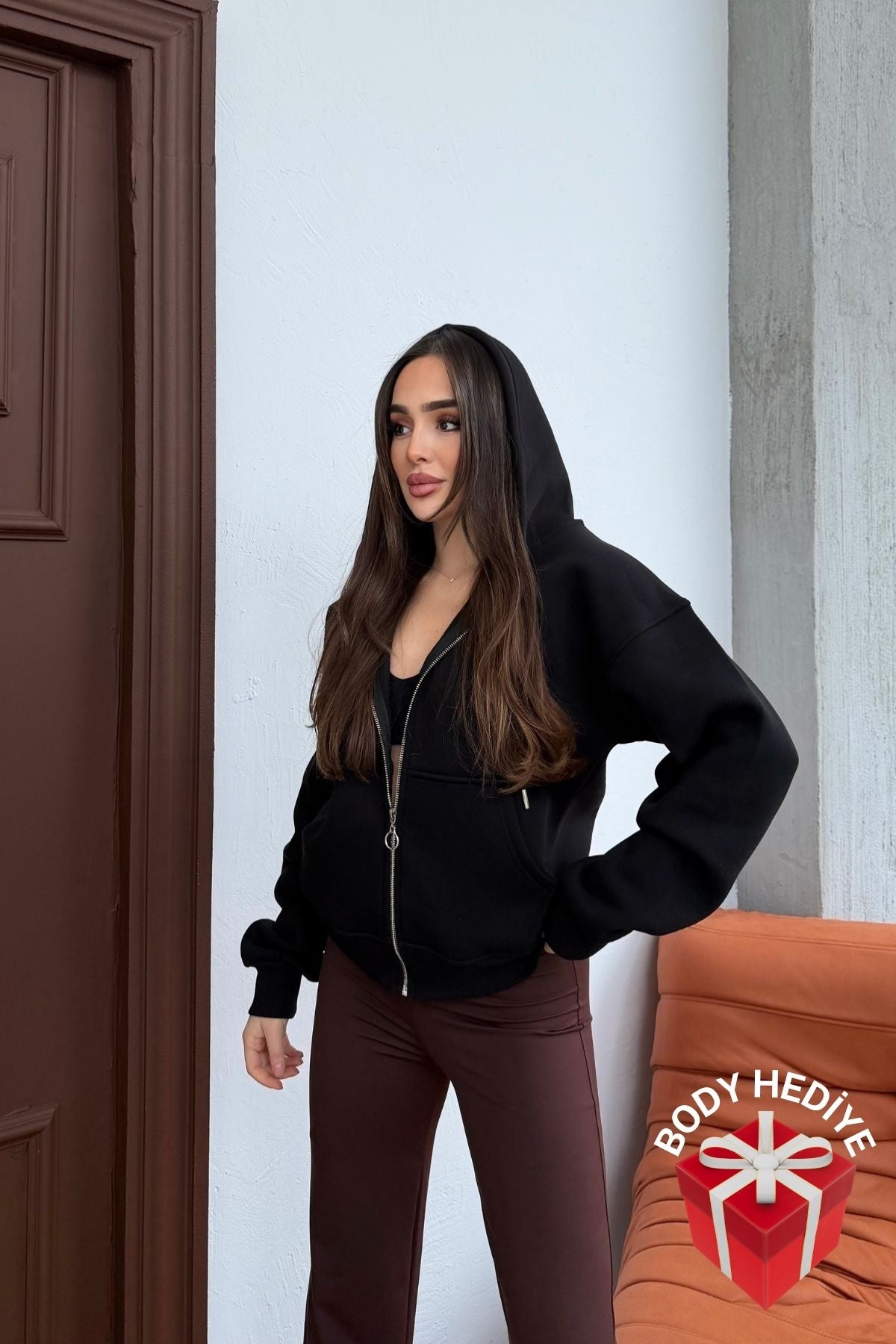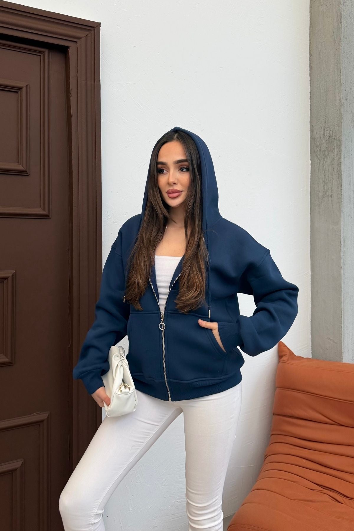 Kadın Kapüşonlu Bağcıklı Sweatshirt Fermuarlı 3 İplik Şardonlu Rahat Kesim