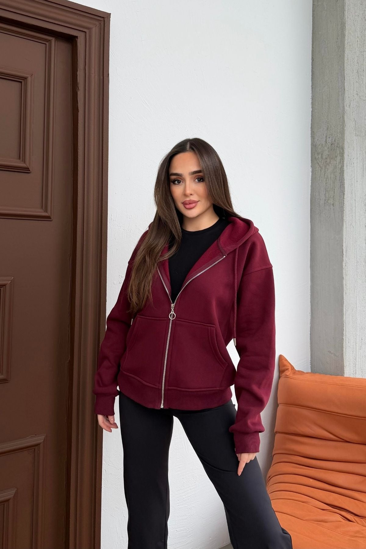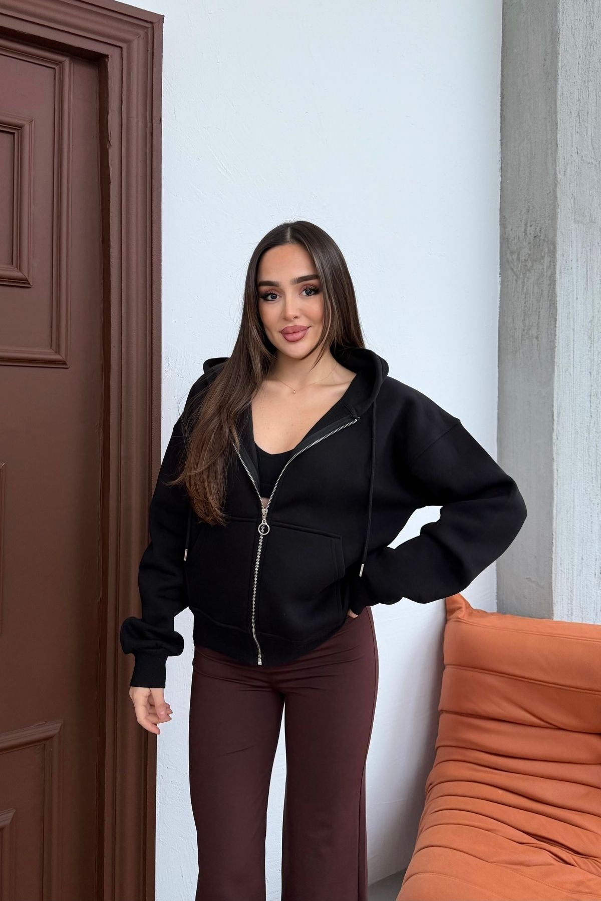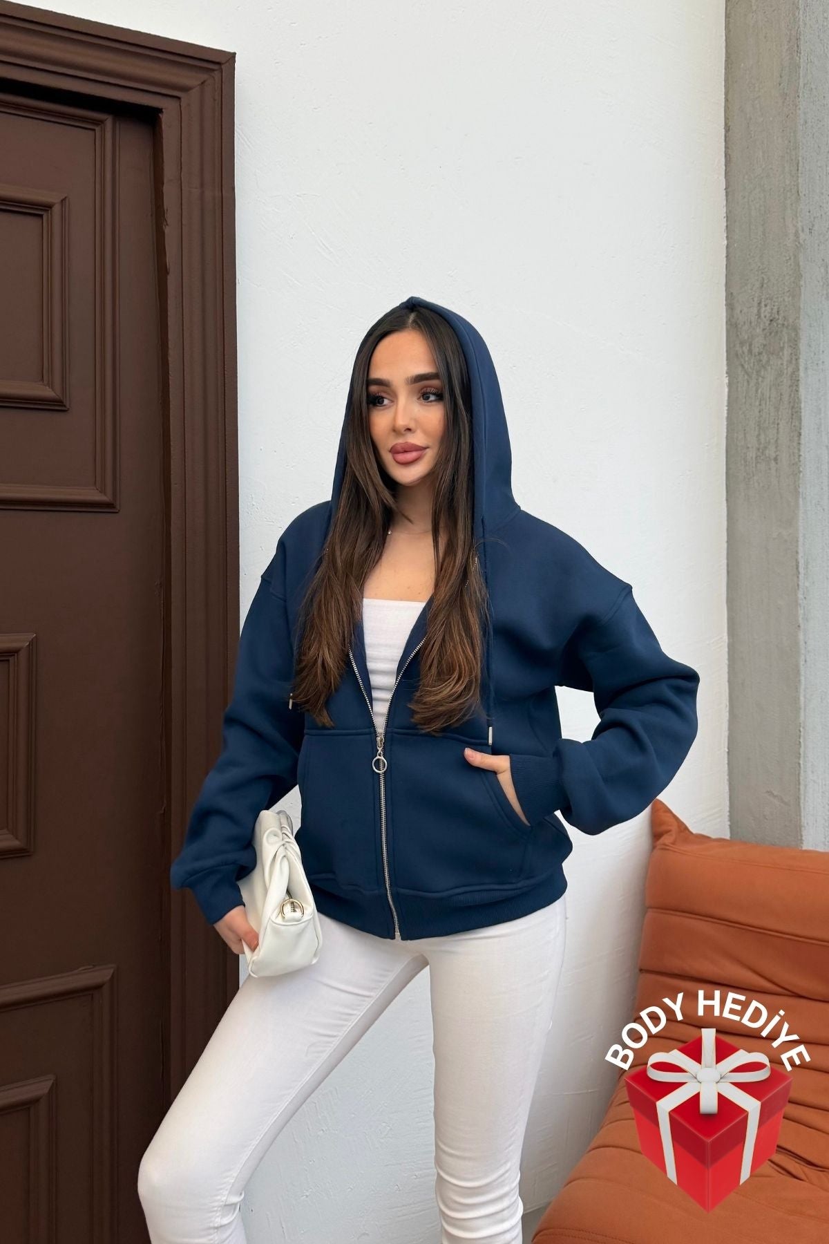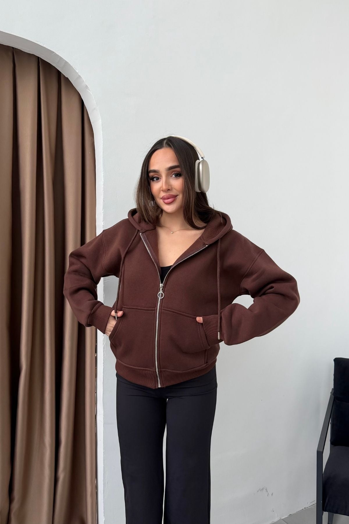 Kadın Kapüşonlu Bağcıklı Sweatshirt Fermuarlı 3 İplik Şardonlu Rahat Kesim