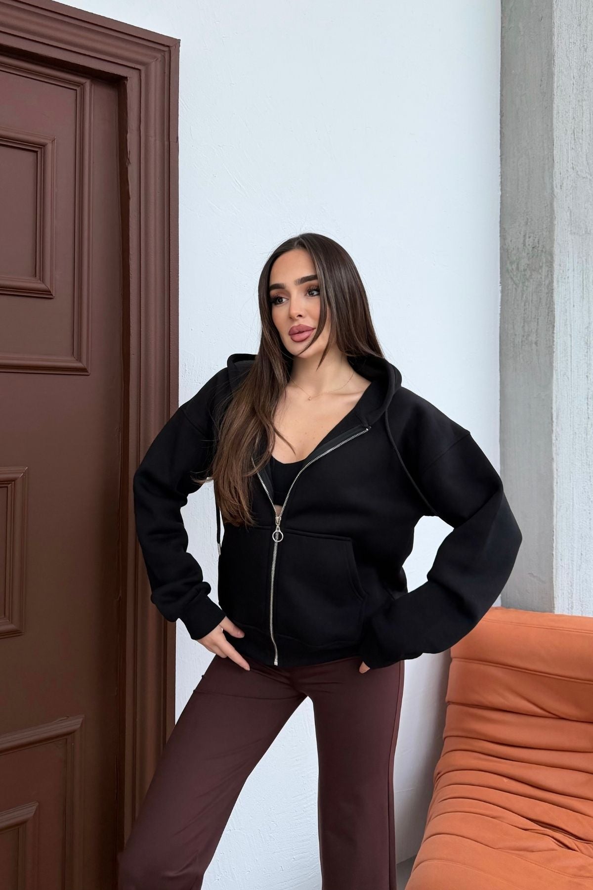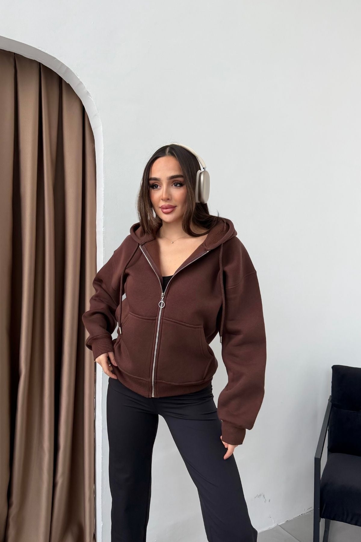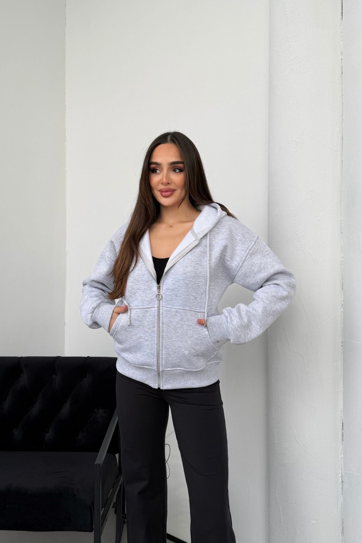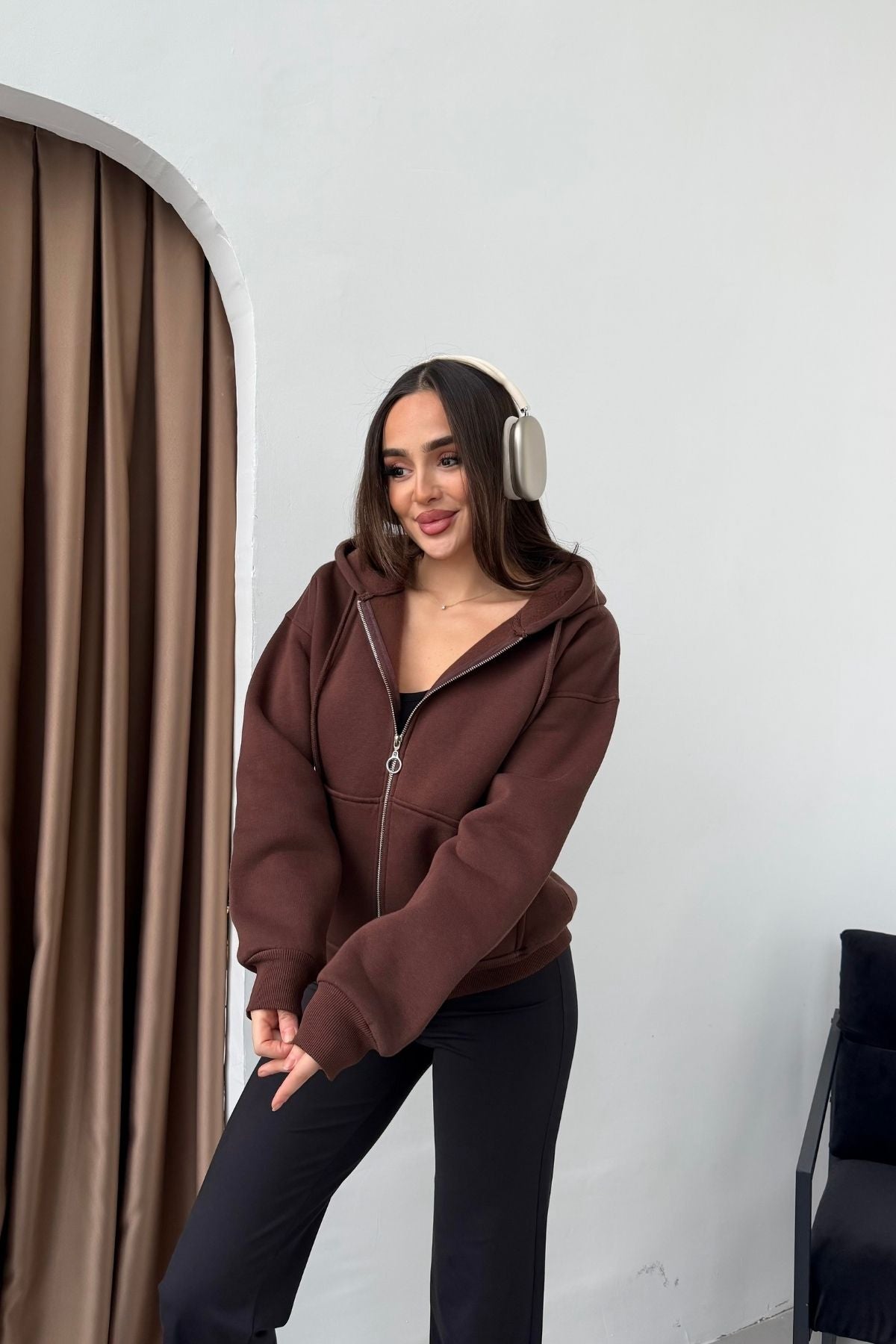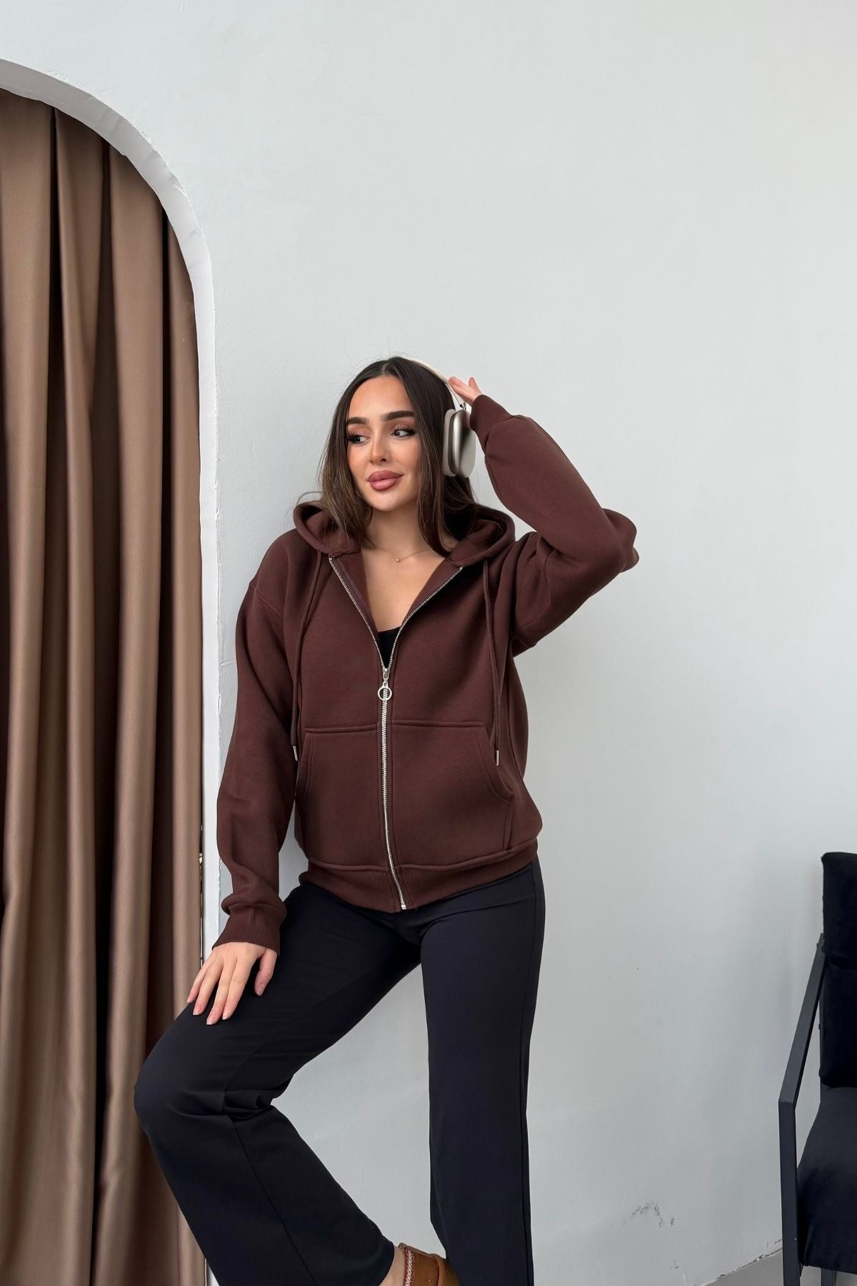 Kadın Kapüşonlu Bağcıklı Sweatshirt Fermuarlı 3 İplik Şardonlu Rahat Kesim