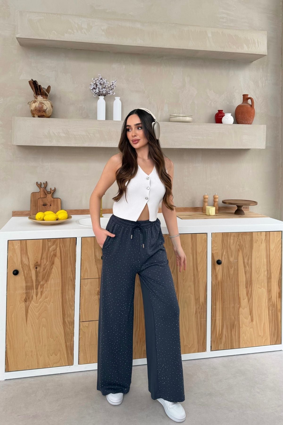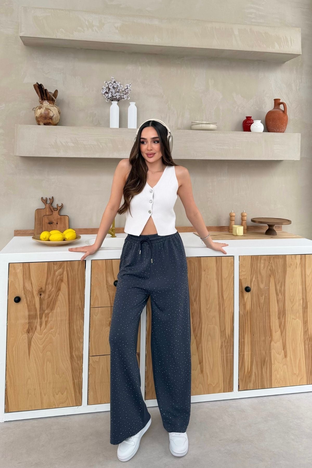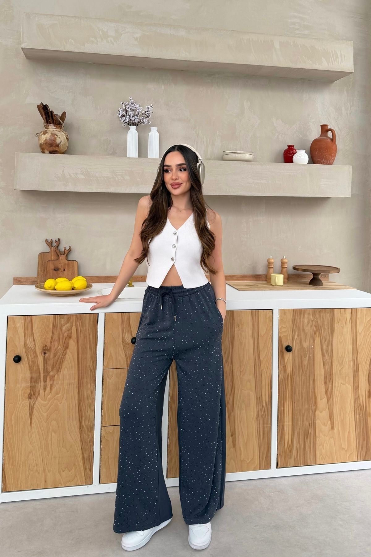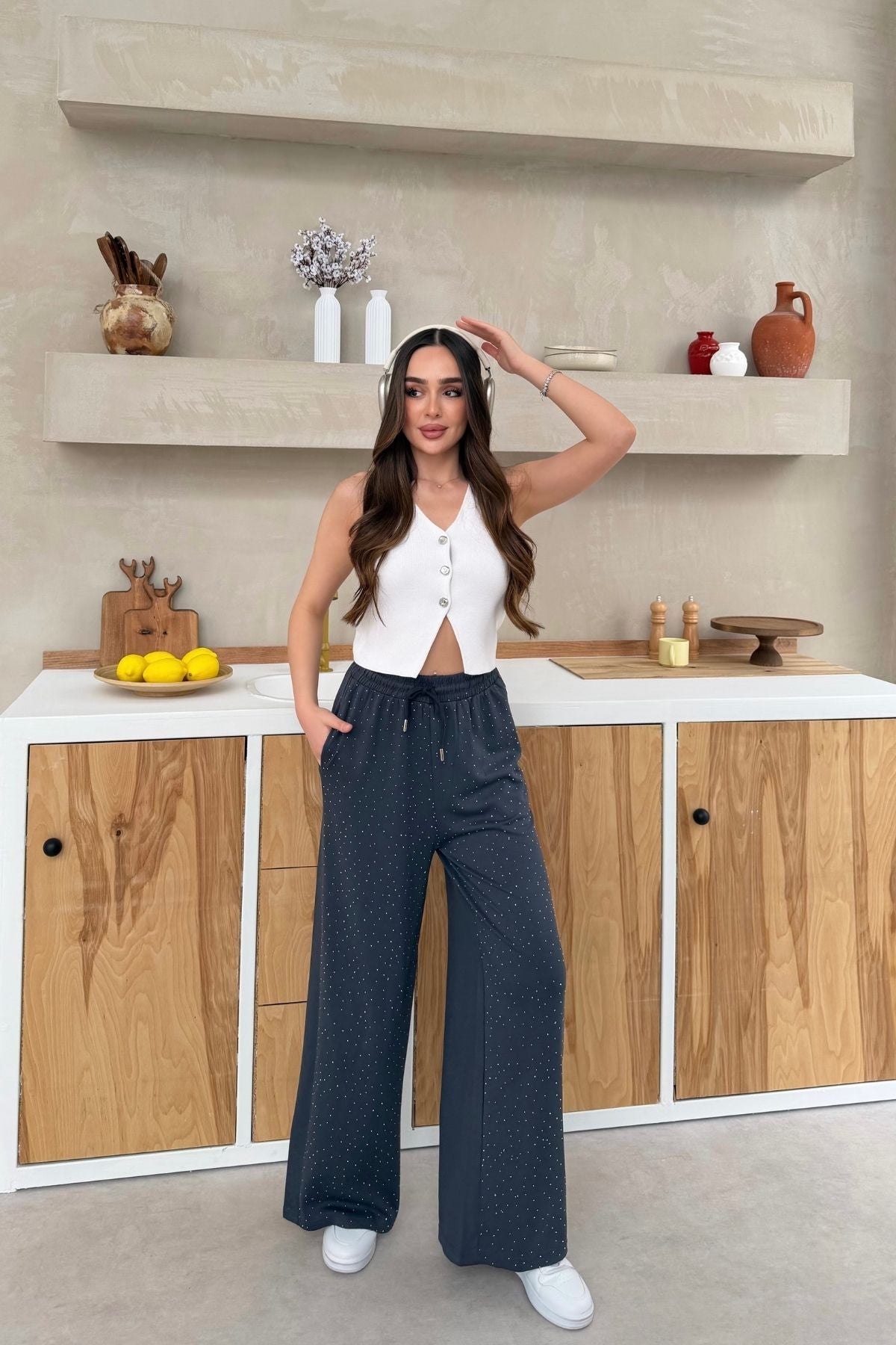 Kadın Taşlı Bol Paça Modal Kumaş Eşofman Altı