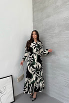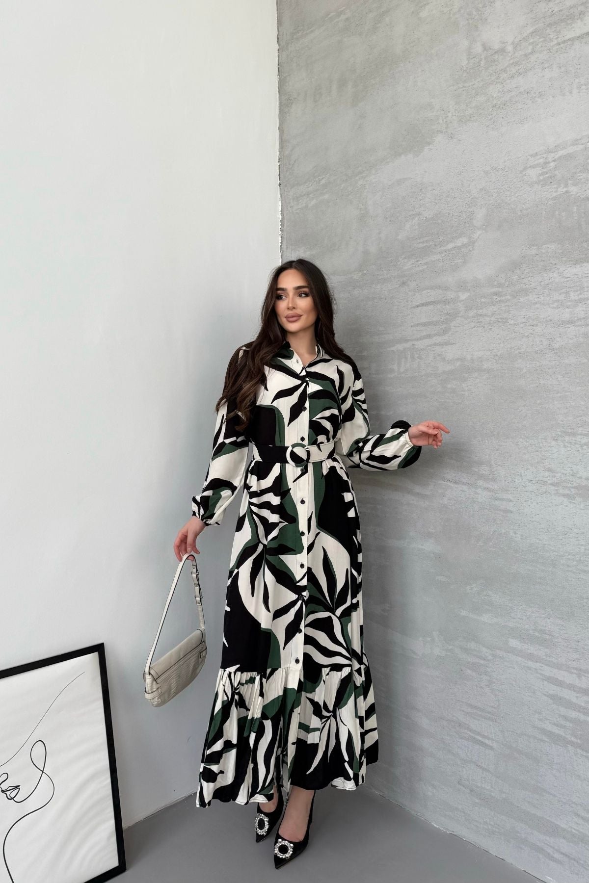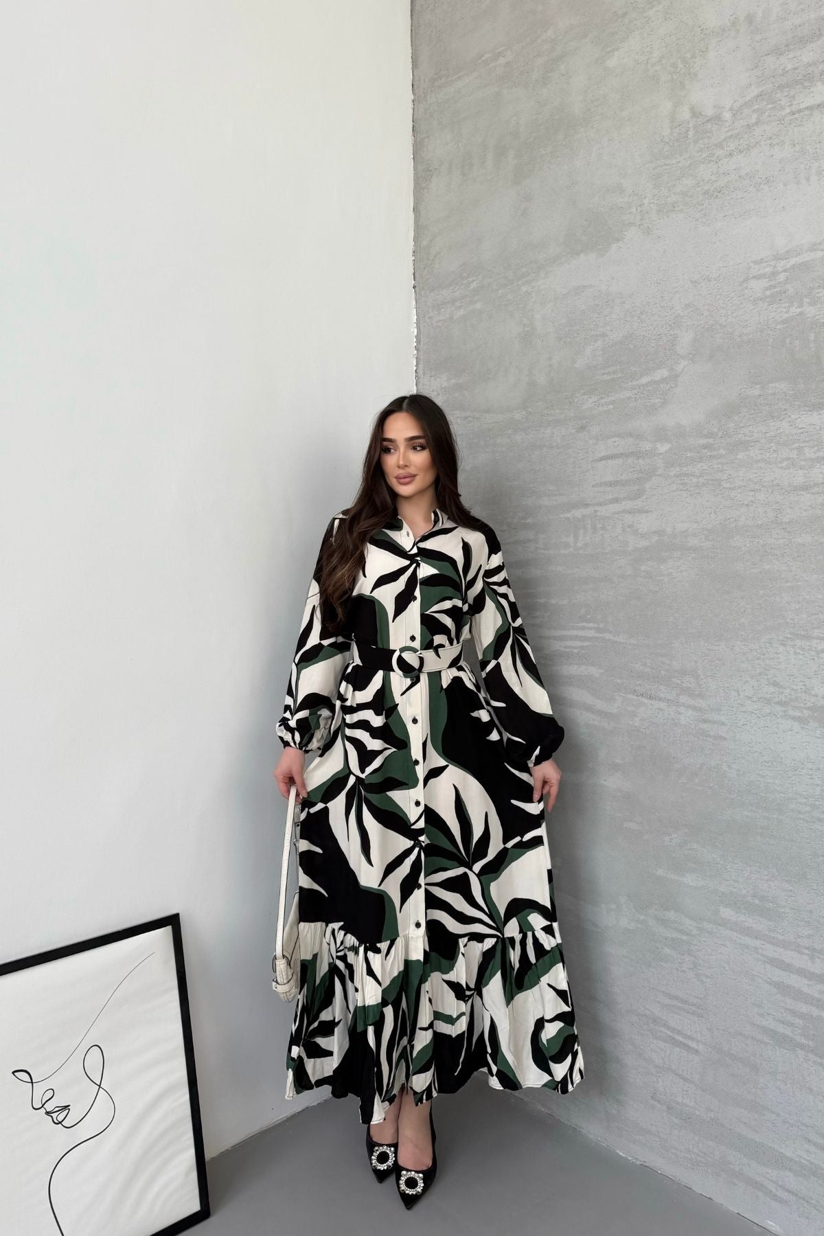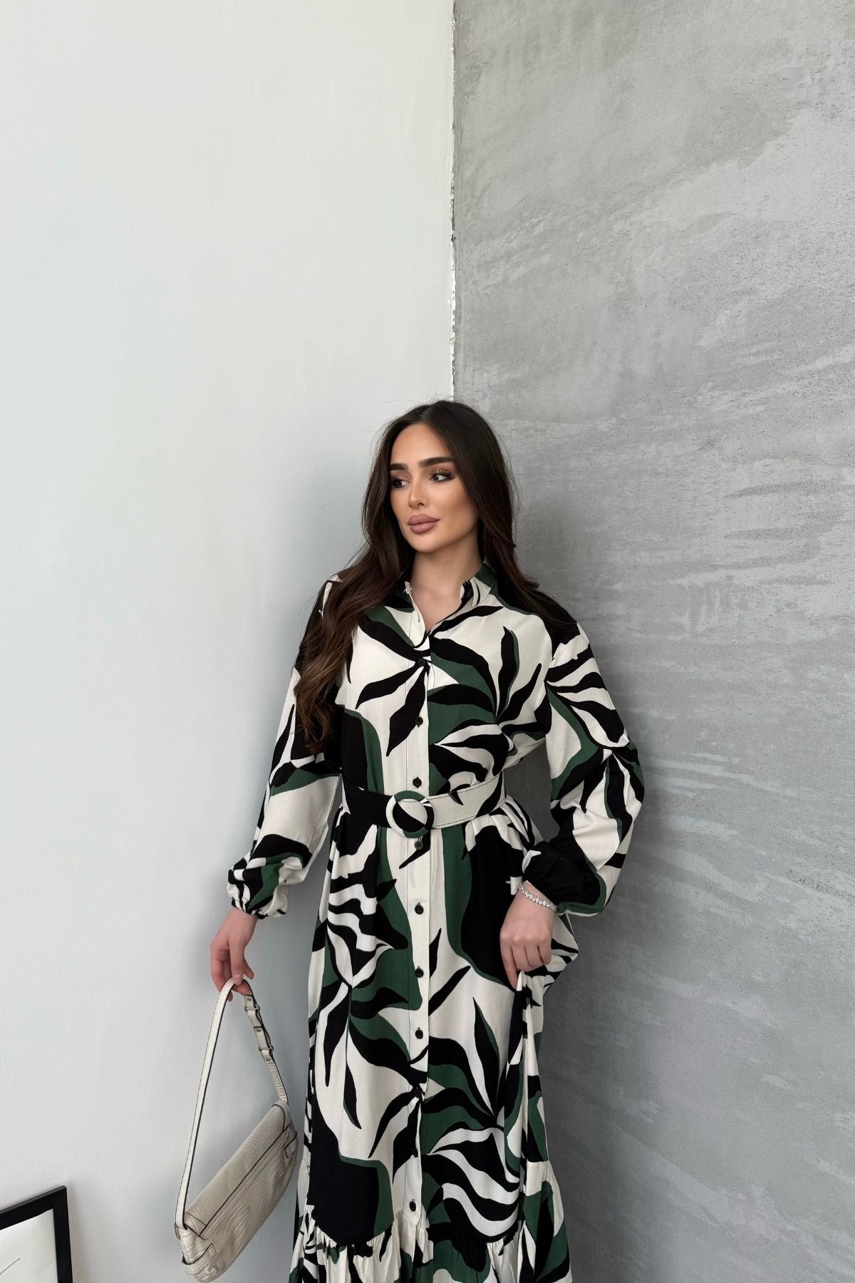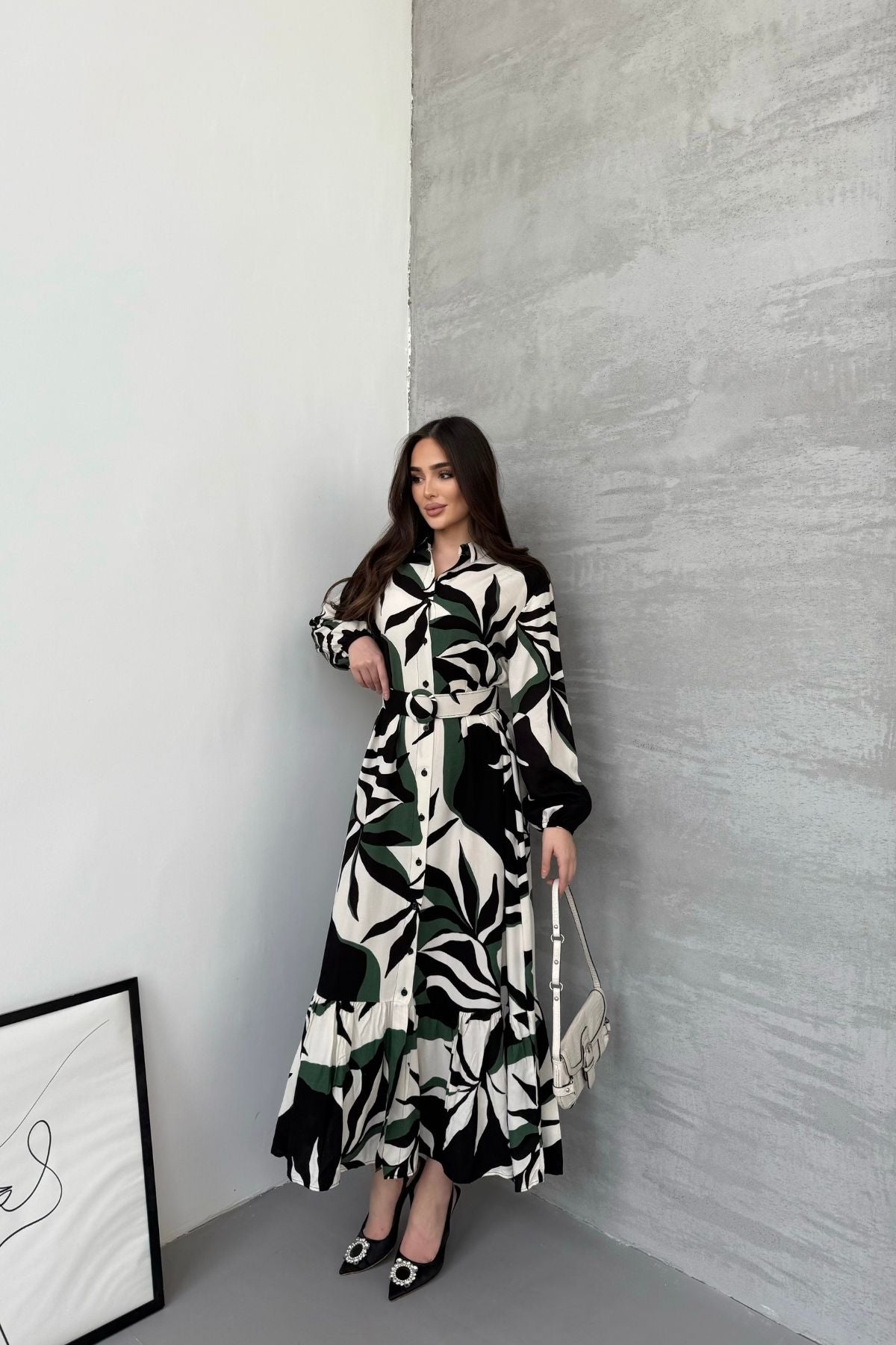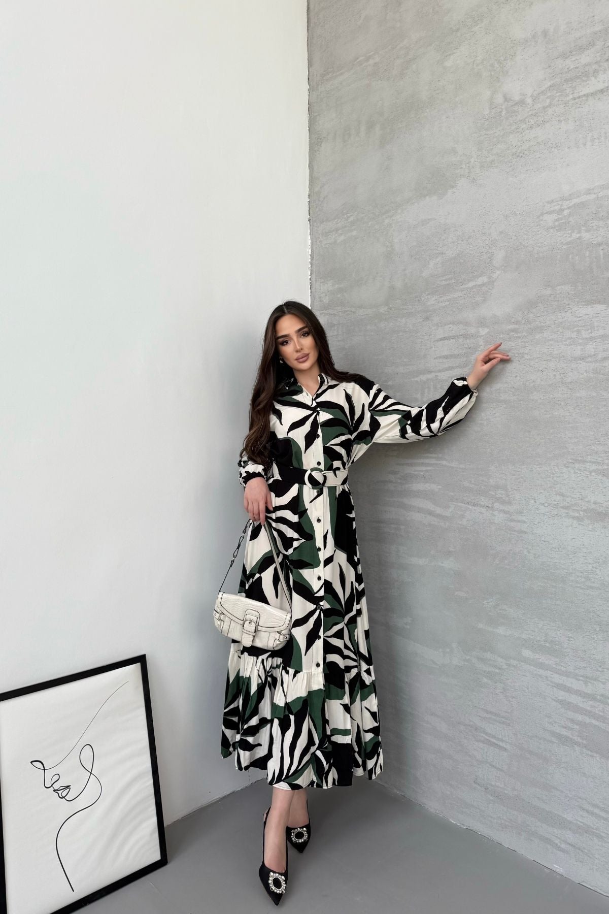 Kadın Siyah Yeşil Desenli Uzun Kol, Kemerli, Uzun Viskon Gömlek Elbise