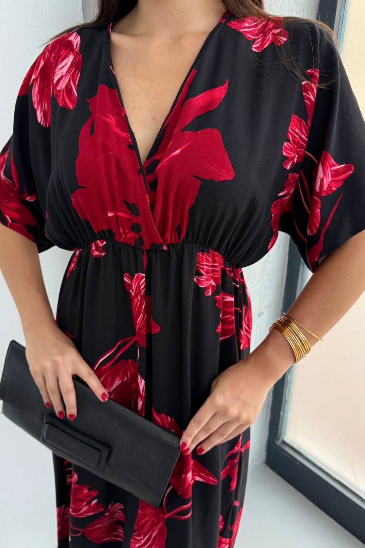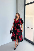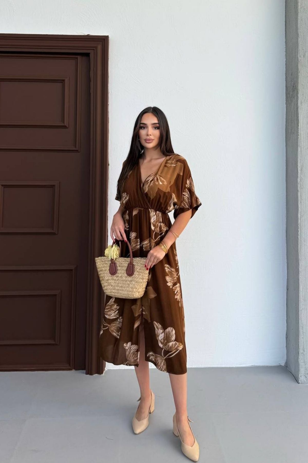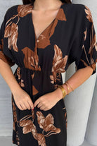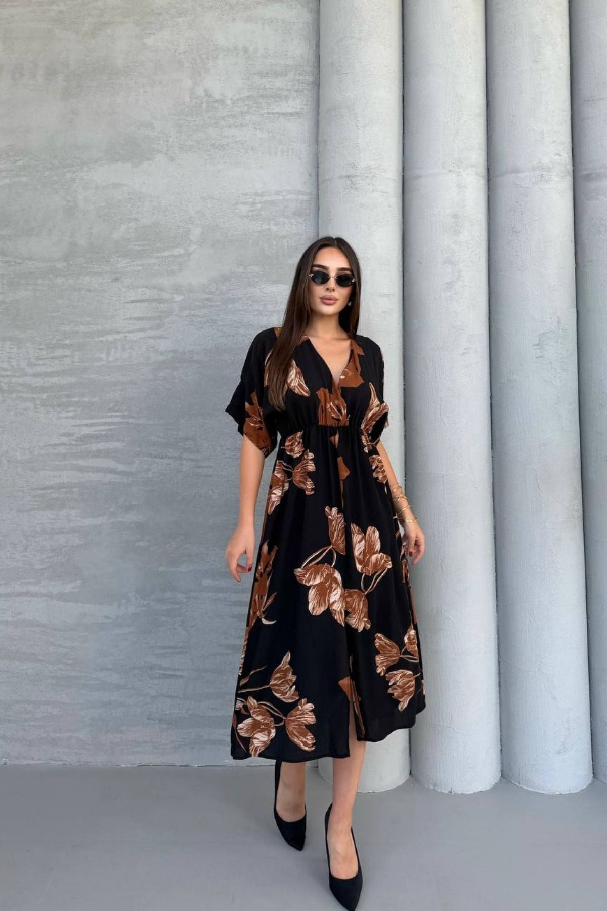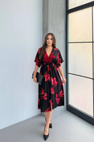 Kısa Kollu Beli Lastikli Desenli Midi Elbise