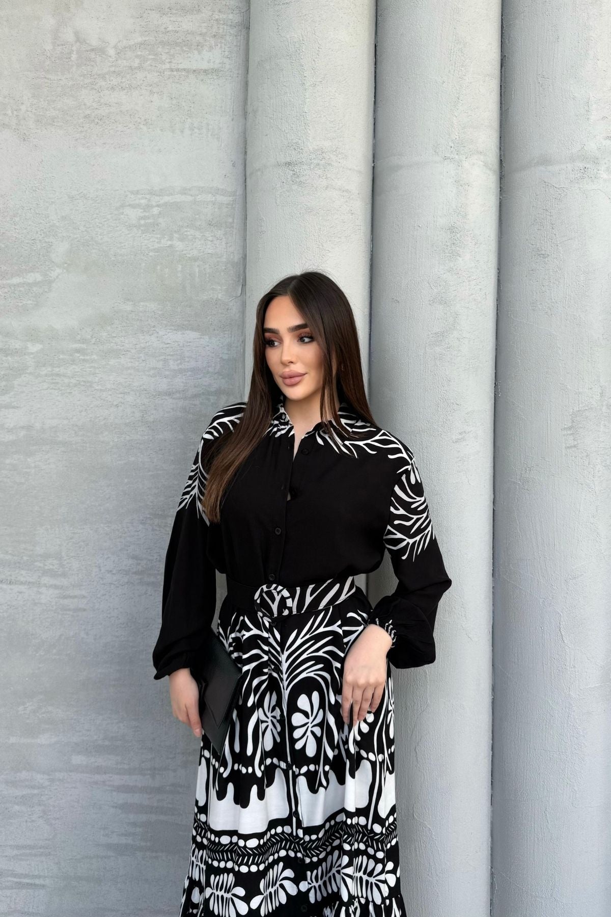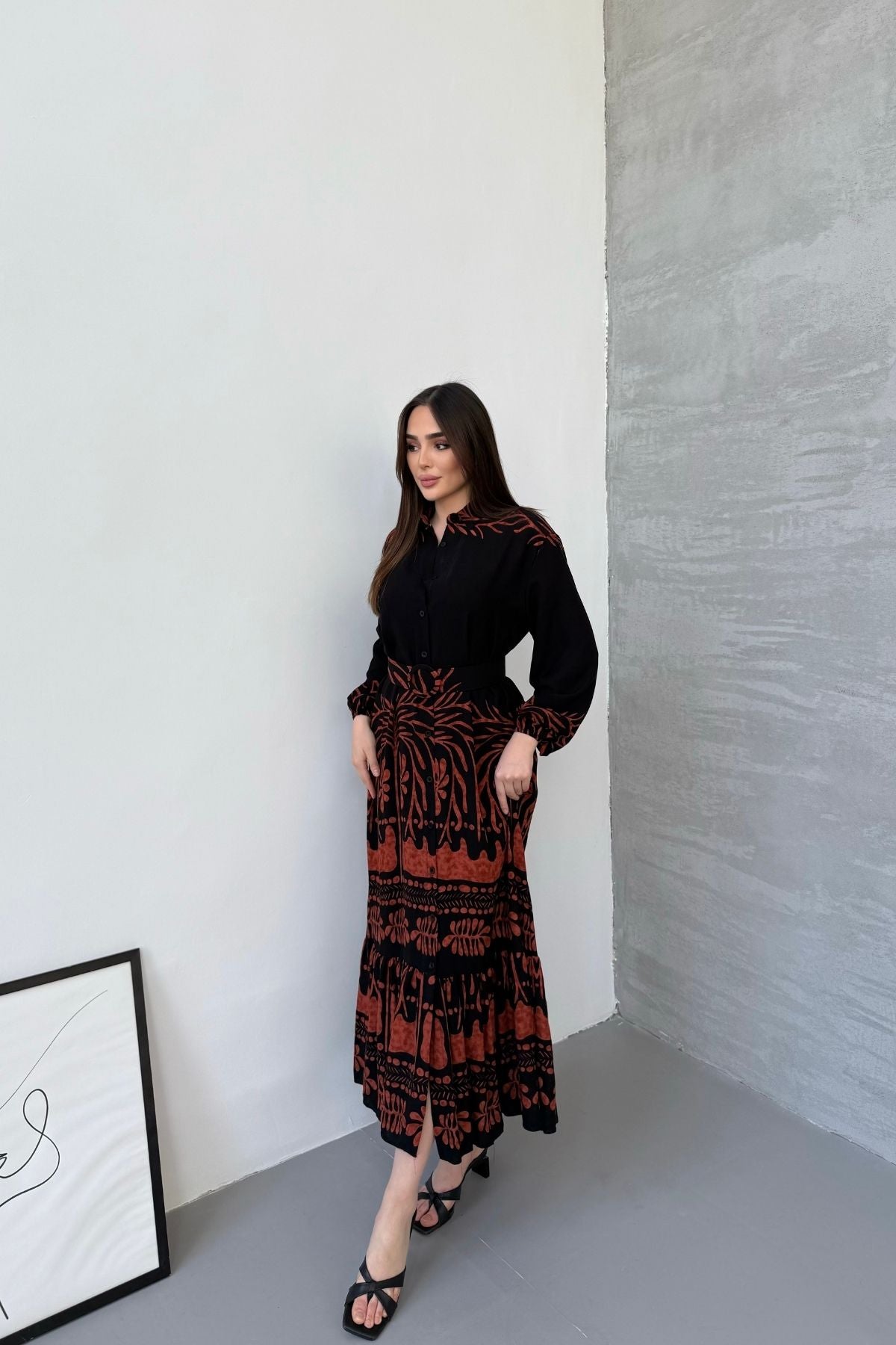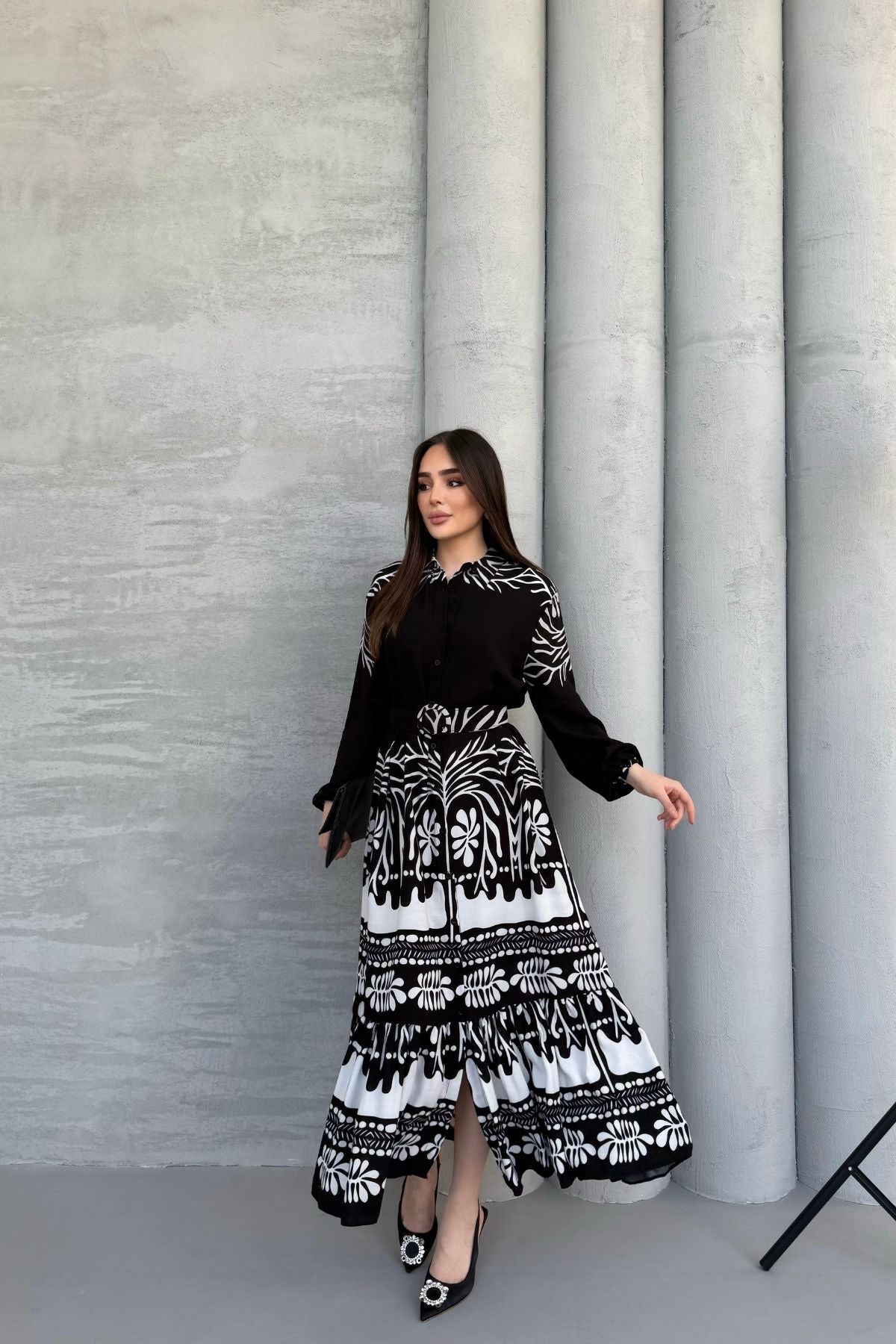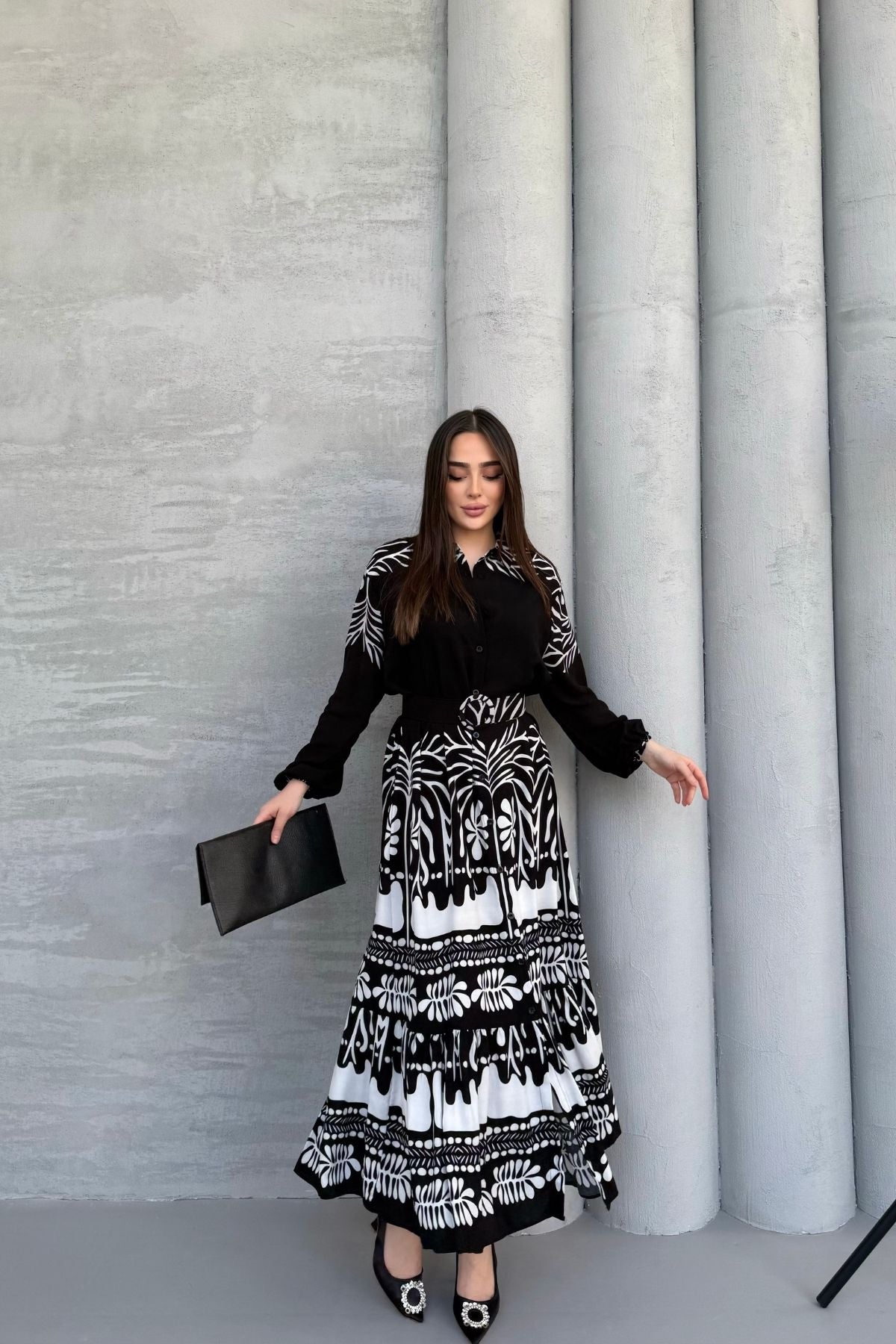 Uzun Kollu Beli Kemeler Desenli Uzun Kadın Elbise