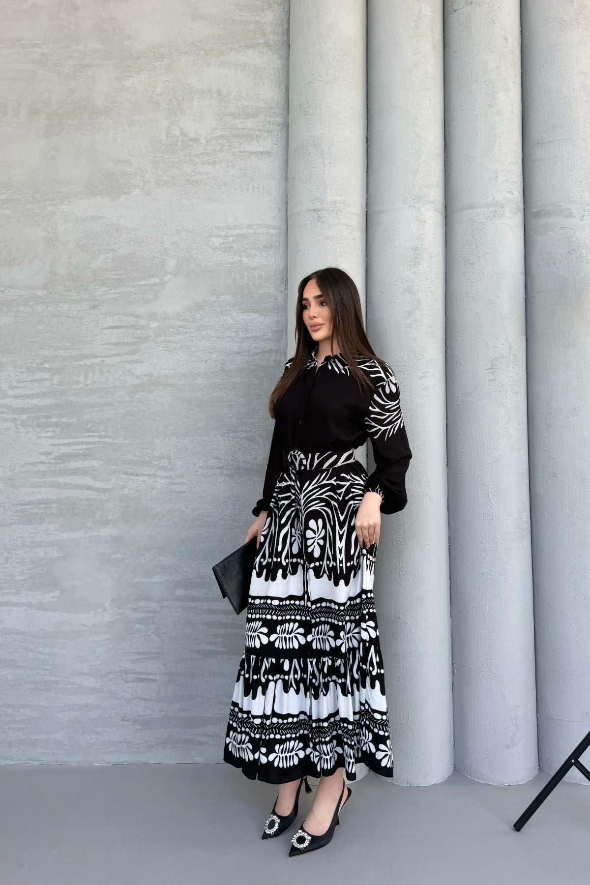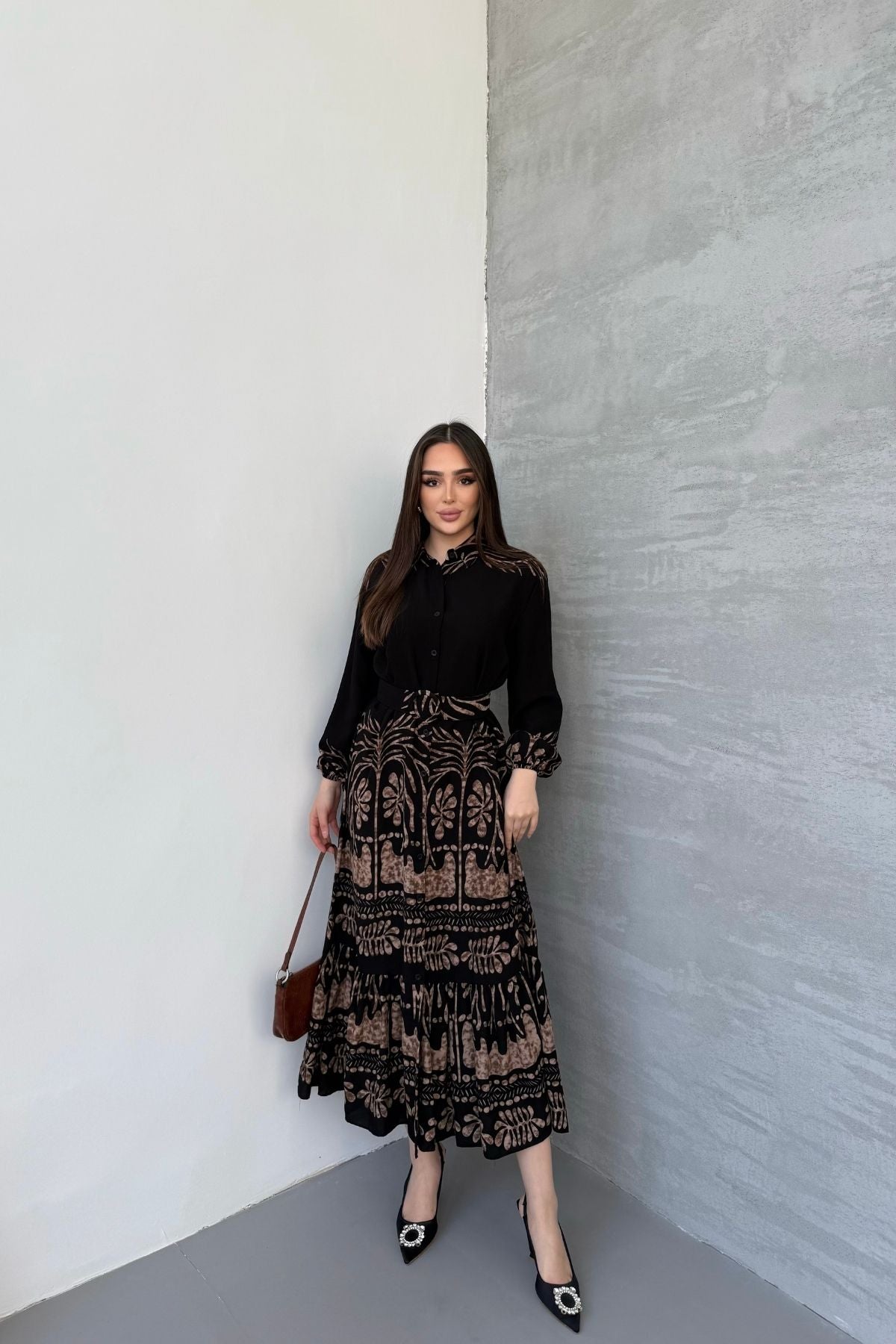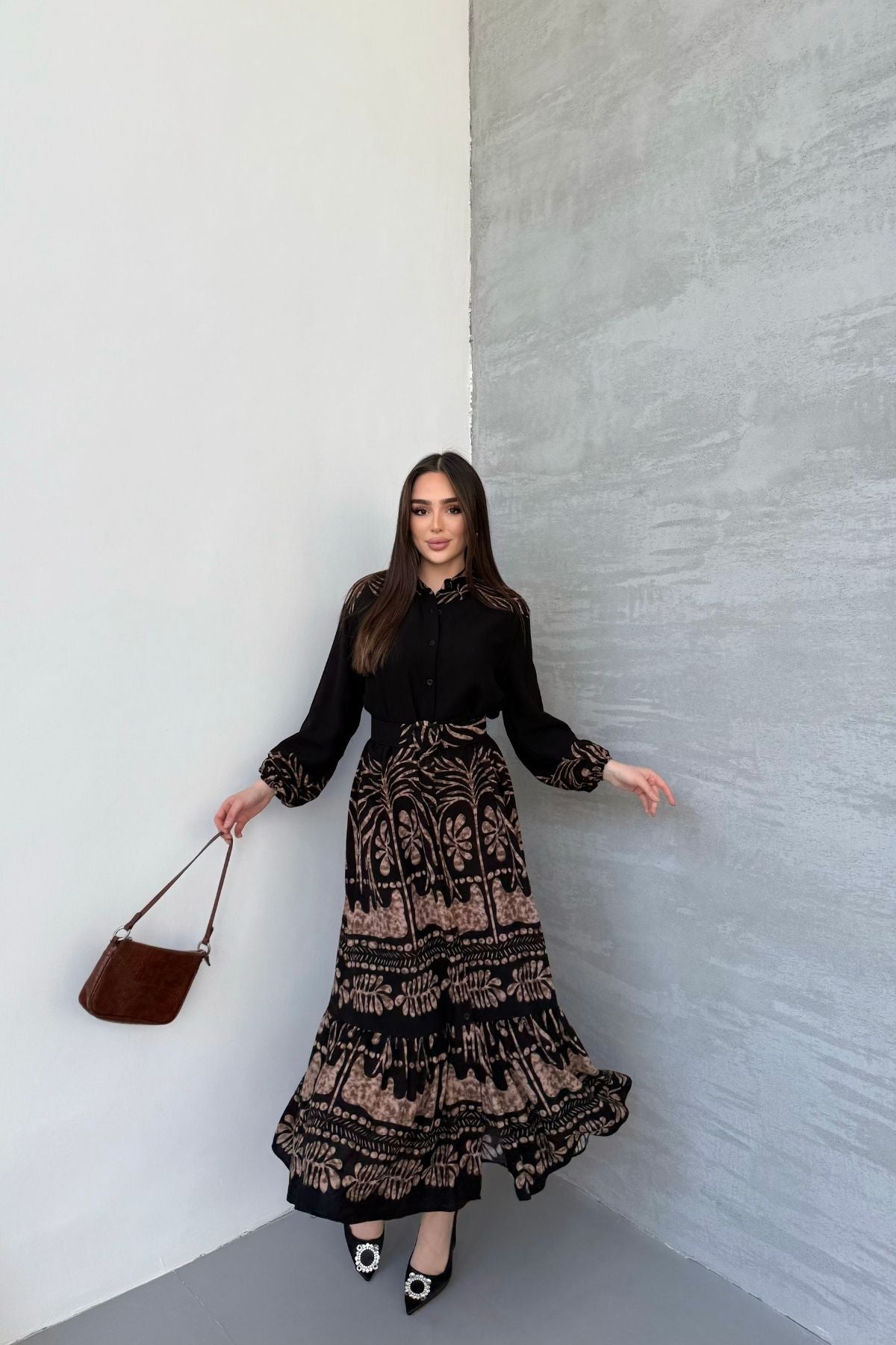 Uzun Kollu Beli Kemeler Desenli Uzun Kadın Elbise