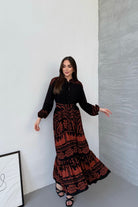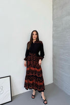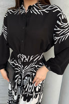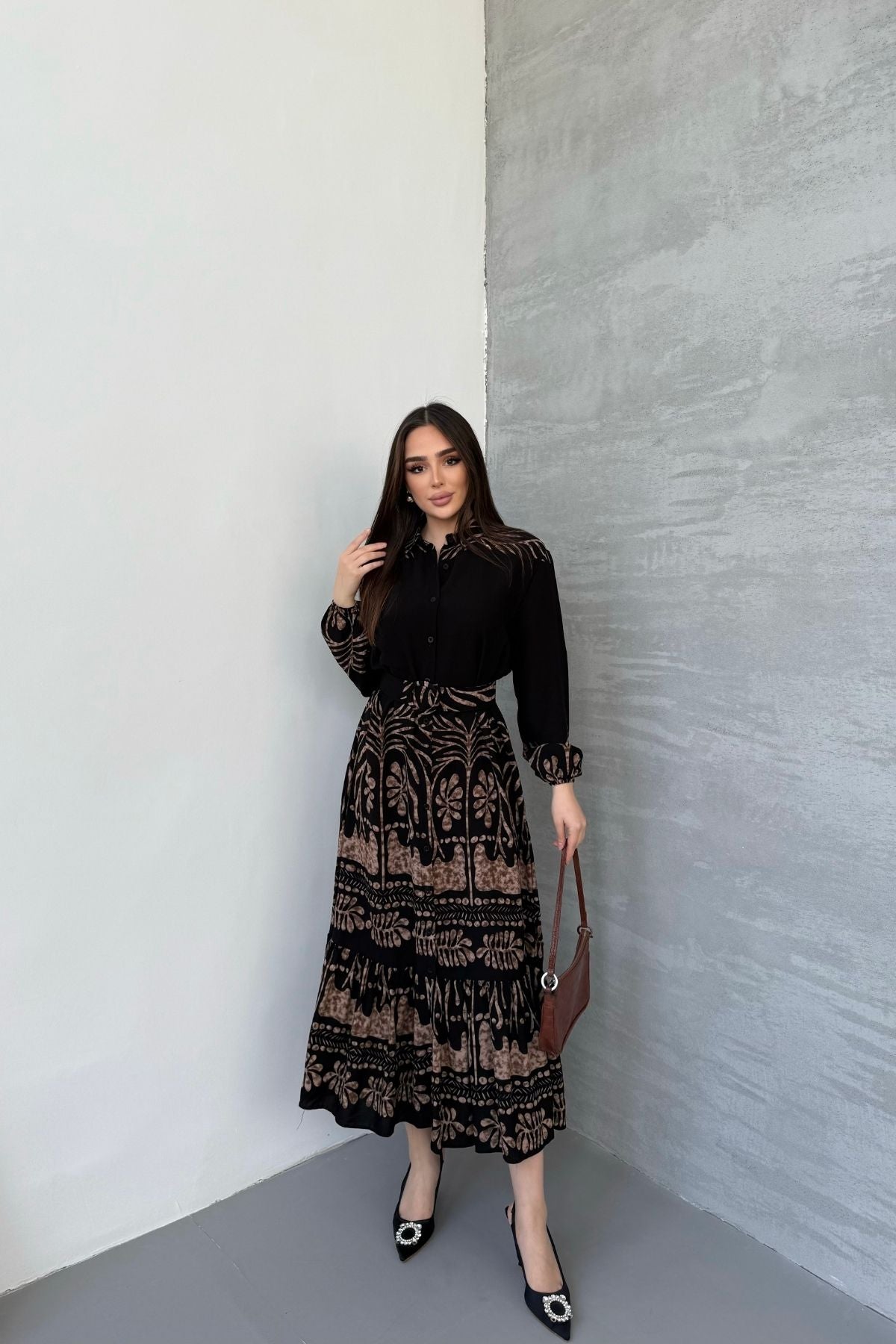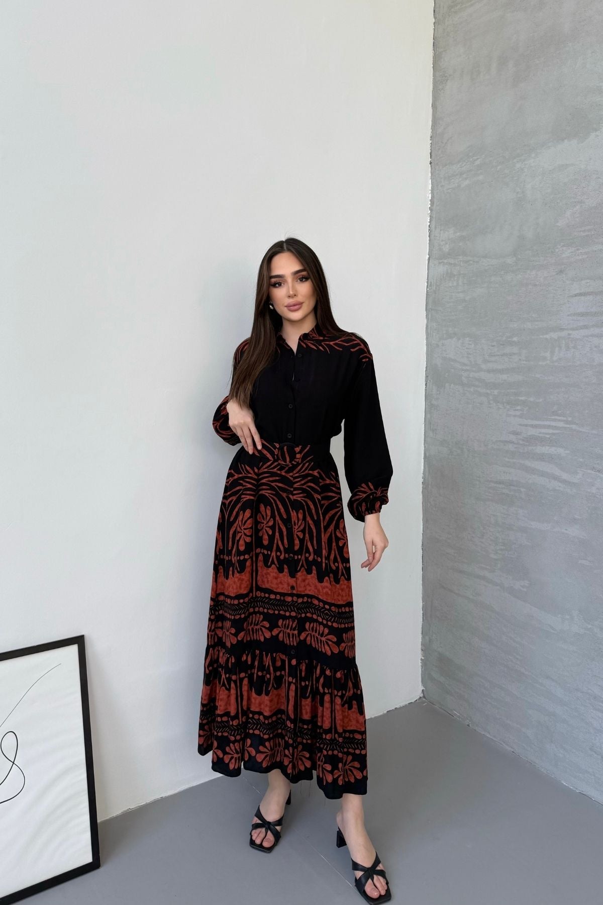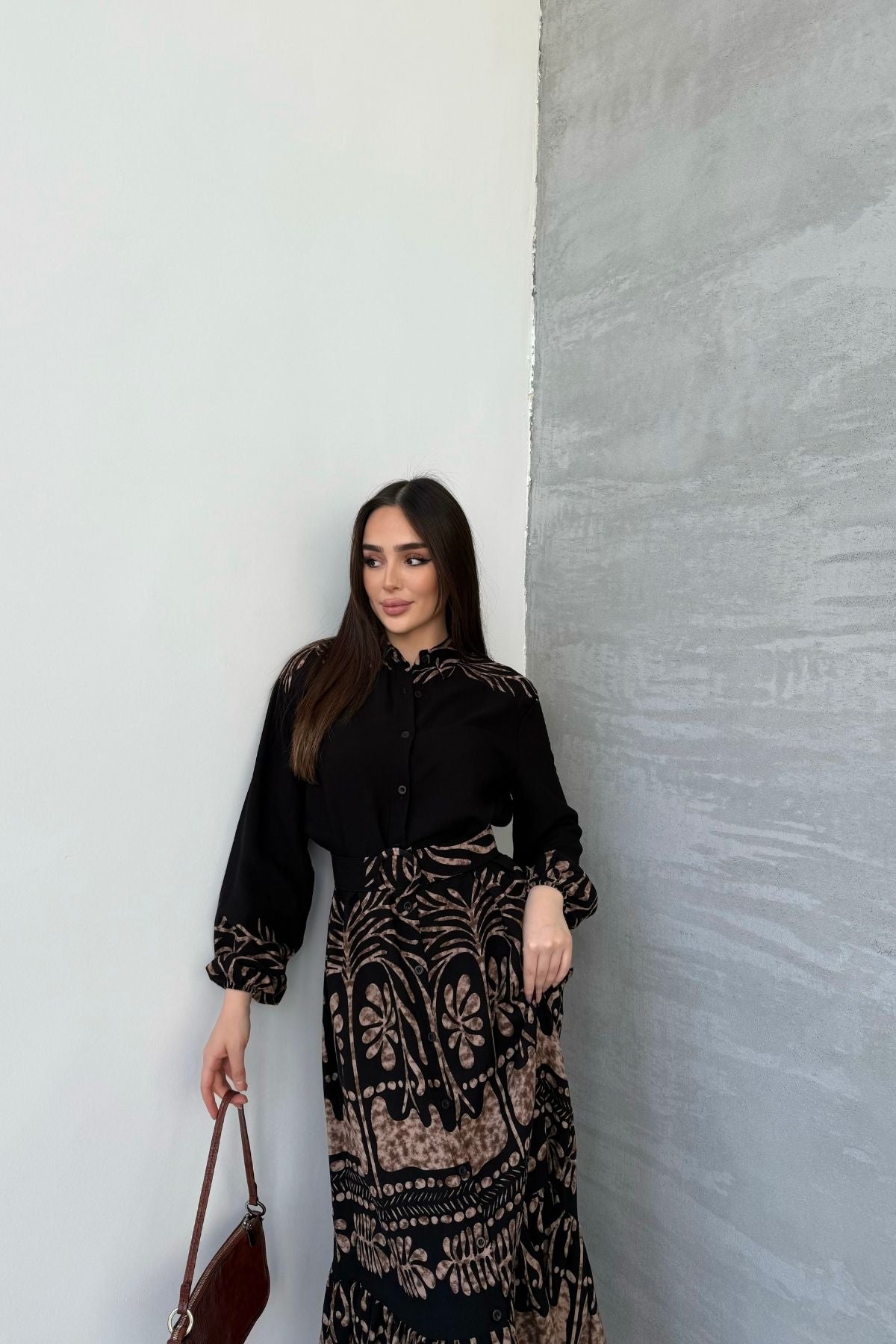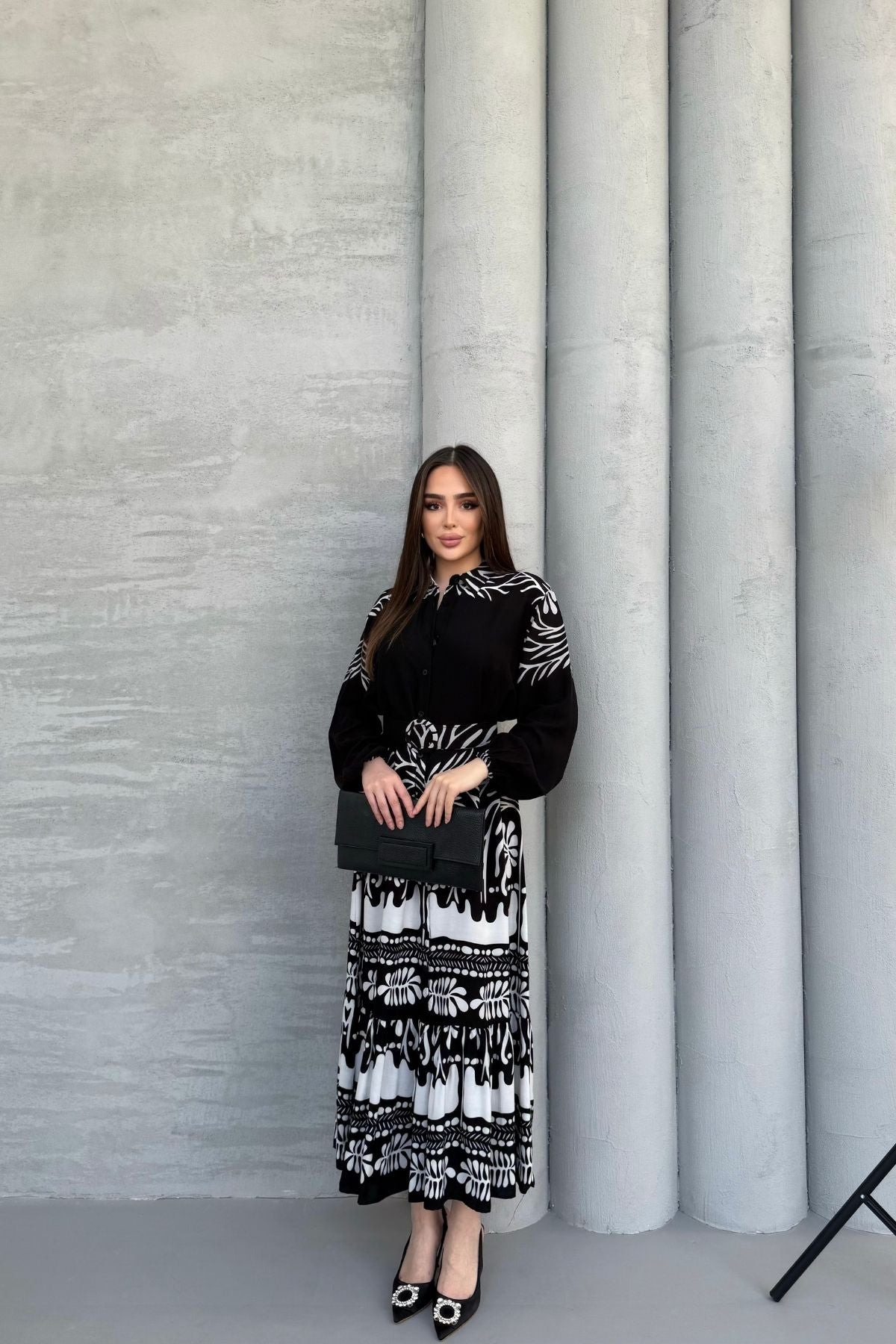 Uzun Kollu Beli Kemeler Desenli Uzun Kadın Elbise