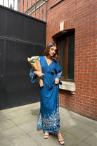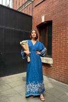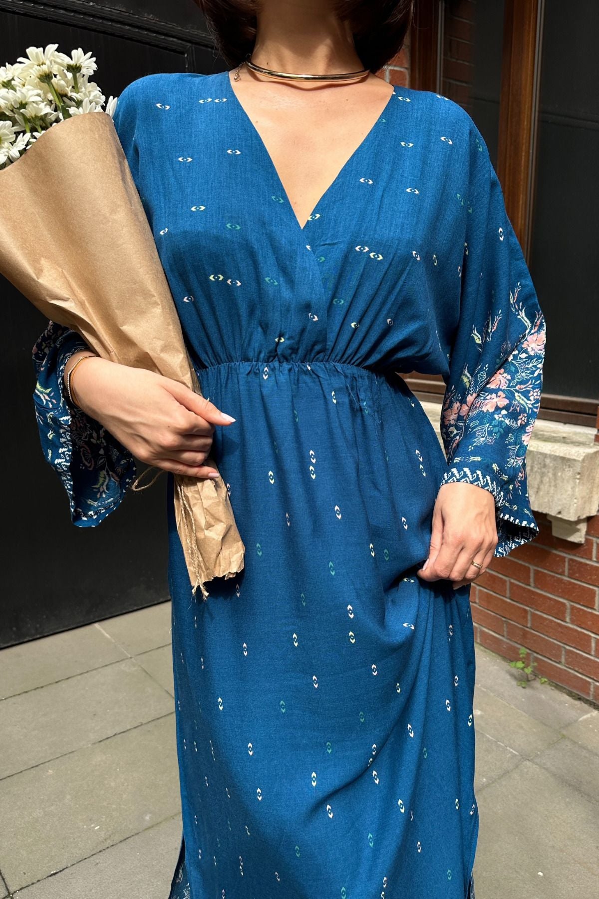 Anvelop Yaka Desenli Yazlık Viskon Elbise Mavi Desenli