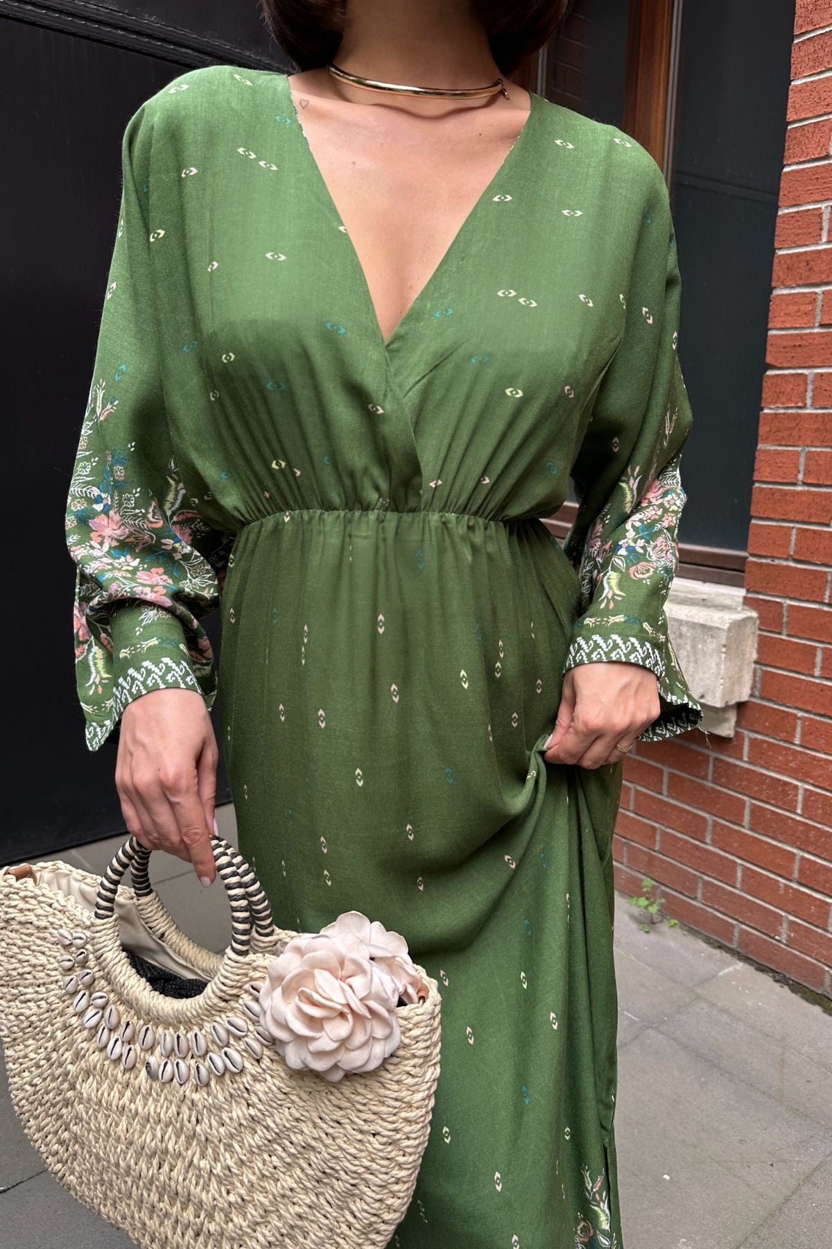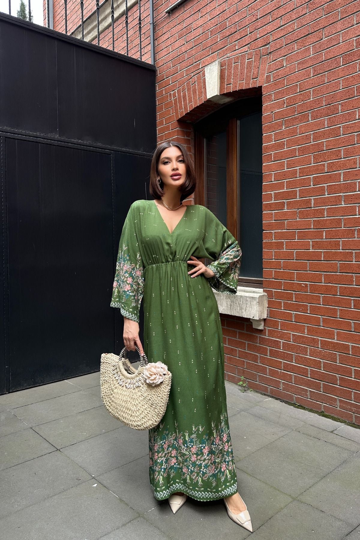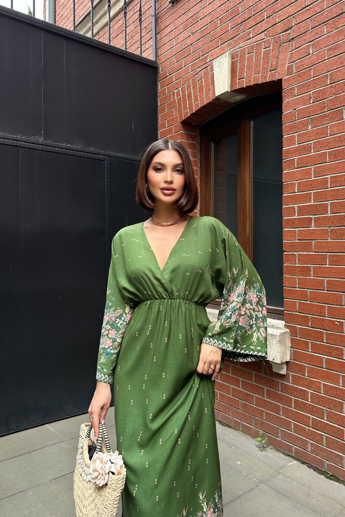 Anvelop Yaka Desenli Yazlık Viskon Elbise Yeşil Desenli