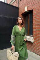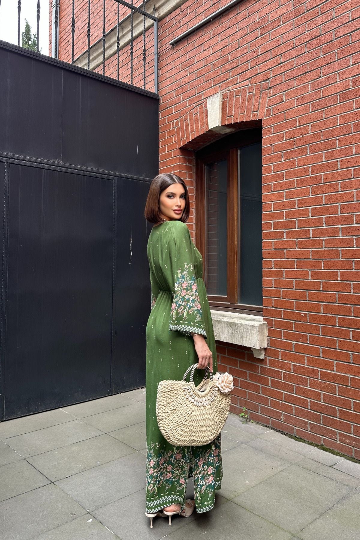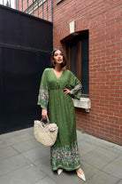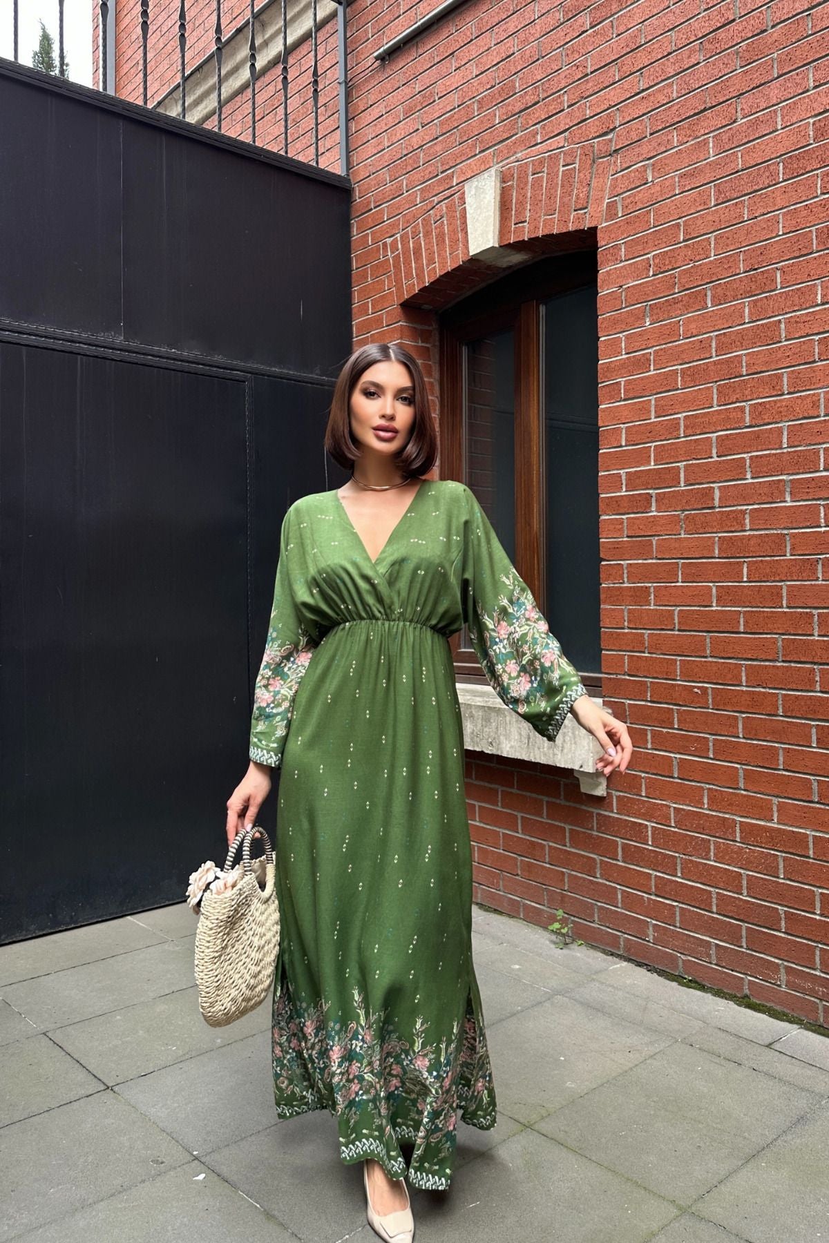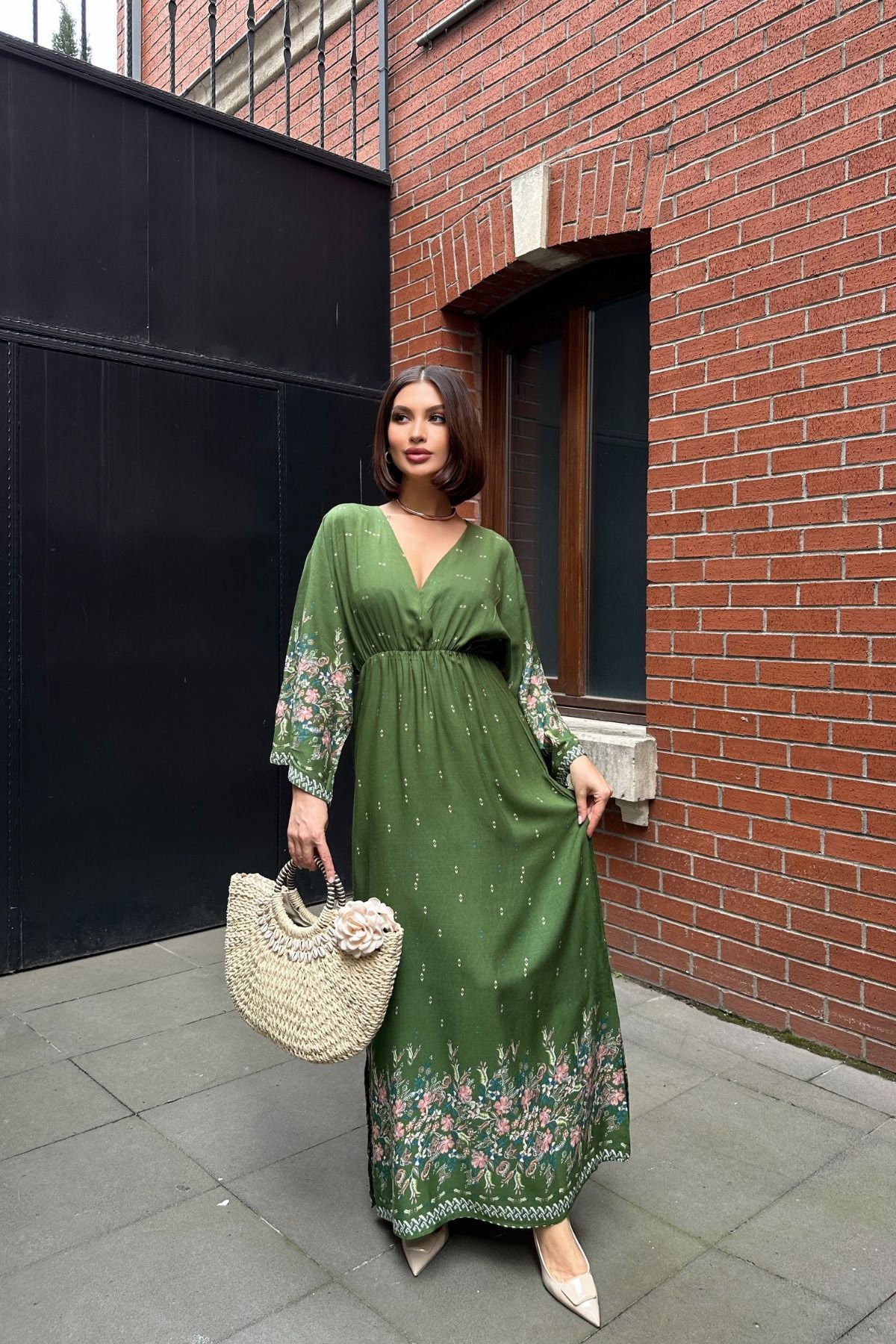 Anvelop Yaka Desenli Yazlık Viskon Elbise Yeşil Desenli