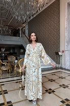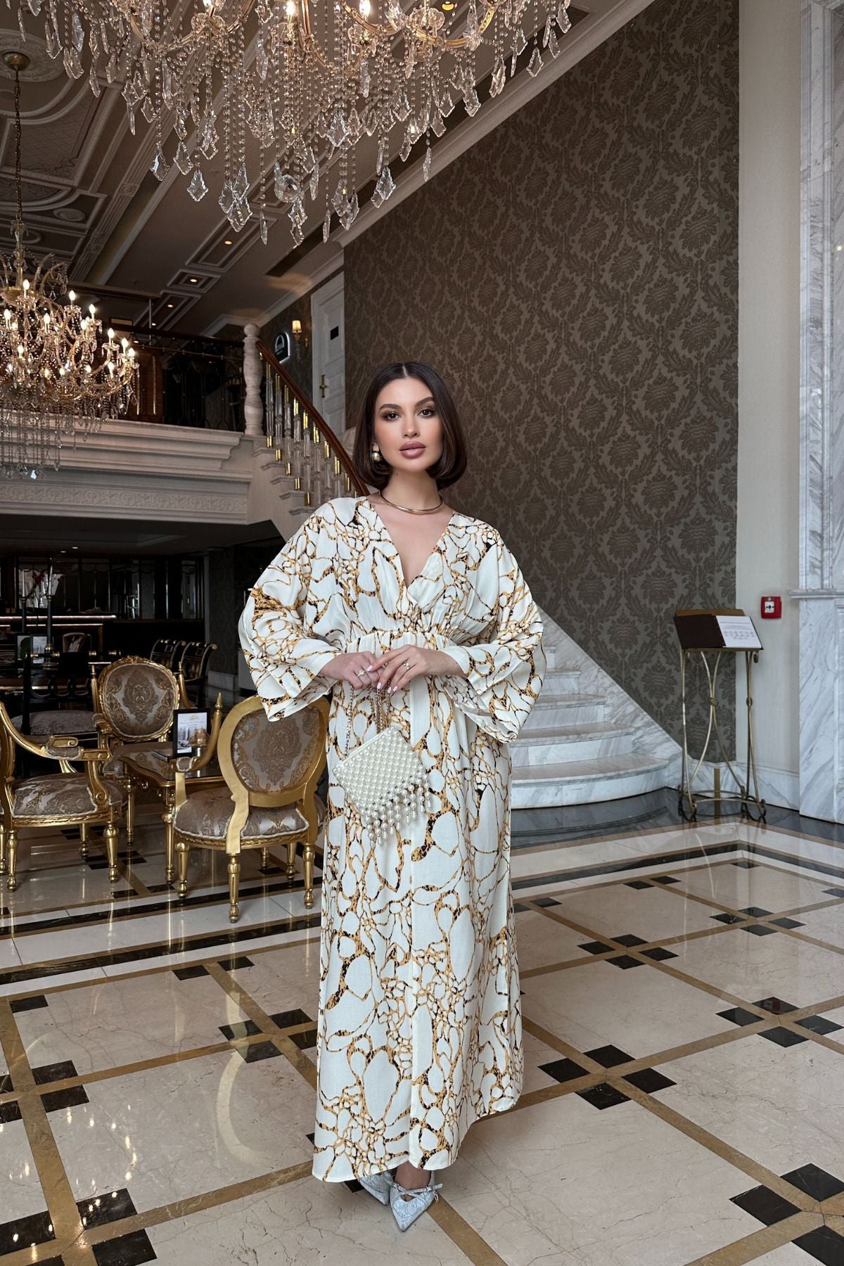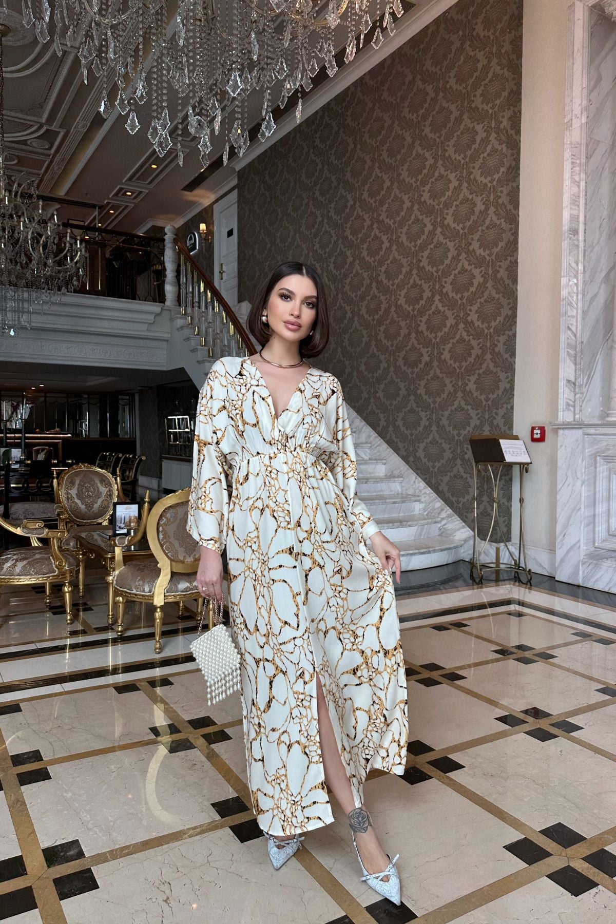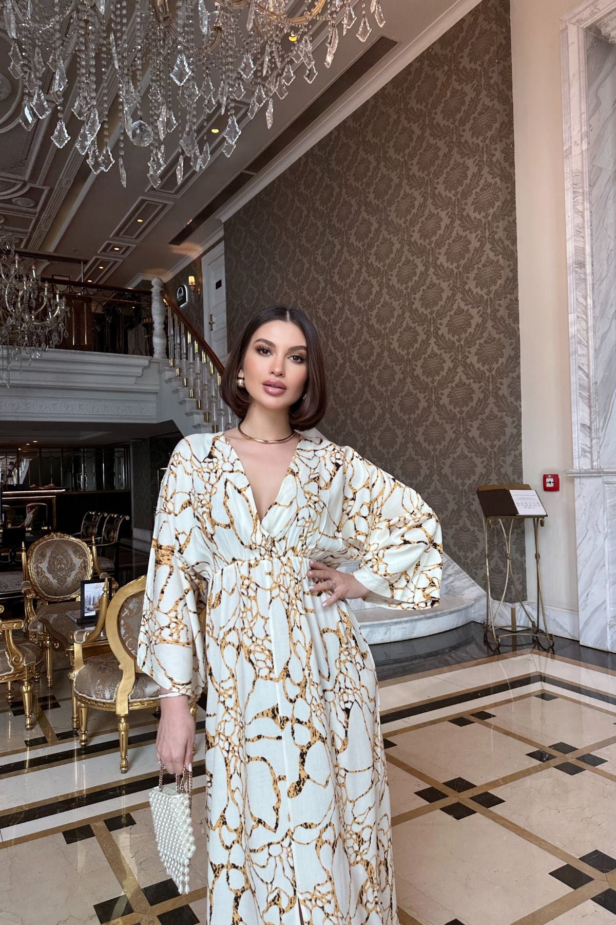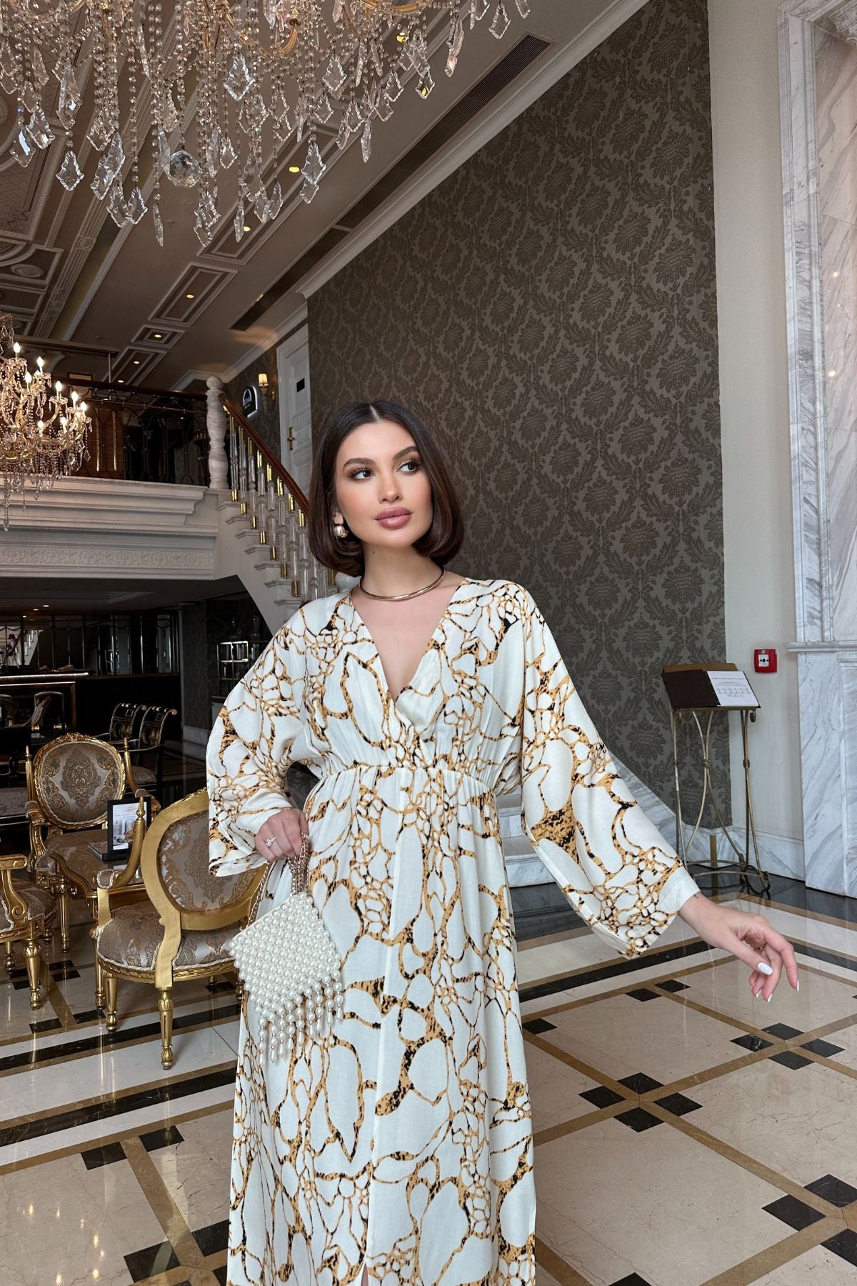Beyaz Desenli Kruvaze Yaka Uzun Kadın Elbise