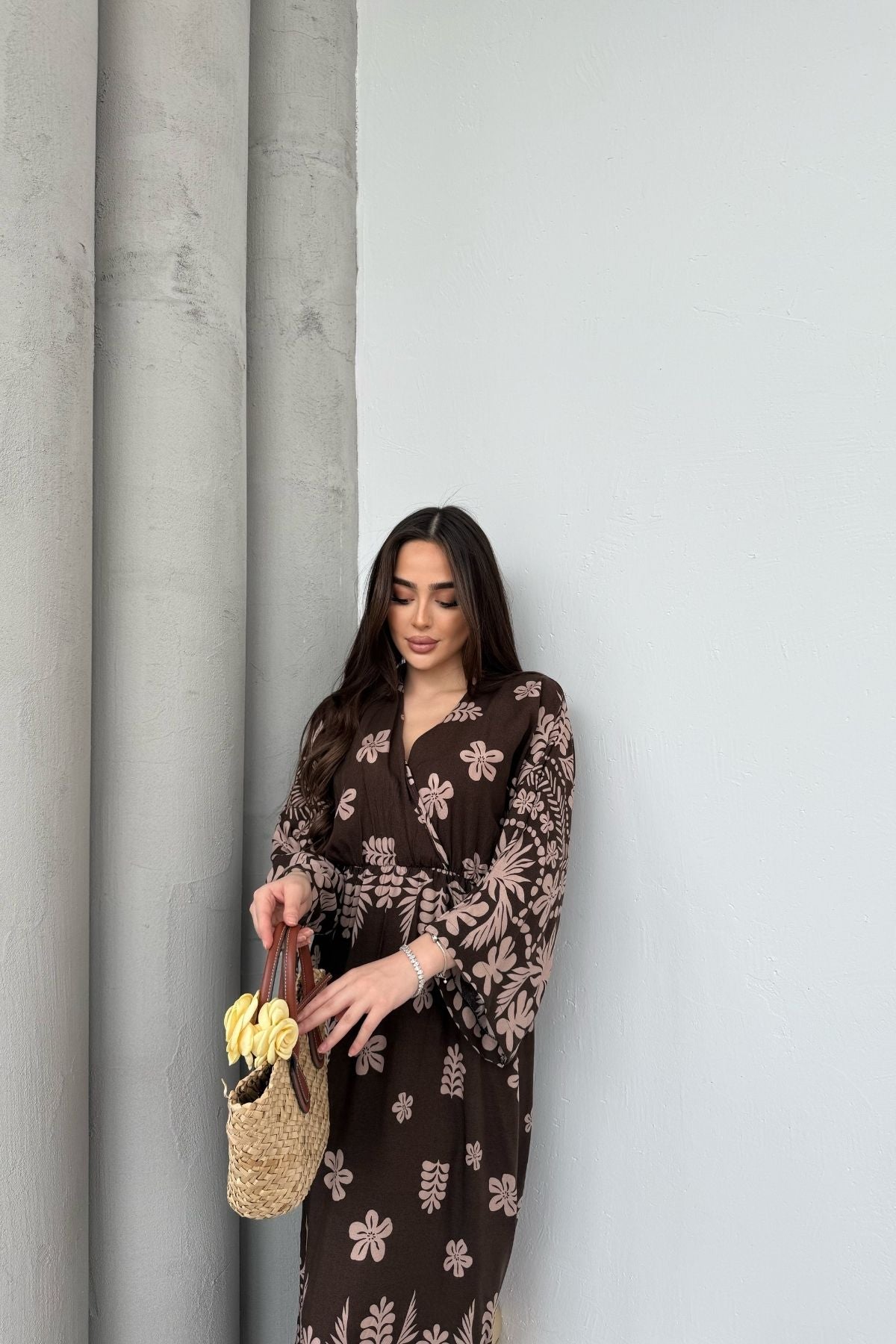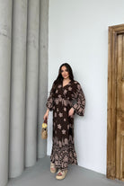 Çiçek Desenli Kahverengi Uzun Kollu Elbise