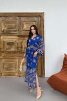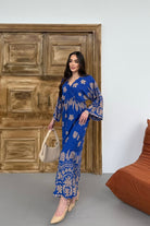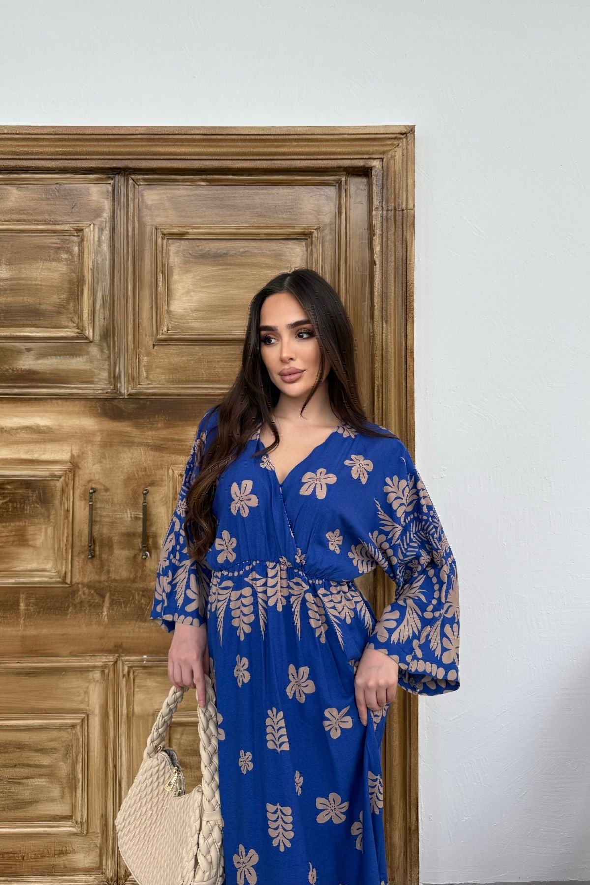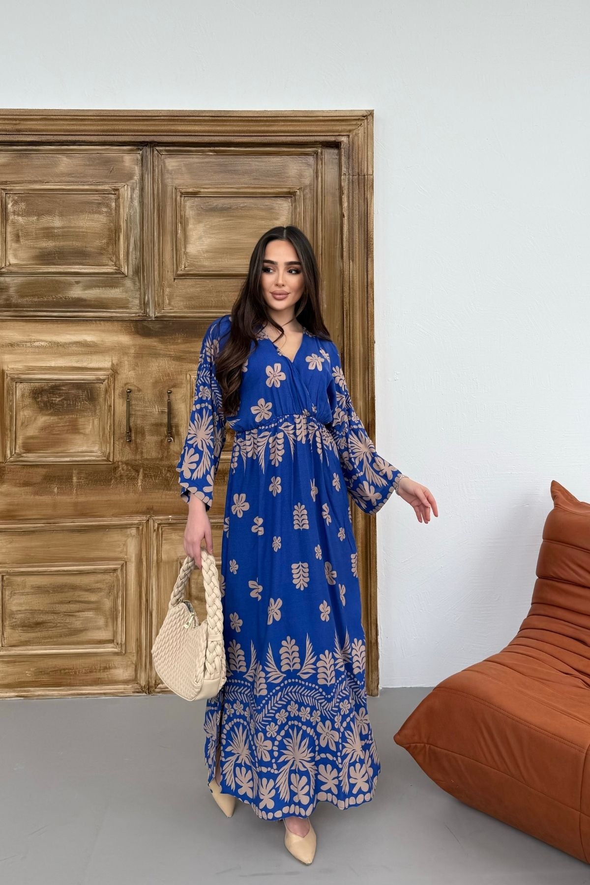 Çiçek Desenli Mavi Uzun Kollu Elbise