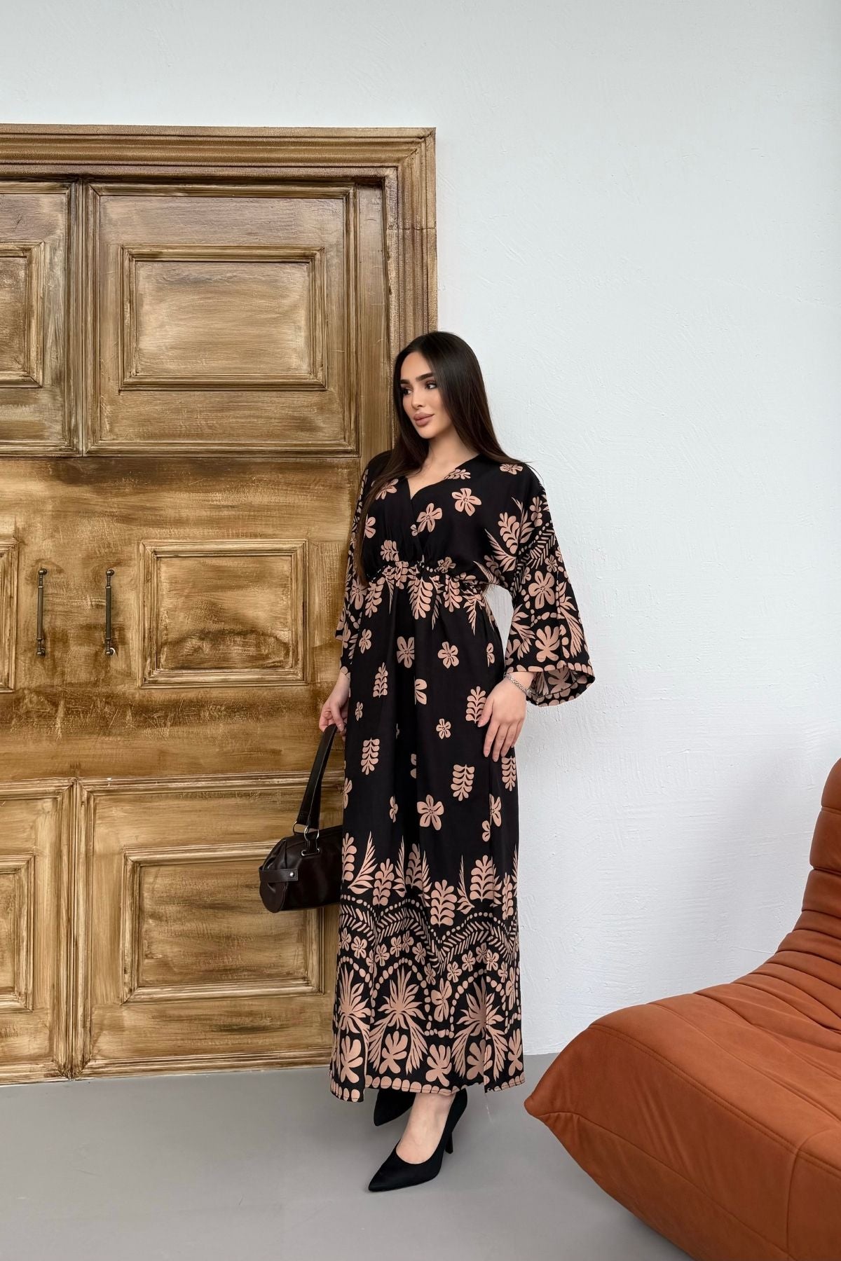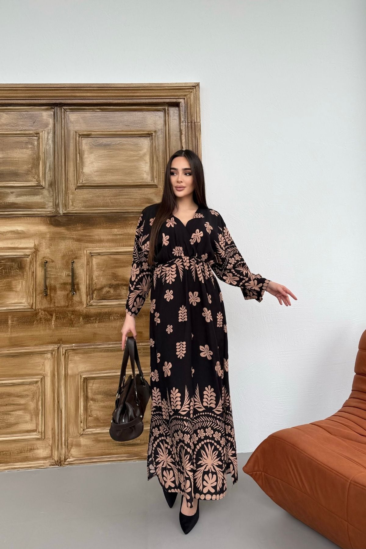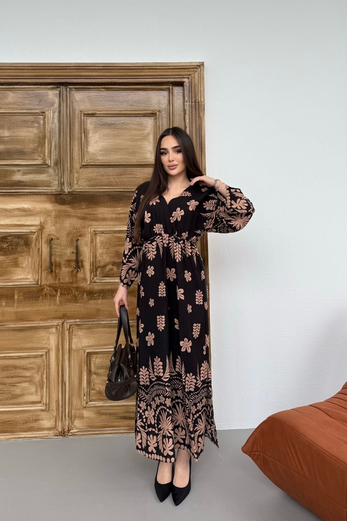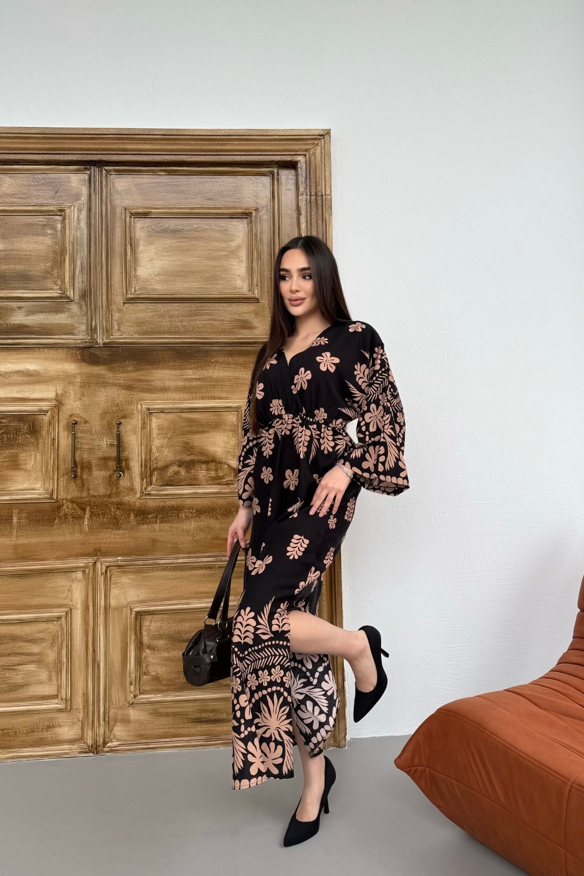 Çiçek Desenli Siyah Uzun Kollu Elbise