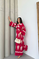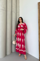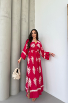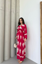 Etnik Desenli Viskon Uzun Kollu Fuşya Elbise