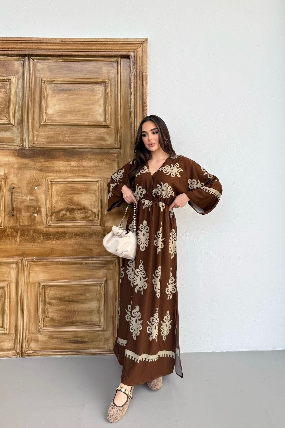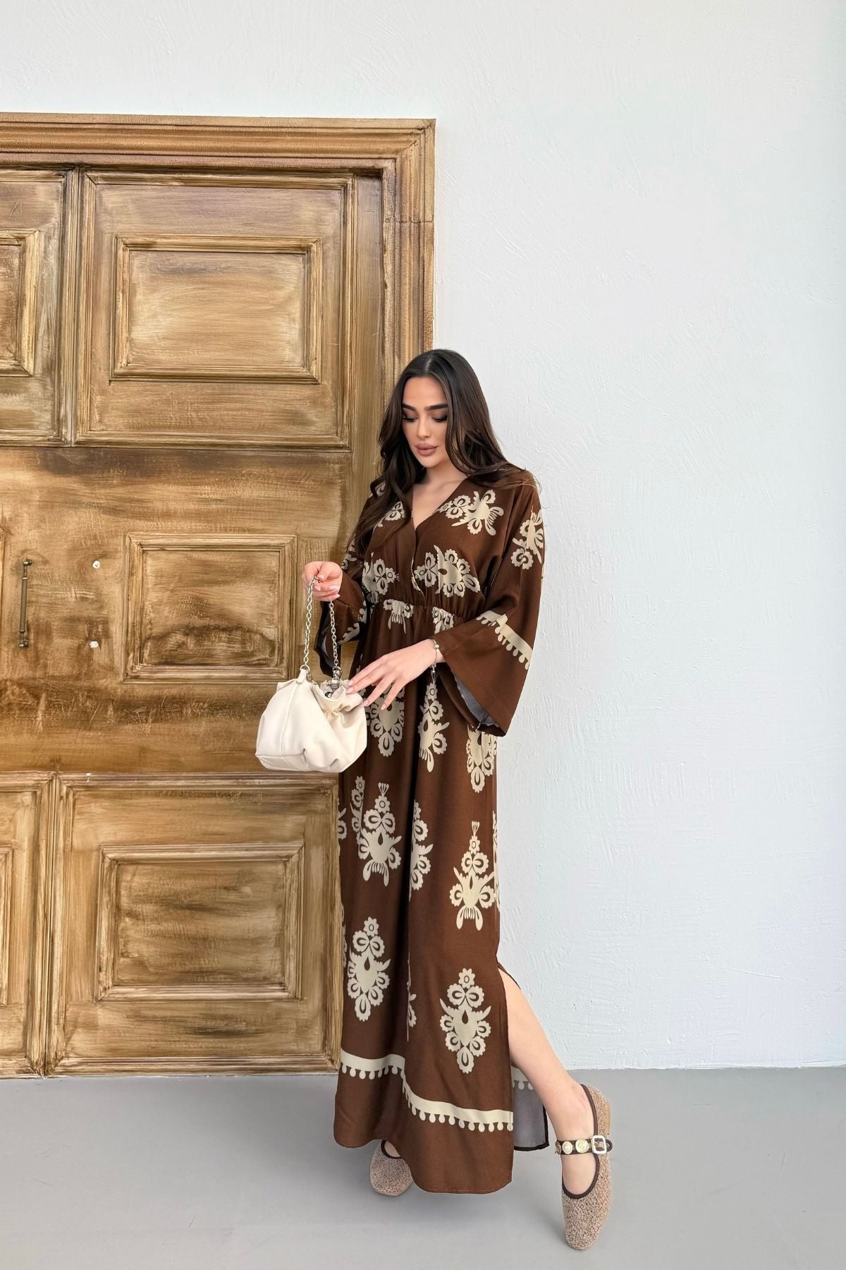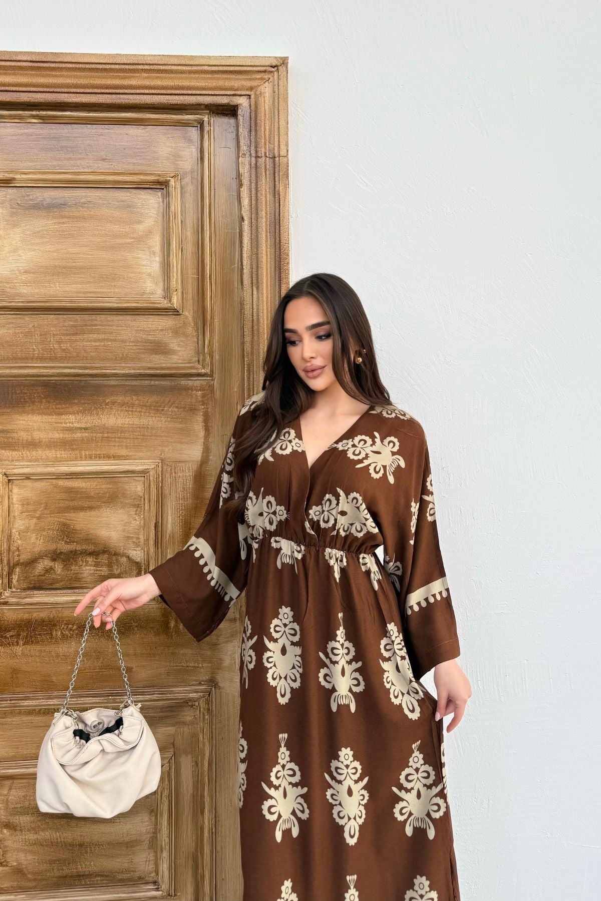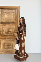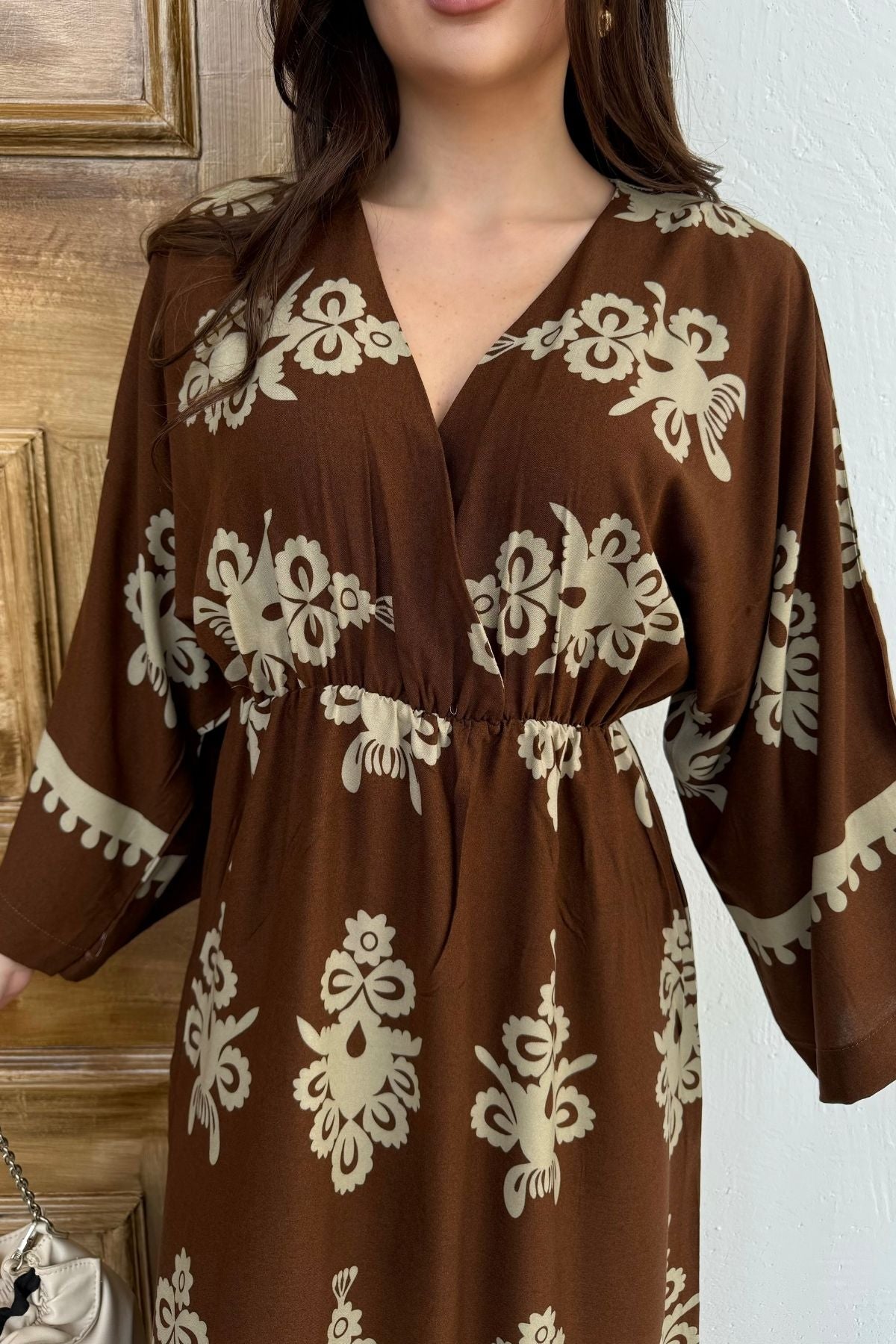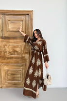 Etnik Desenli Viskon Uzun Kollu Kahverengi Elbise