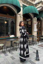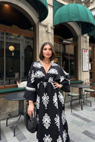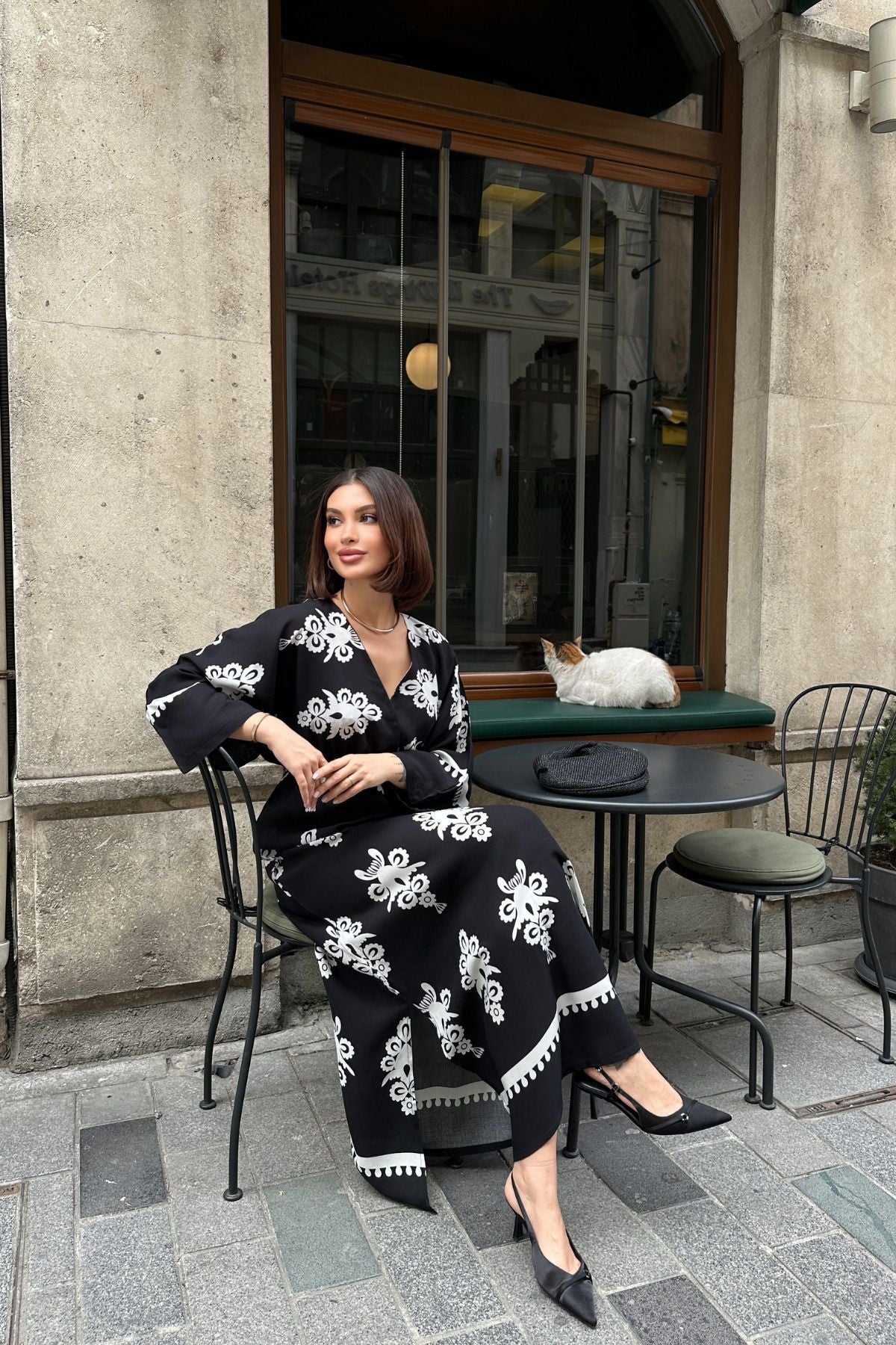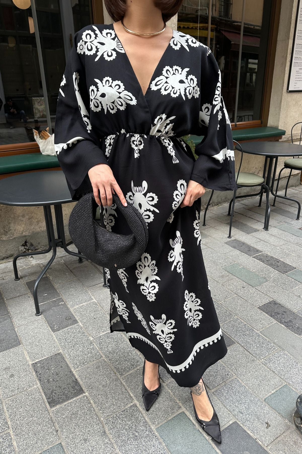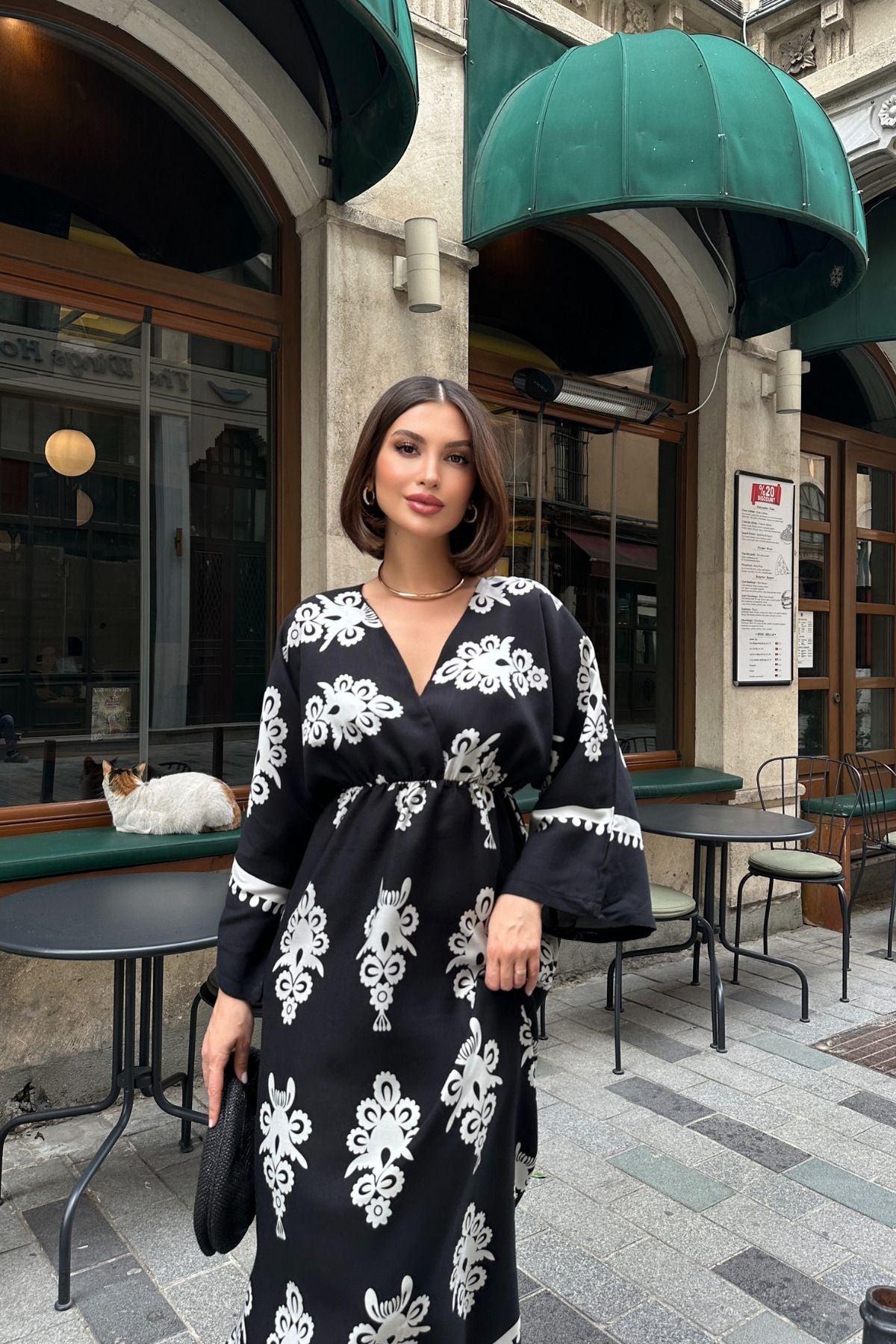 Etnik Desenli Viskon Uzun Kollu Siyah Elbise