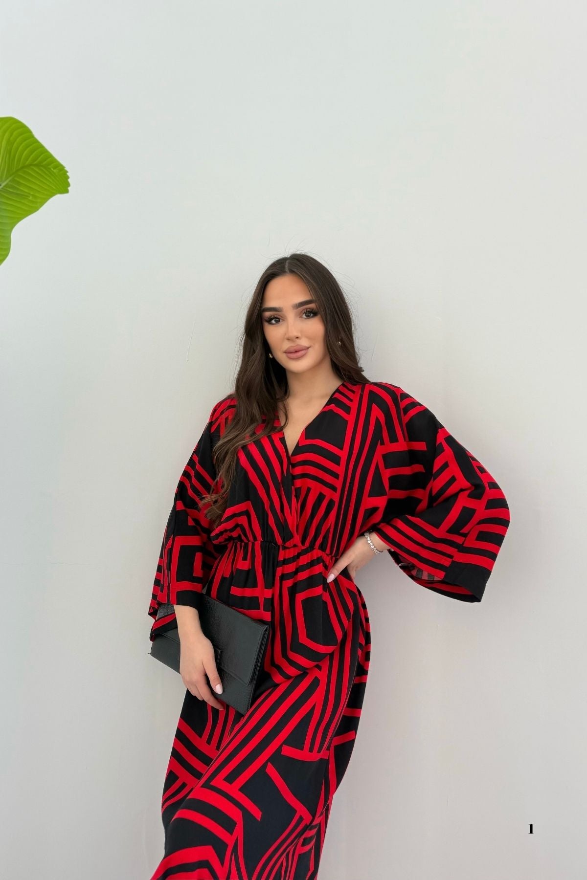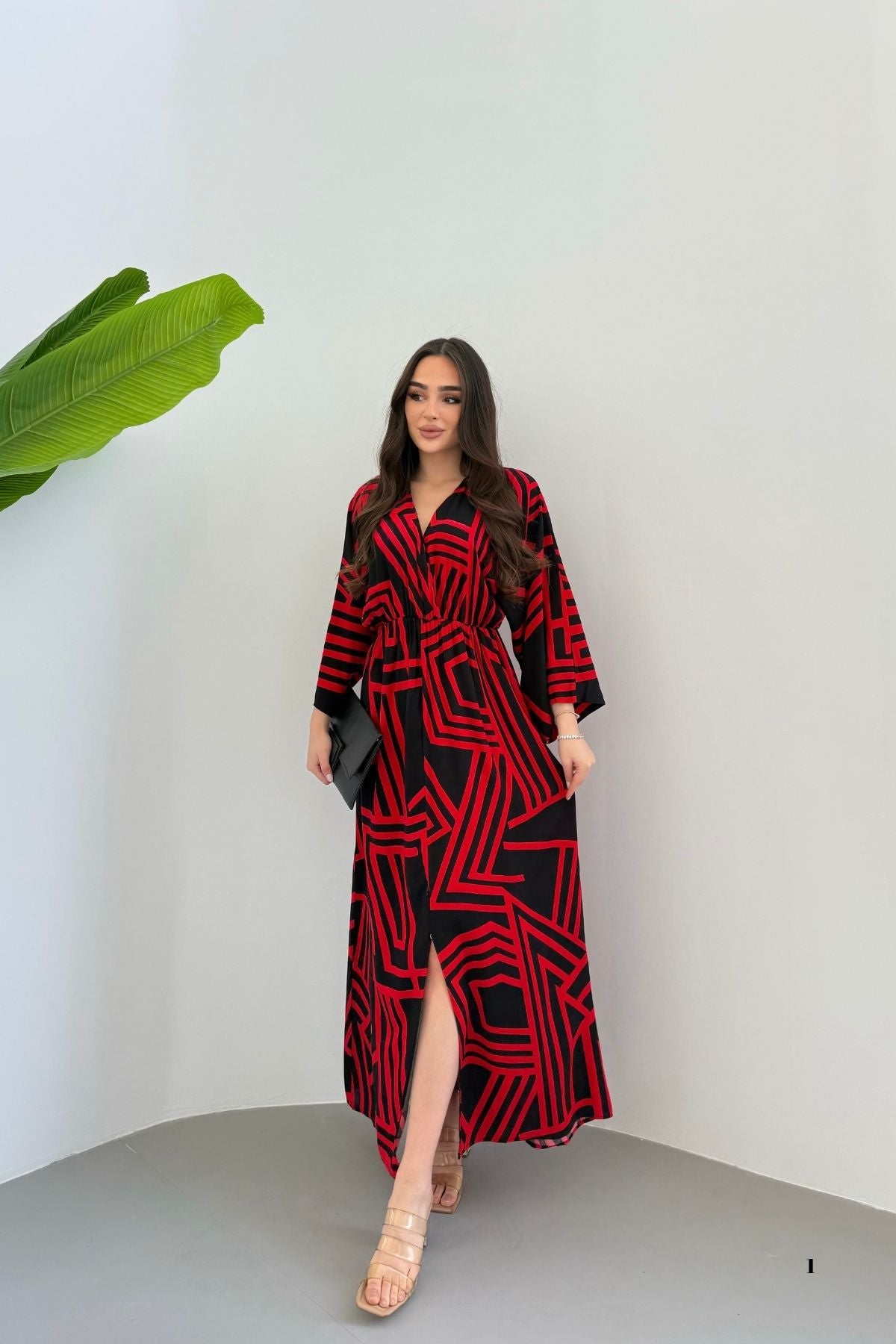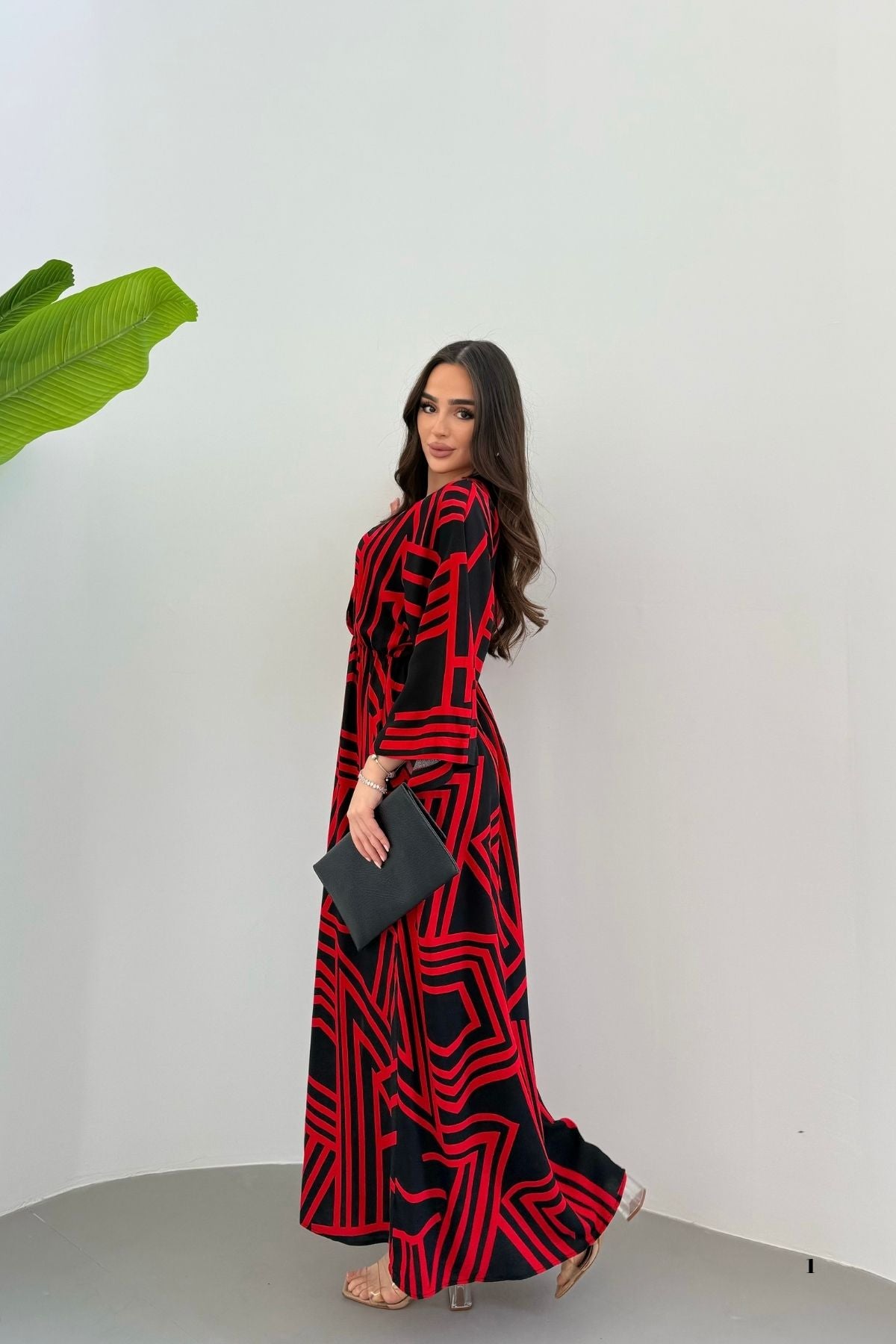 Kadın Kırmızı Geometri Desenli Beli Lastikli Uzun Yırtmaçlı Kruvaze Elbise