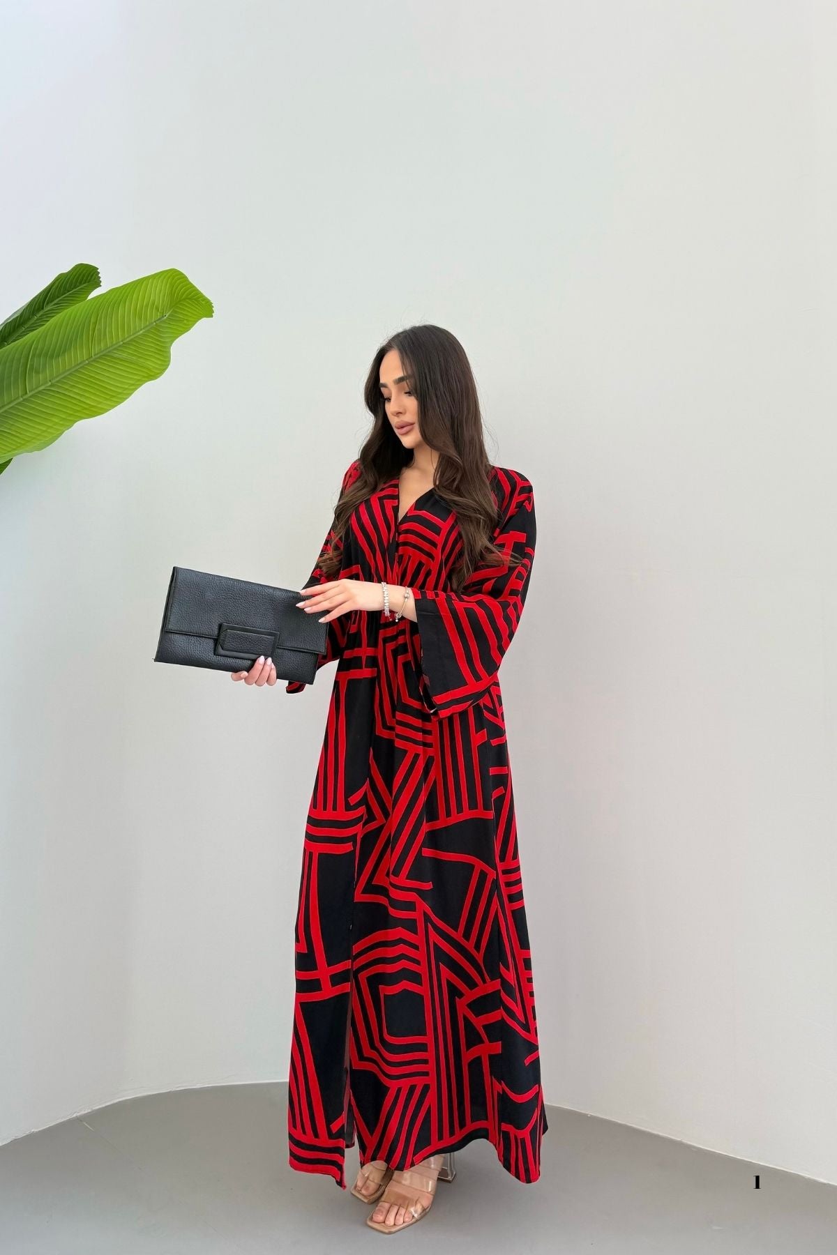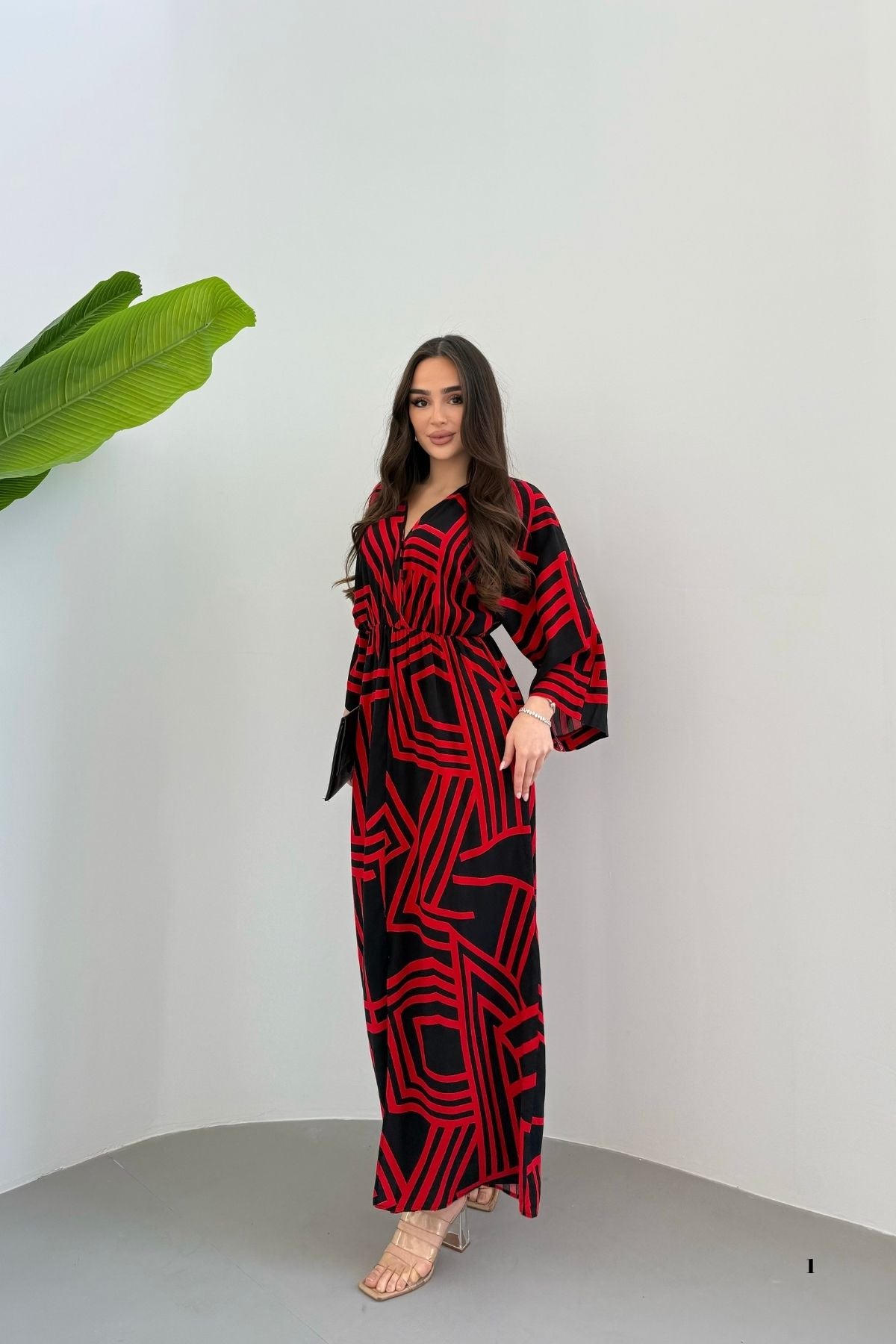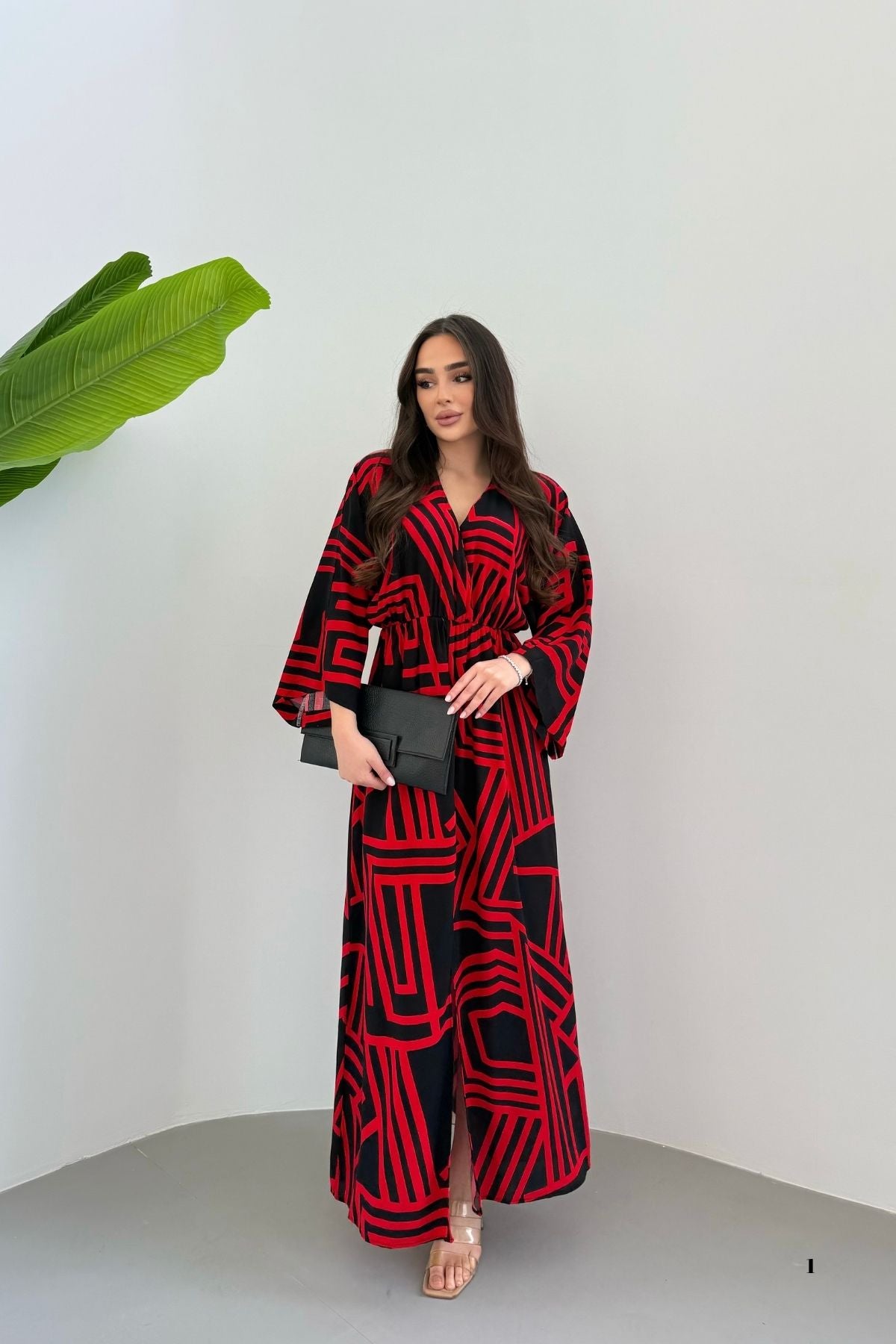 Kadın Kırmızı Geometri Desenli Beli Lastikli Uzun Yırtmaçlı Kruvaze Elbise