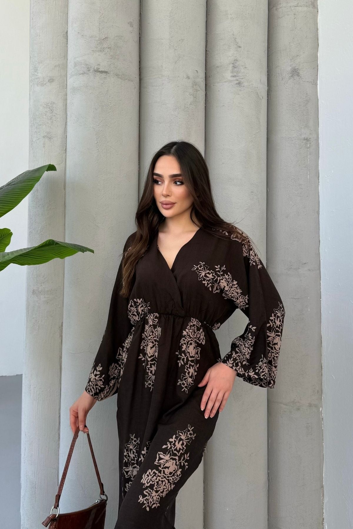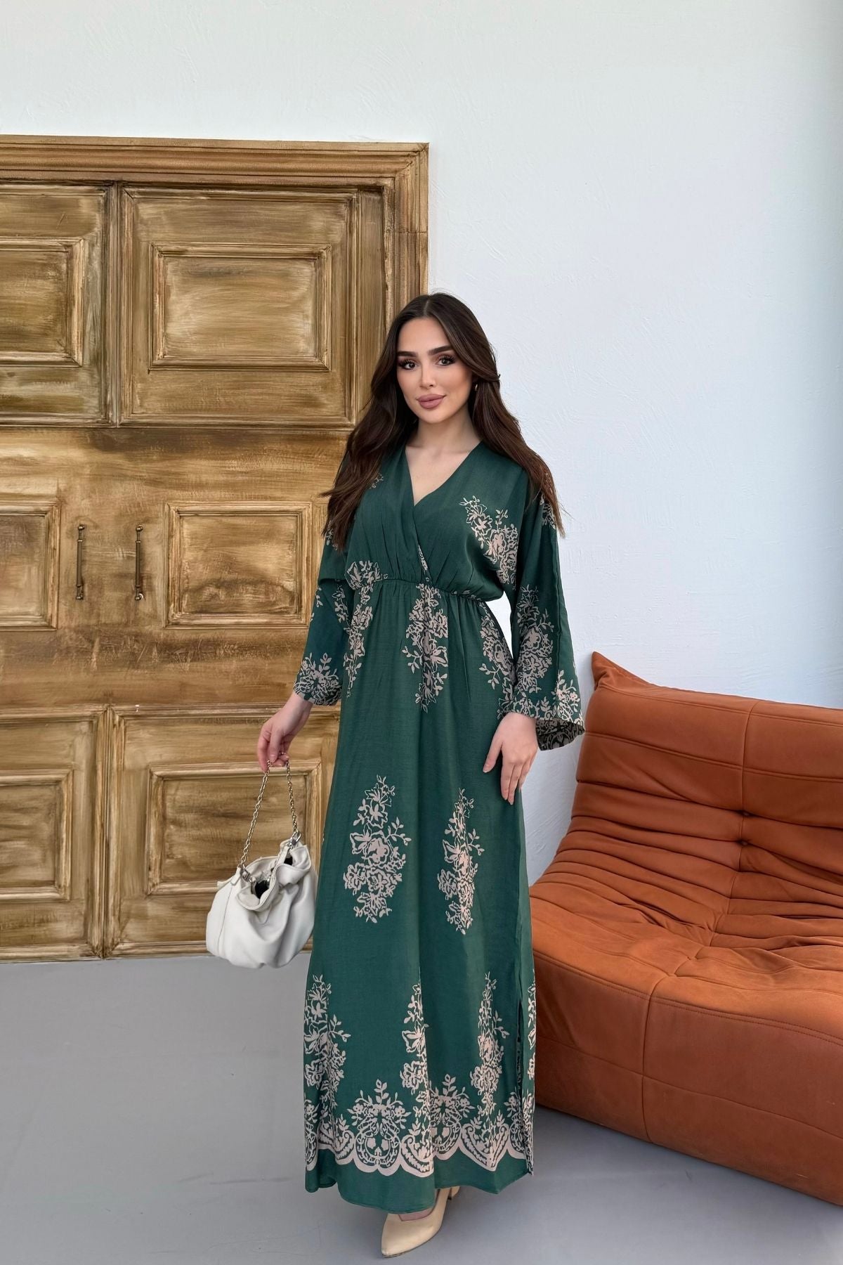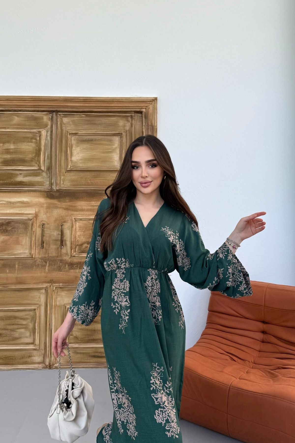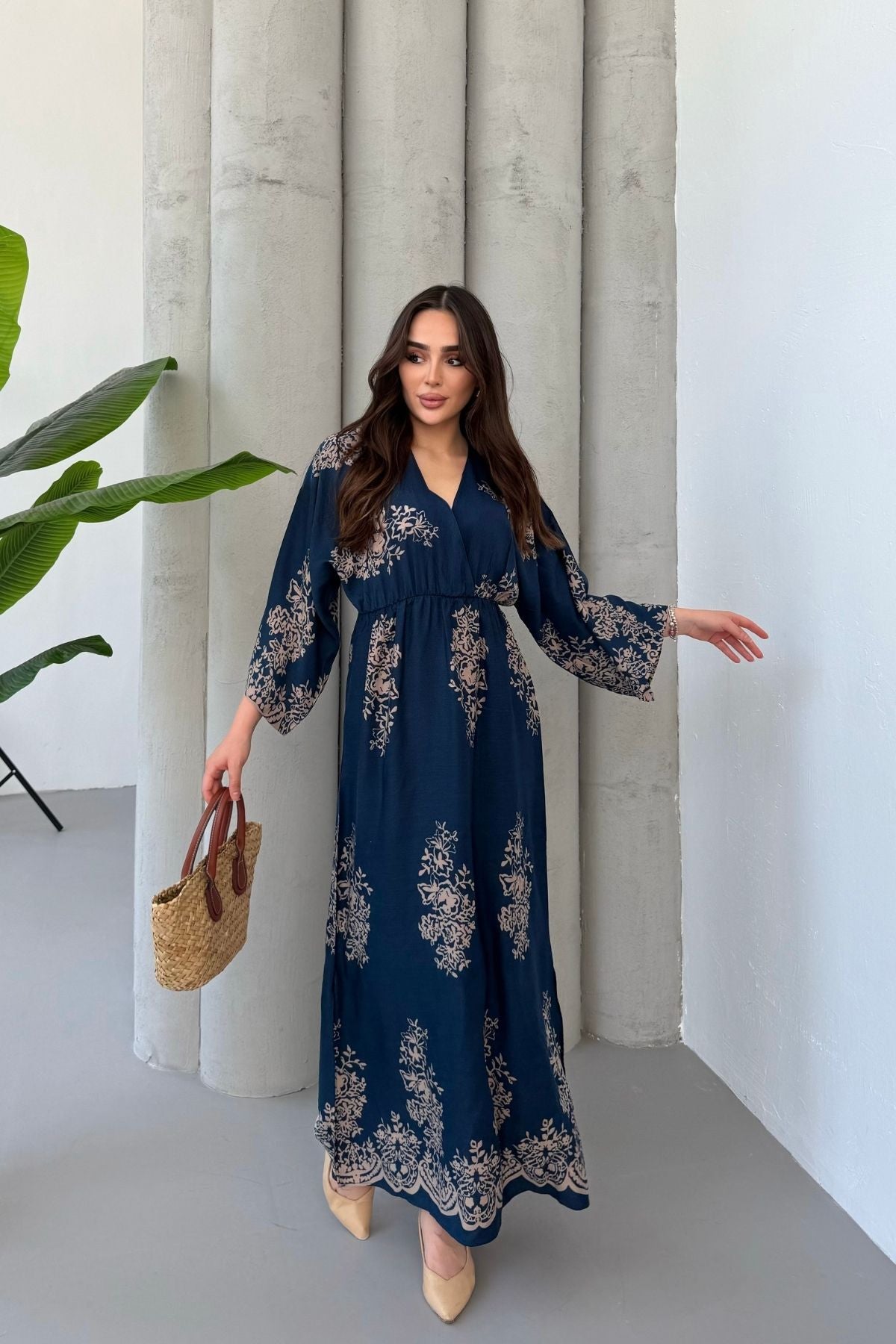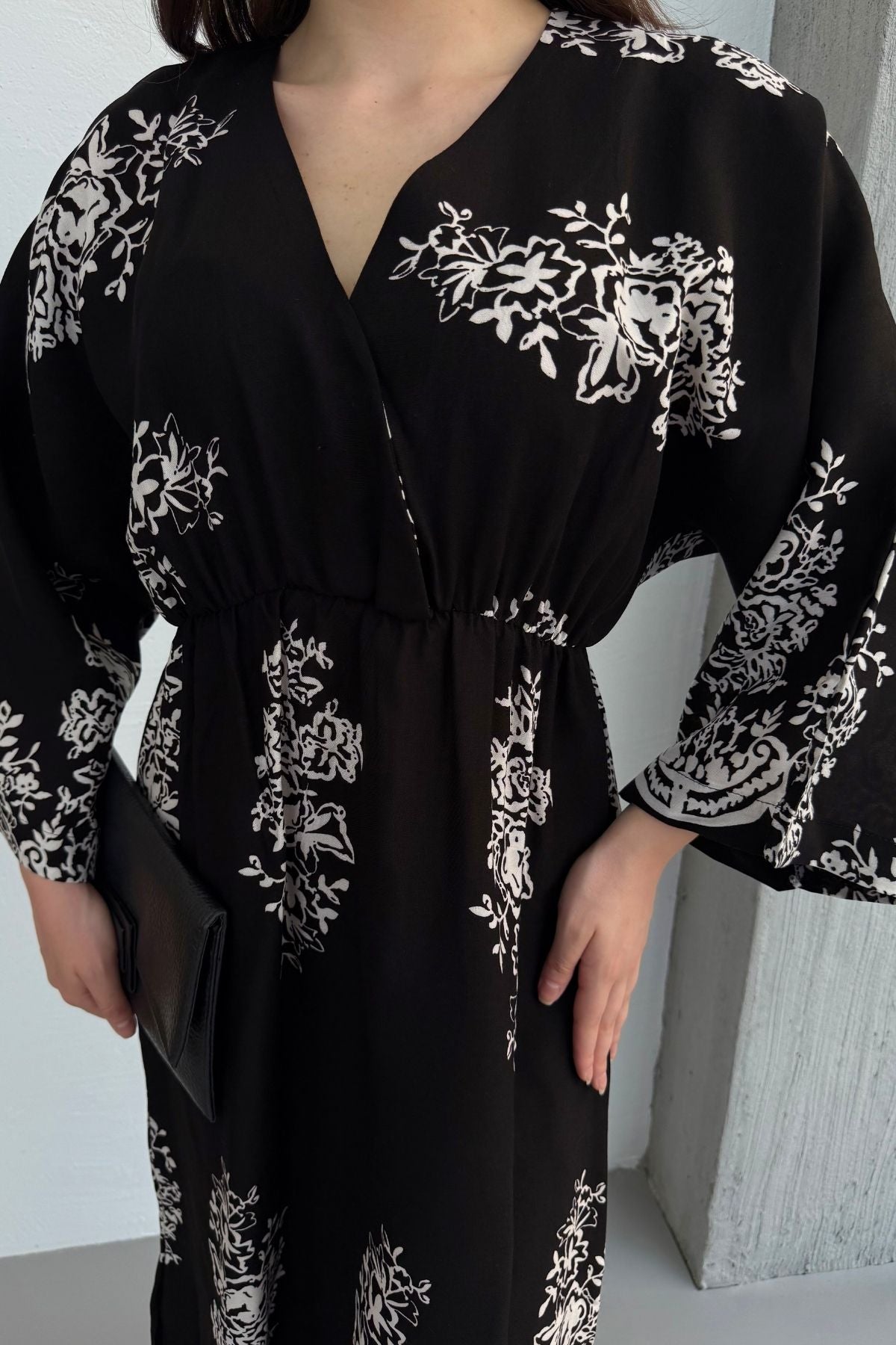 Uzun Kollu Kruvaze Yaka Desenli Kadın Elbise